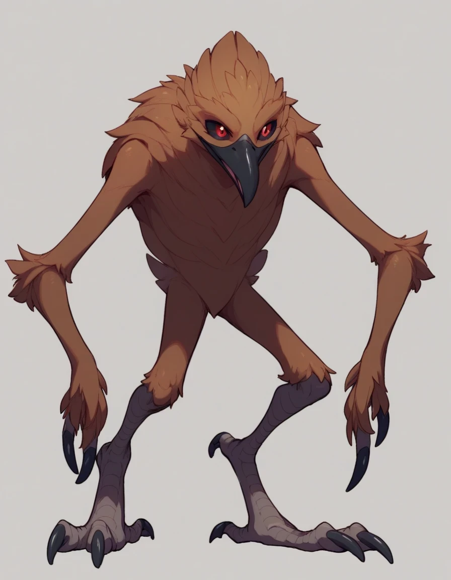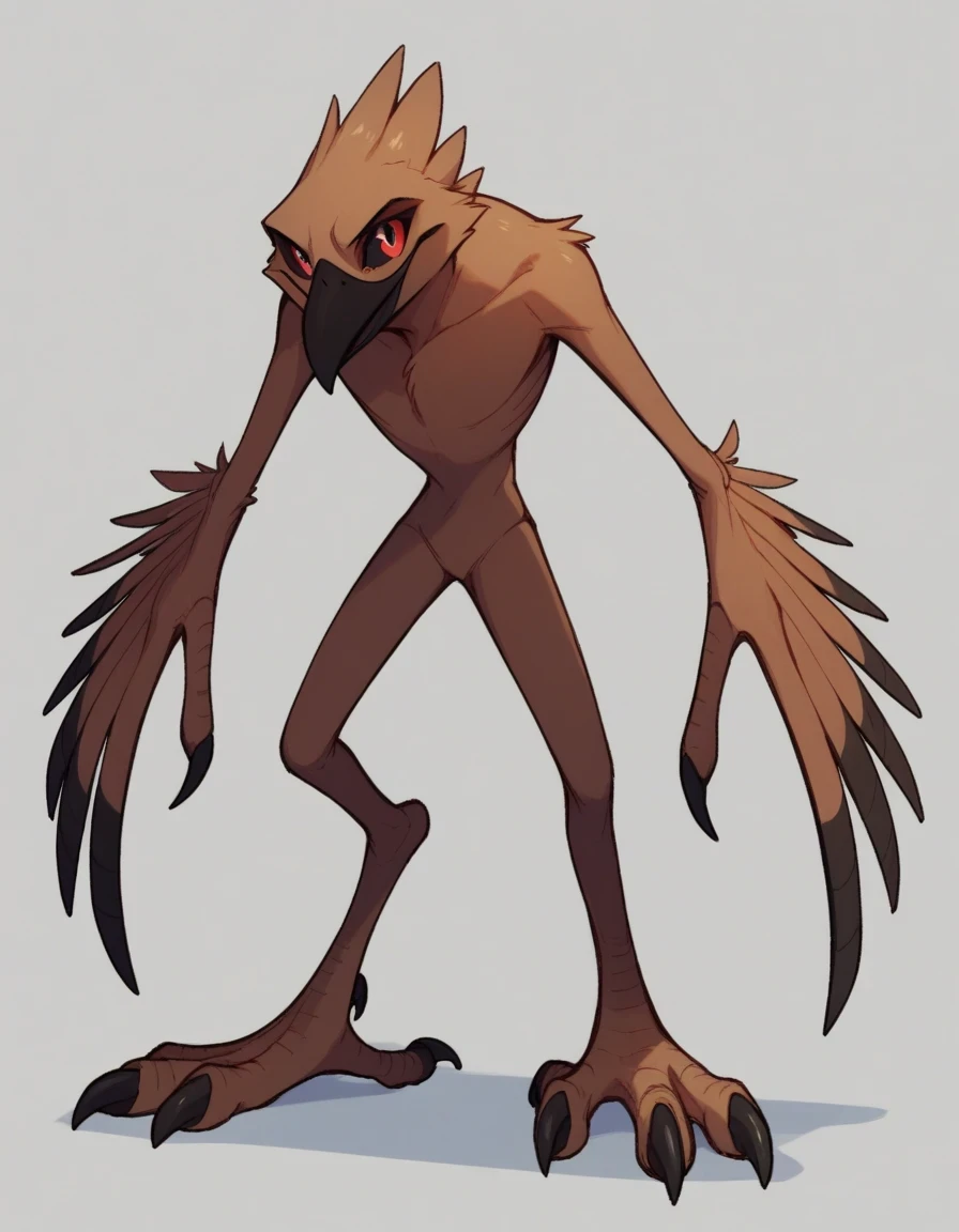 GriatosEXE, standing, claws, monster, dark menacing figure, elongated limbs and sharp features, prominent claws, seek and somewhat skeletal body, beak, brown skin, humanoid, no feathers, red eyes, black sclera, colored sclera, hollow eye, slim and angular, brown beak