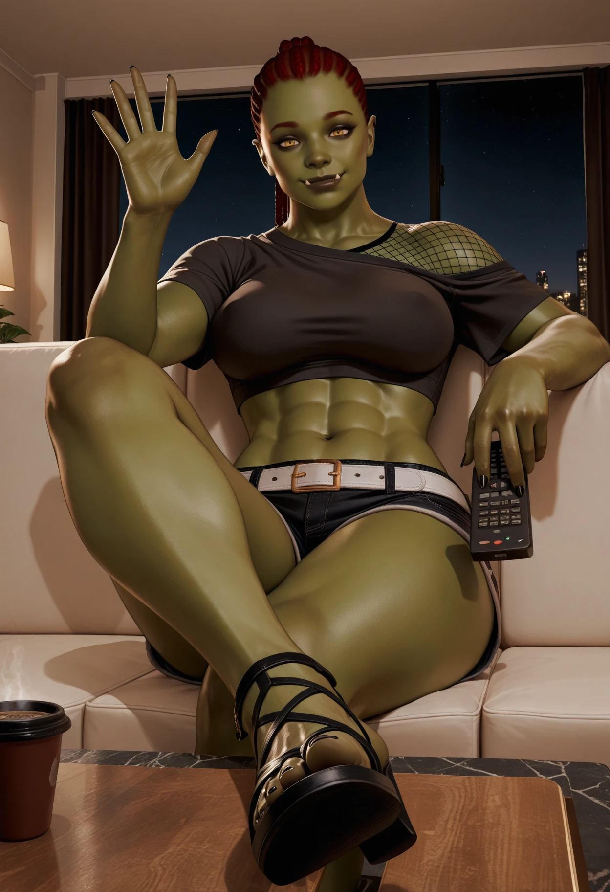 yonaahitr, 1girl, solo, green skin, colored skin, dark skin, yellow eyes, dark lips, pointy ears, red hair, ponytail, braids, long hair, orc girl, tusks, female orc, muscular female, hair beads, black nails,