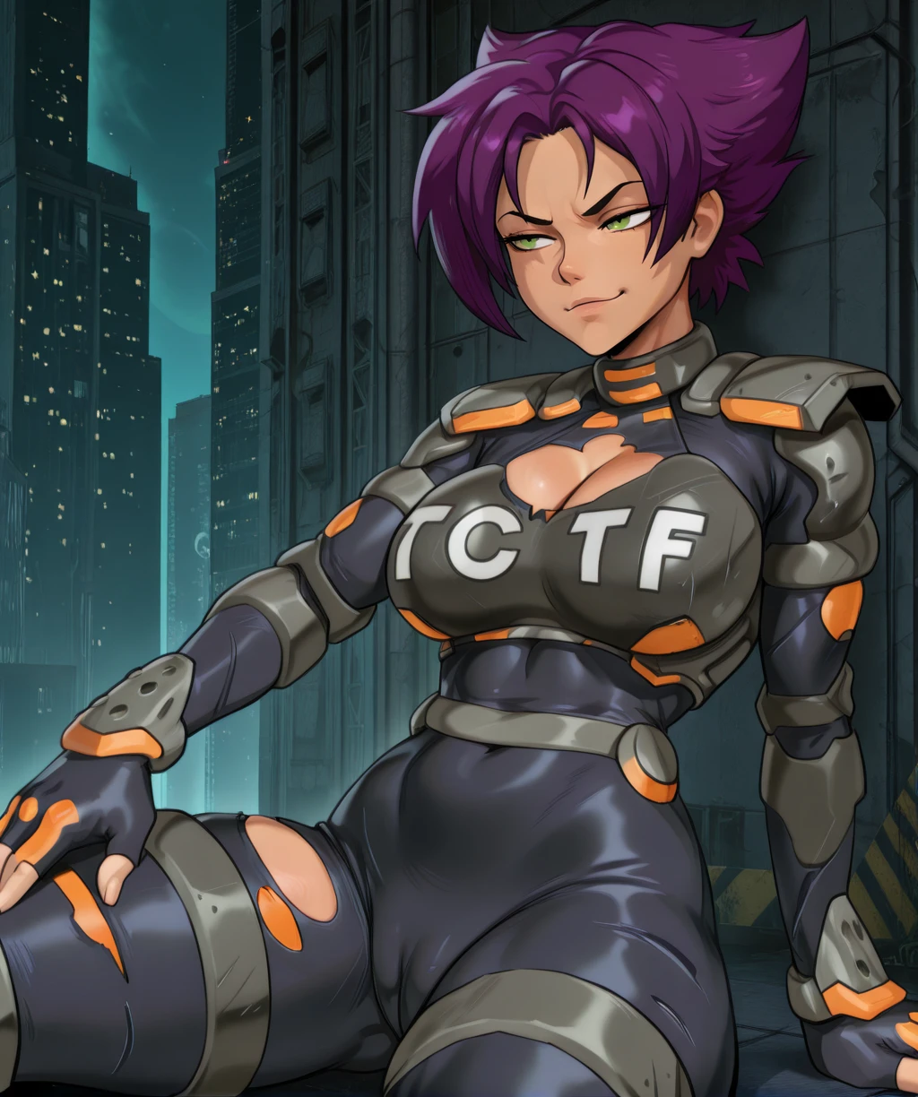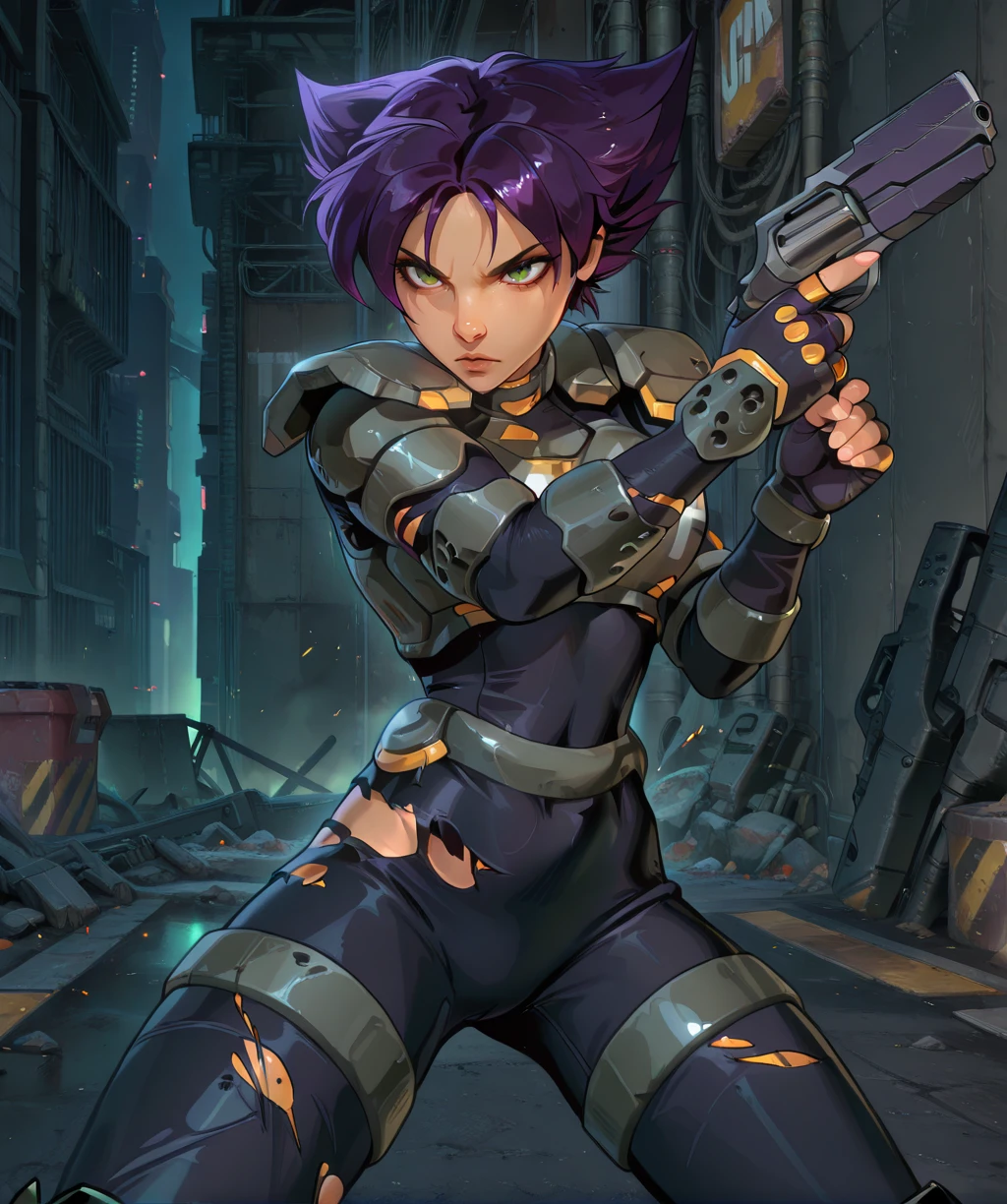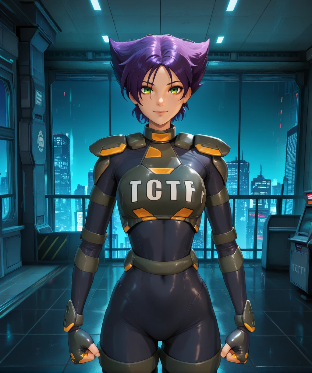 can try - spiked hairstyle, or purple hair with bangs, or sharp hairstyle, - to try and get accurate hairstyle but it may add spikes to armor, can add - spiky armor, spikes, in neg if so