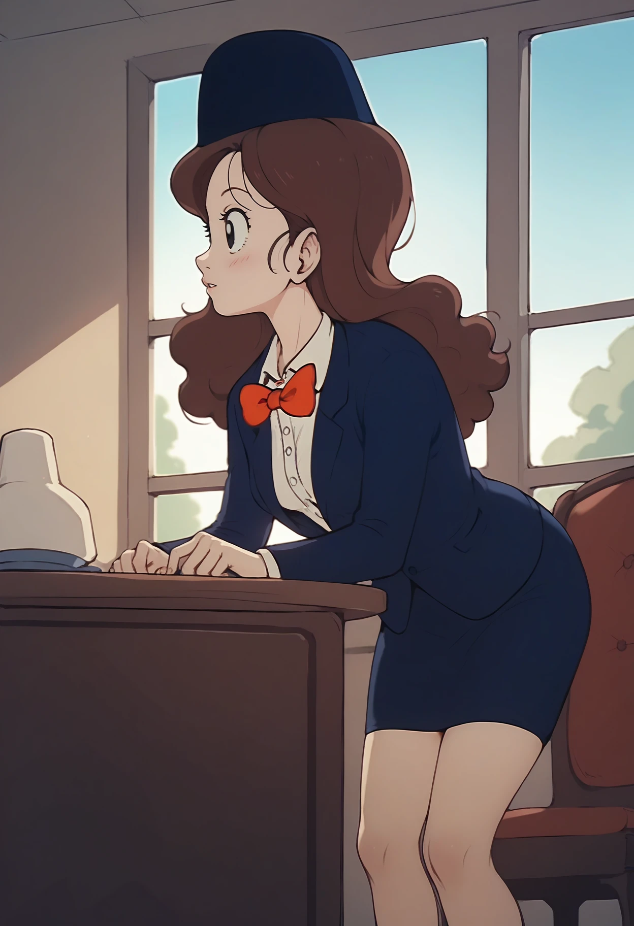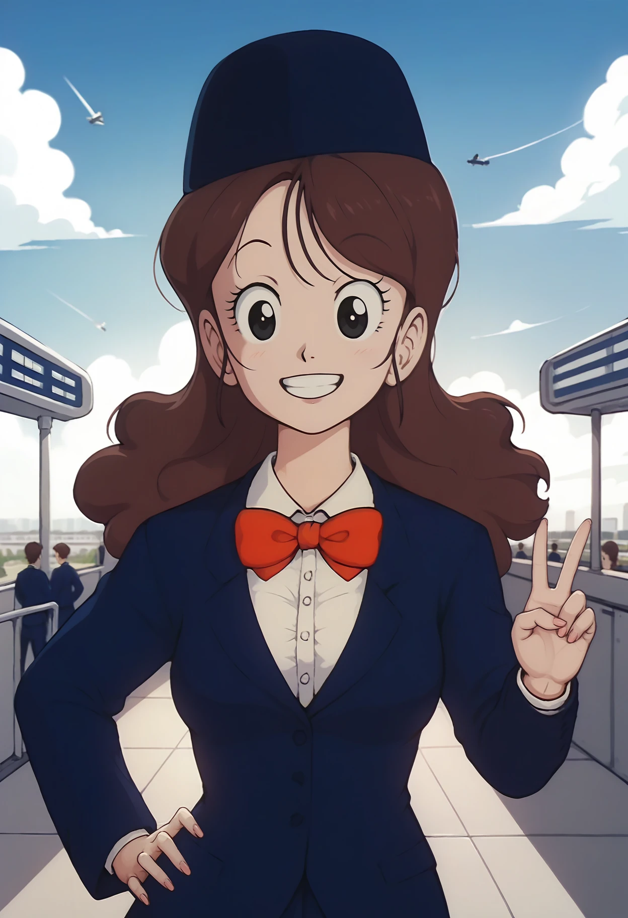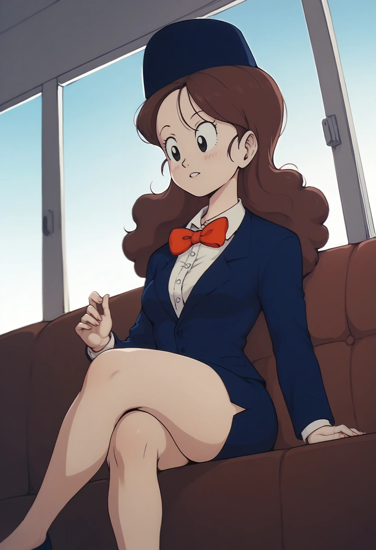 attendant hat, blue jacket, white collared shirt, red bowtie, skirt, suit,