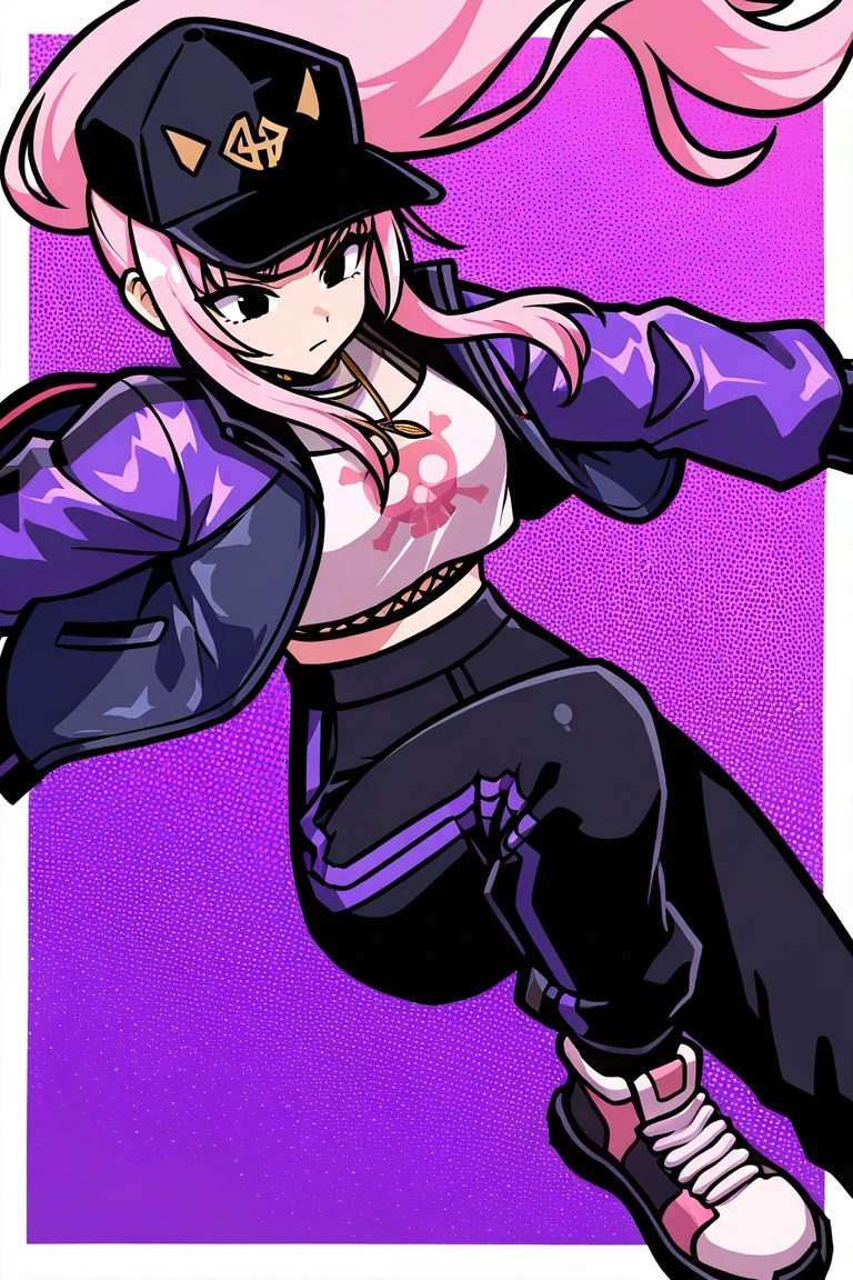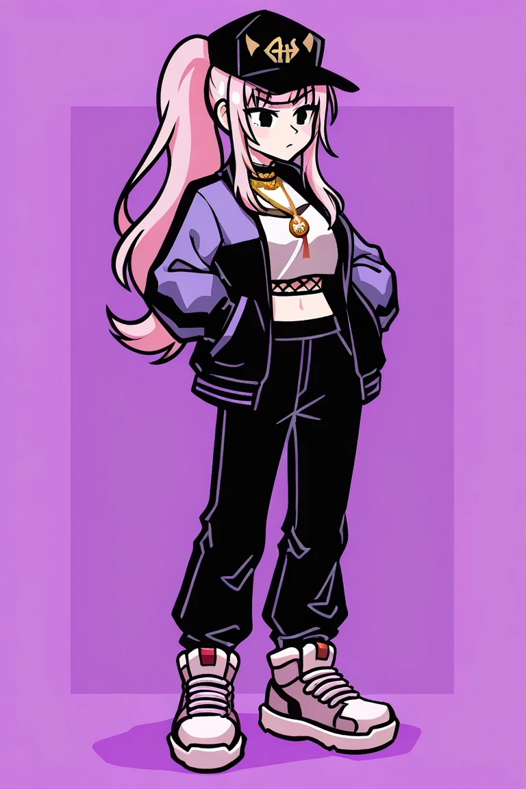 MoriCalliopeFNFHF, 1girl, long pastel pink hair in a ponytail, black eyes, black cap, white crop top. fishnet shirt, golden keychain necklace, black-magenta jacket, black pants, white-magenta sneakers, mori calliope
