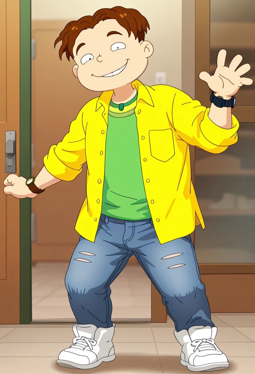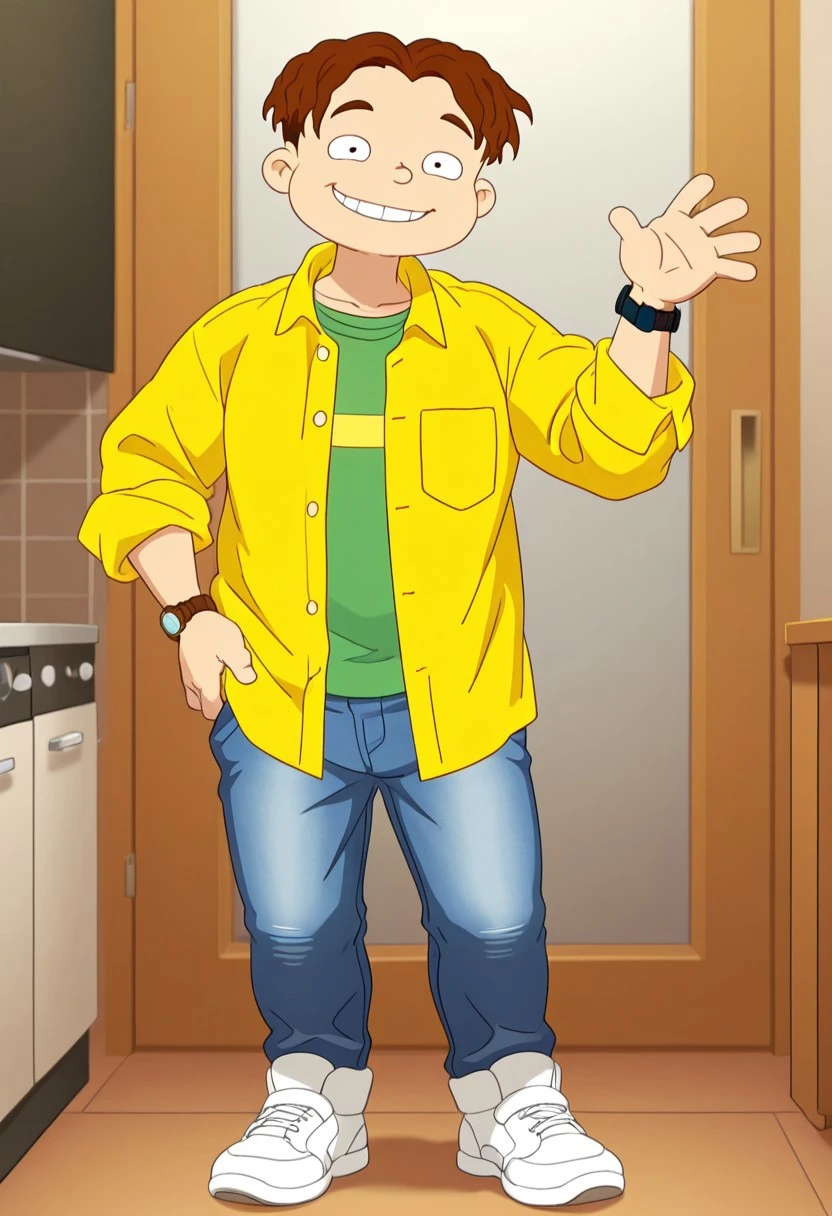Season 2 alt: Phil DeVille S2, Solo, 1boy, brown hair, unbuttoned yellow dress shirt, green undershirt, wristwatch, blue jeans, white shoes