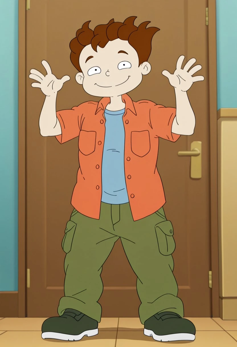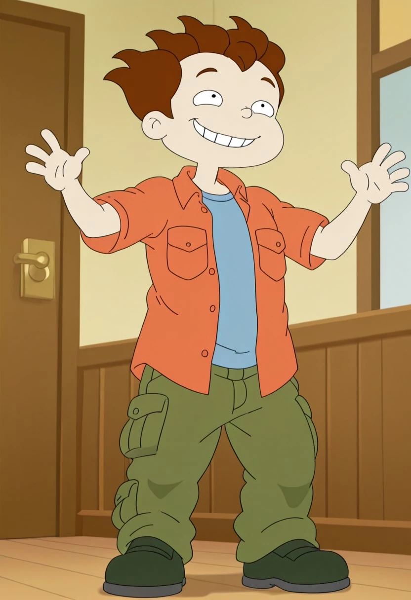 Season 1 style: Phil DeVille S1, solo, 1boy, brown hair, orange dress shirt , blue undershirt, green cargo pants, black shoes