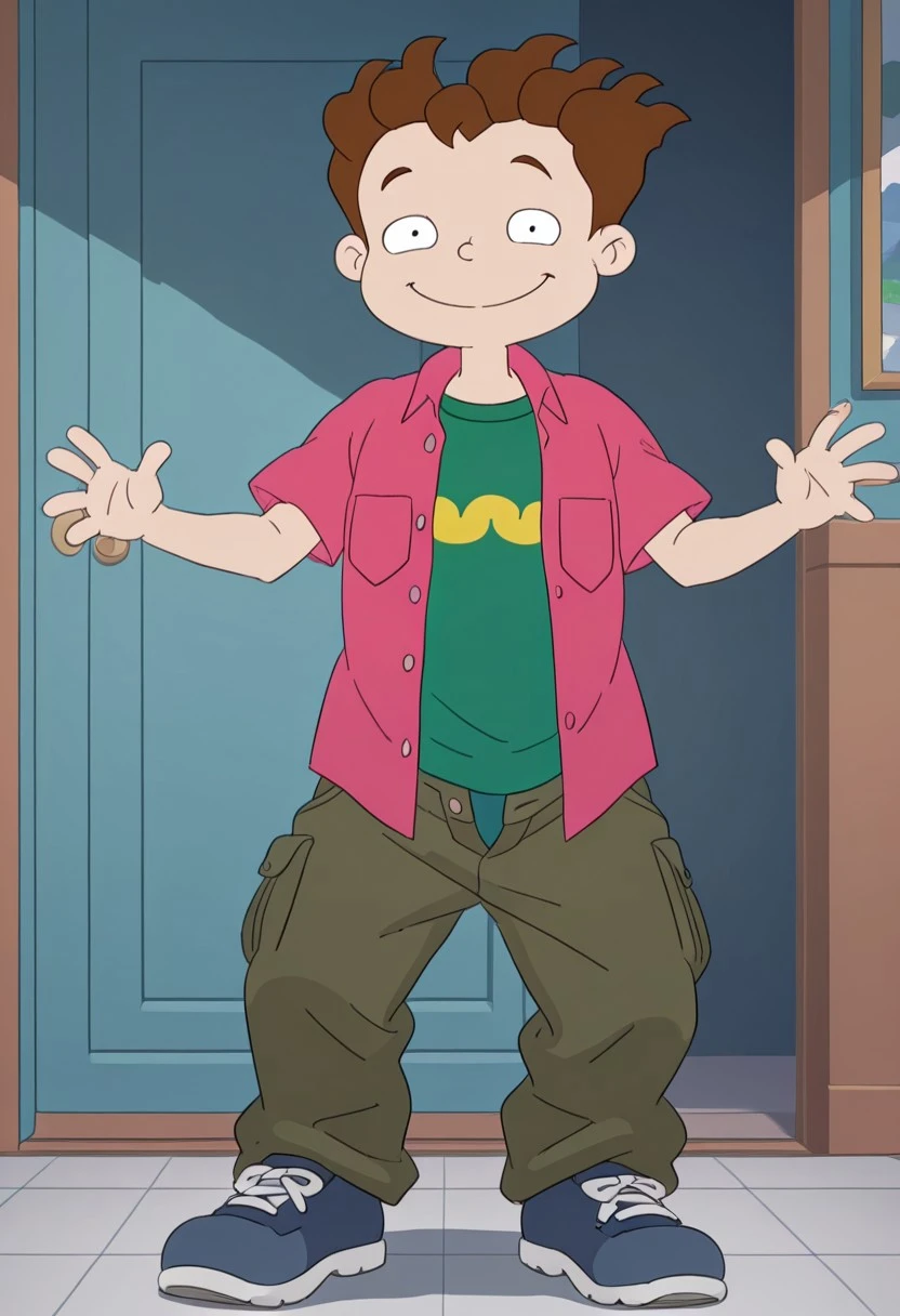 Special: Phil DeVille S0, solo, 1boy, brown hair, black eyes, unbuttoned pink short sleeved dress shirt, green undershirt, dark green cargo pants, blue shoes