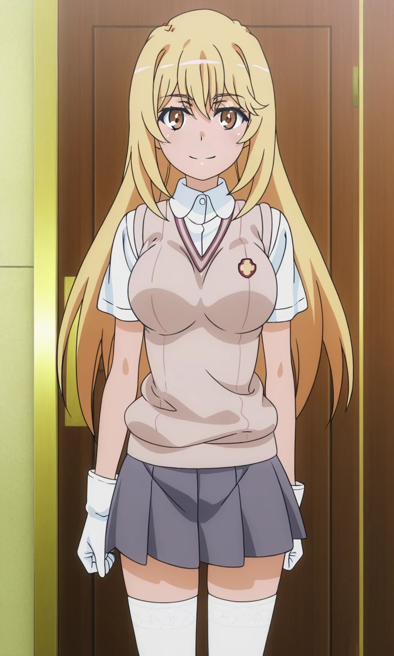 misaki shokuhou,1girl,solo, blonde hair,long hair,yellow eyes, school uniform,collared shirt,white shirt, short sleeves, summer uniform, sweater vest,white gloves,pleated skirt,grey skirt,nimiskirt,white thighhighs