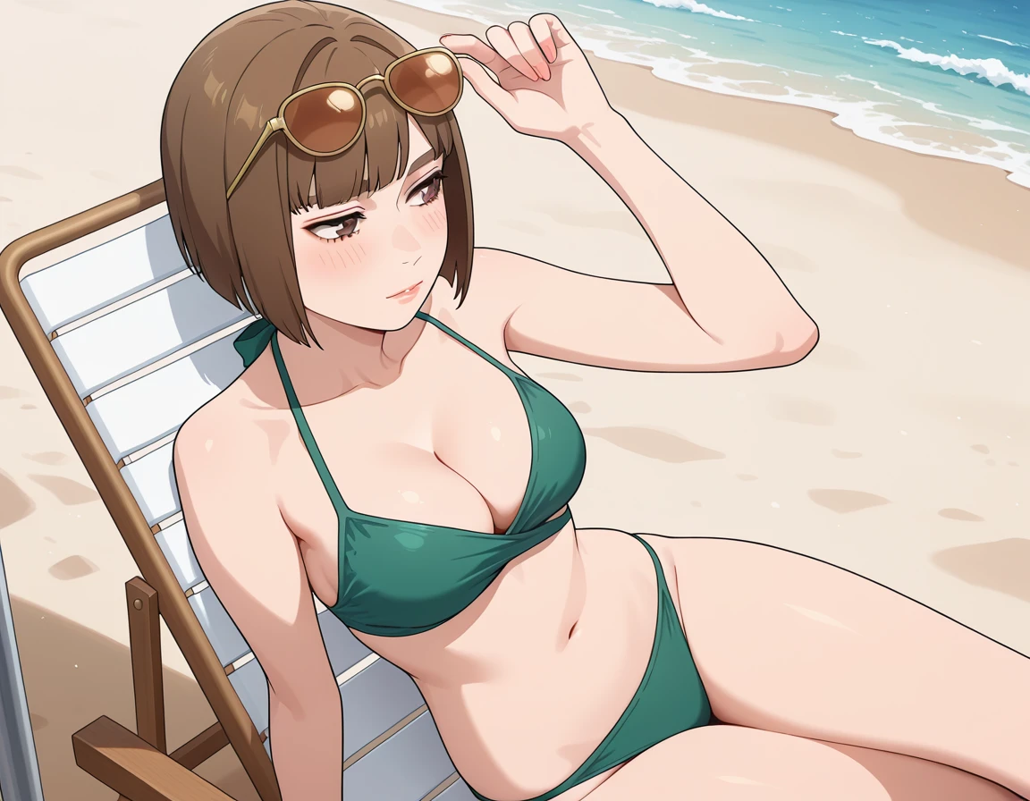 Beach: green bikini, eyewear on head, [this was a singular scene]