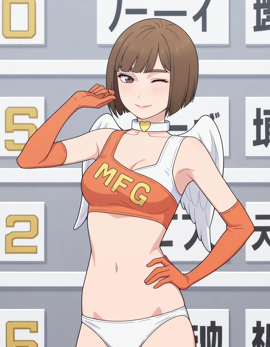 MF Angels: wing choker, mfg crop top, white bikini bottom, elbow gloves, boots,