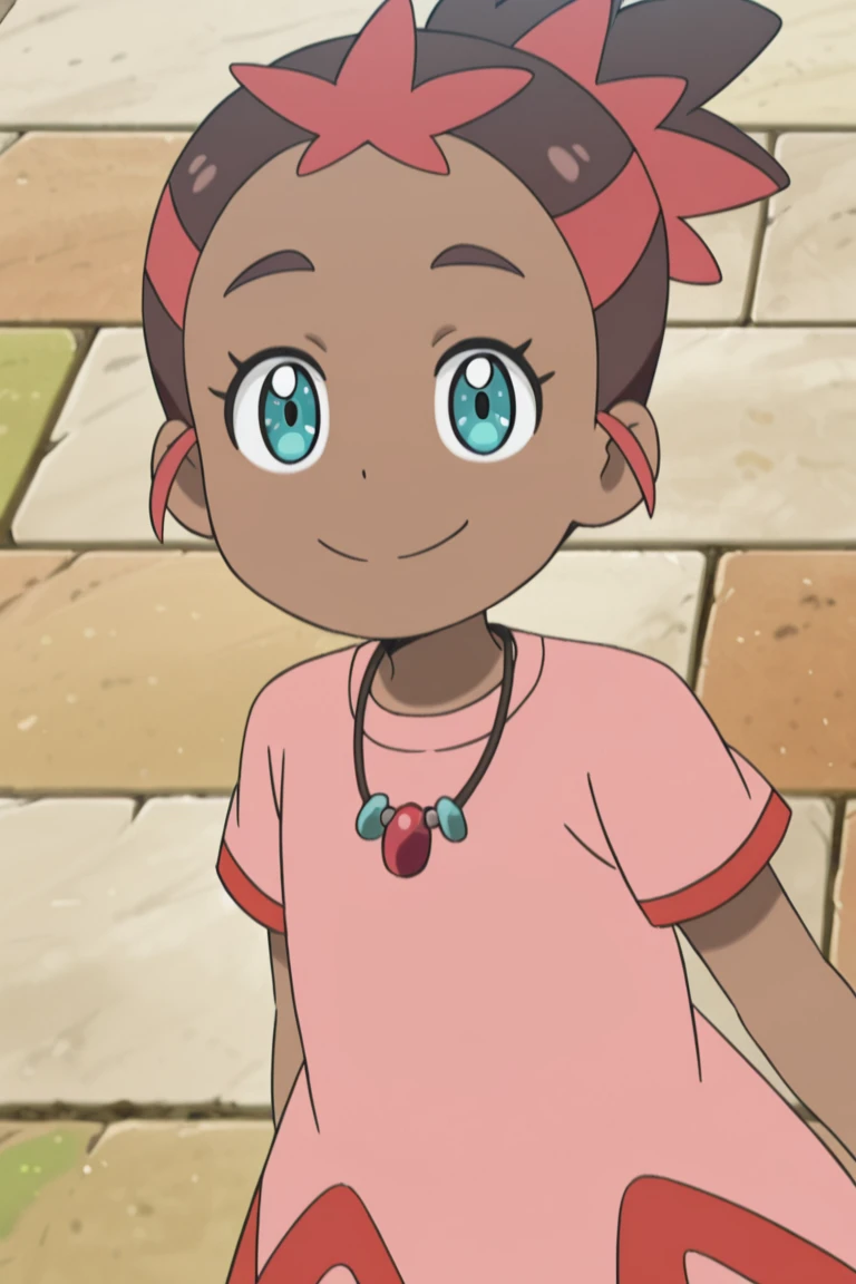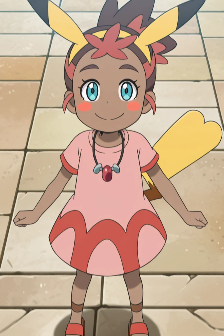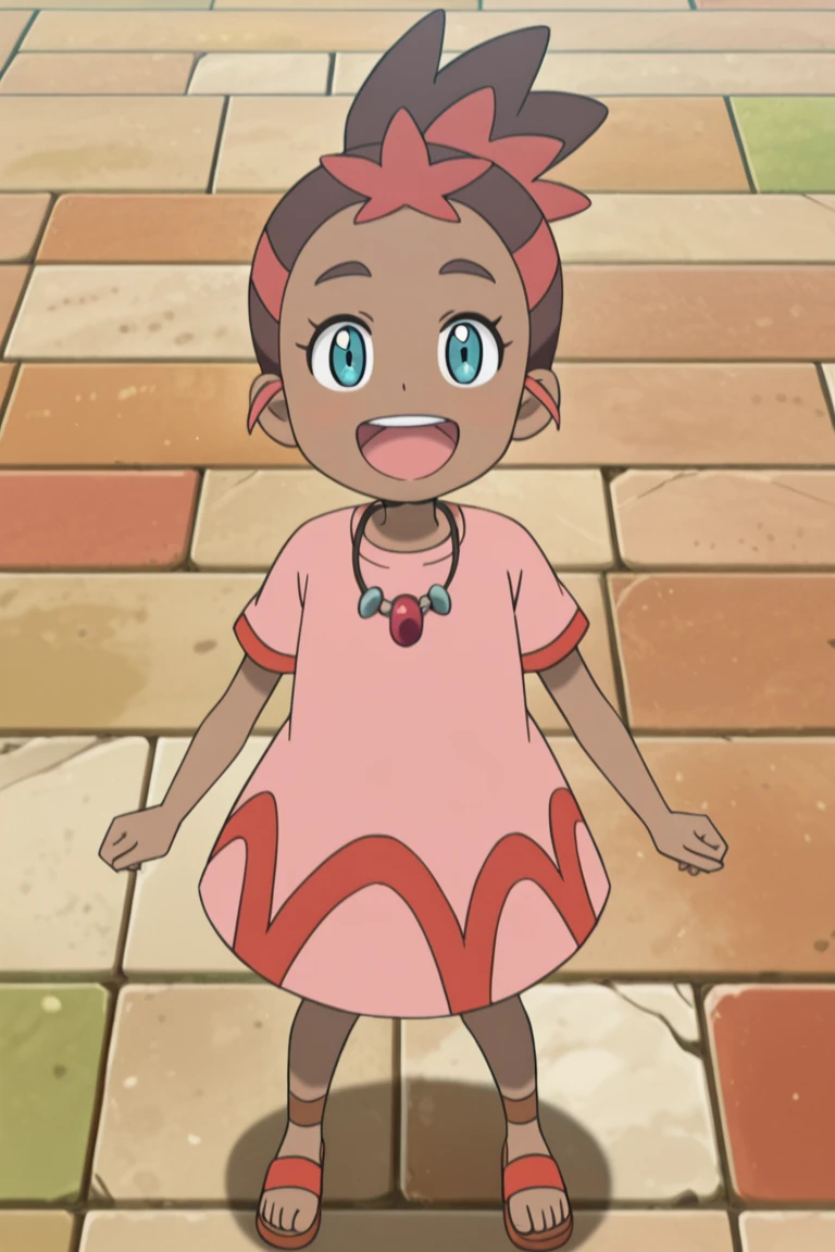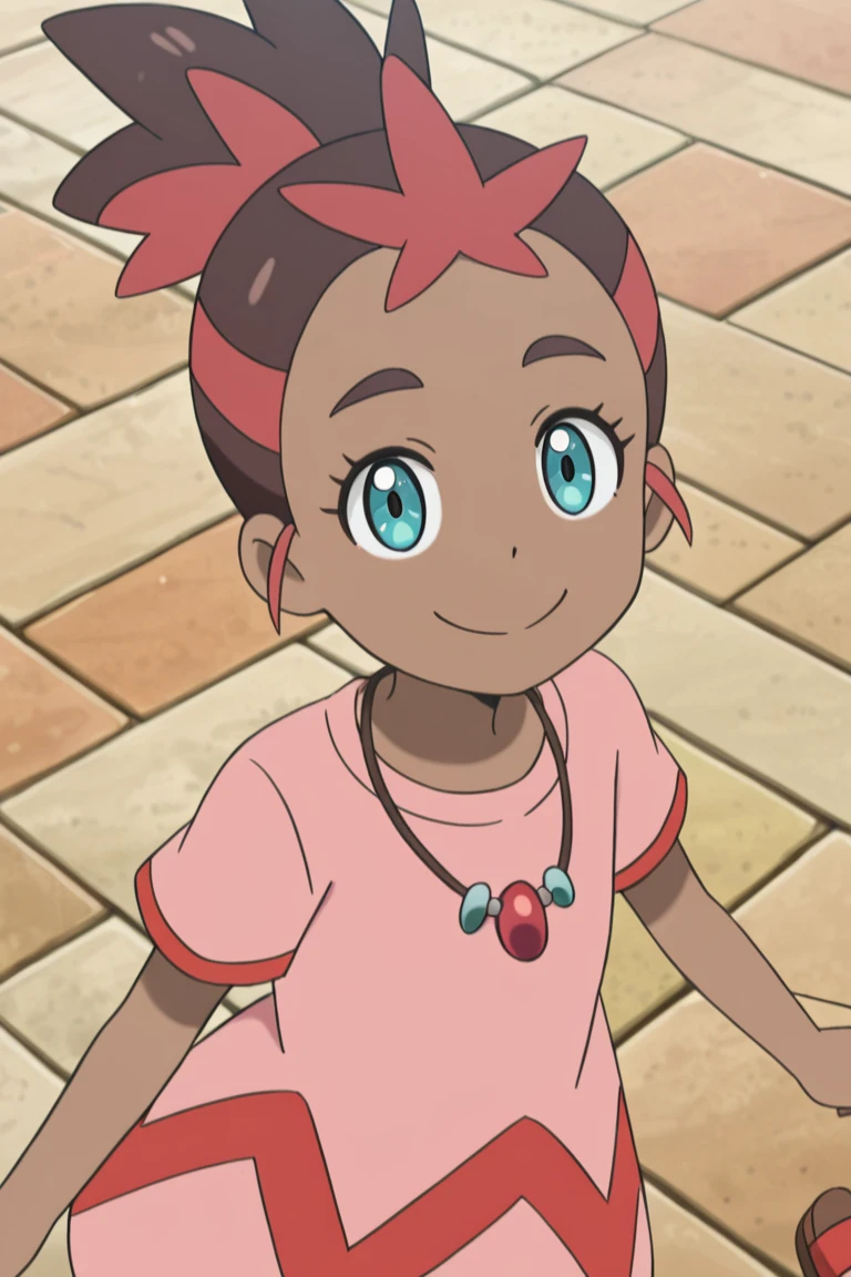 dark skin, dark-skinned female, short hair, two-tone hair, red and brown hair, spiky ponytail, aquamarine eyes, red pendant, pink dress, short sleeve, red wave designs dress, red sandals,