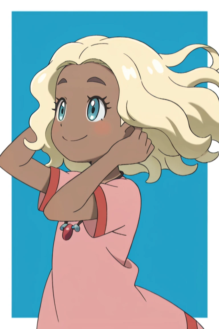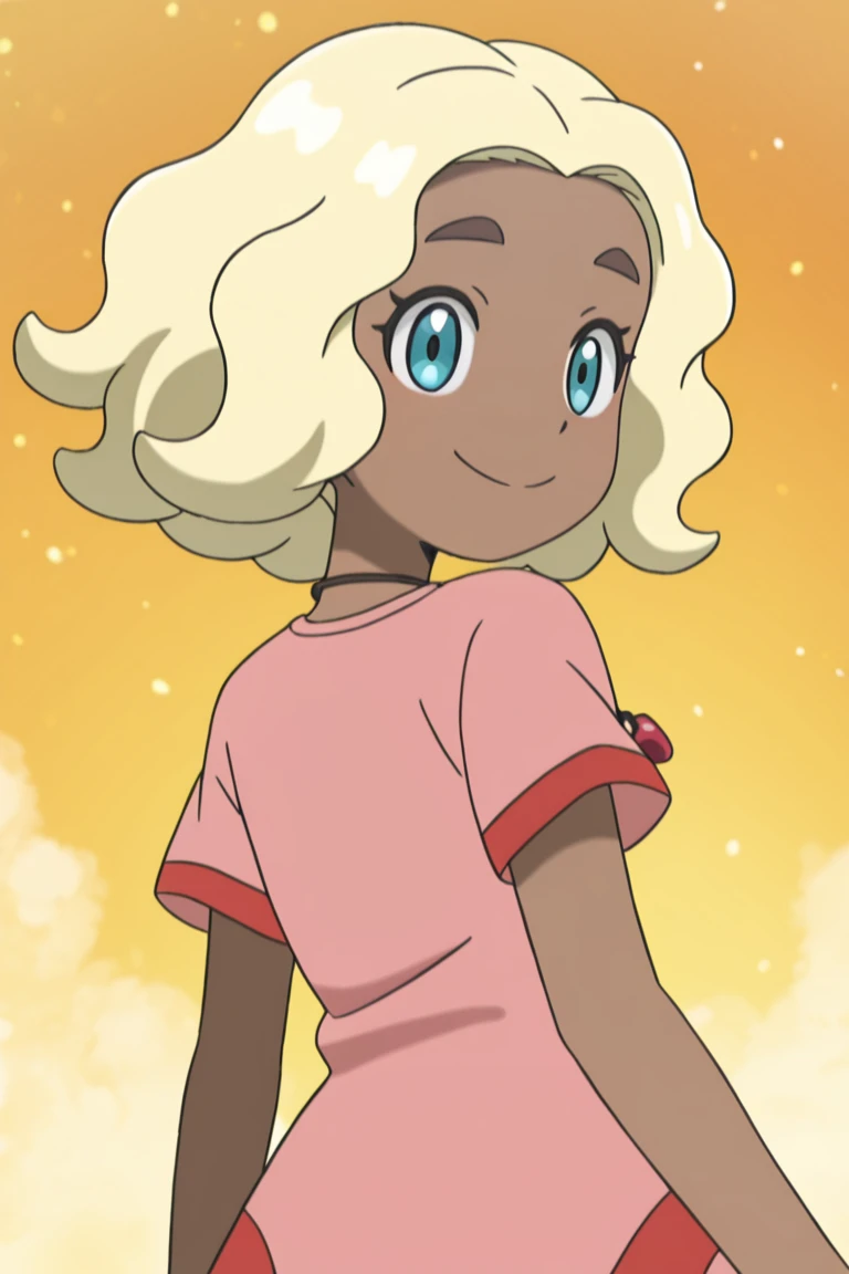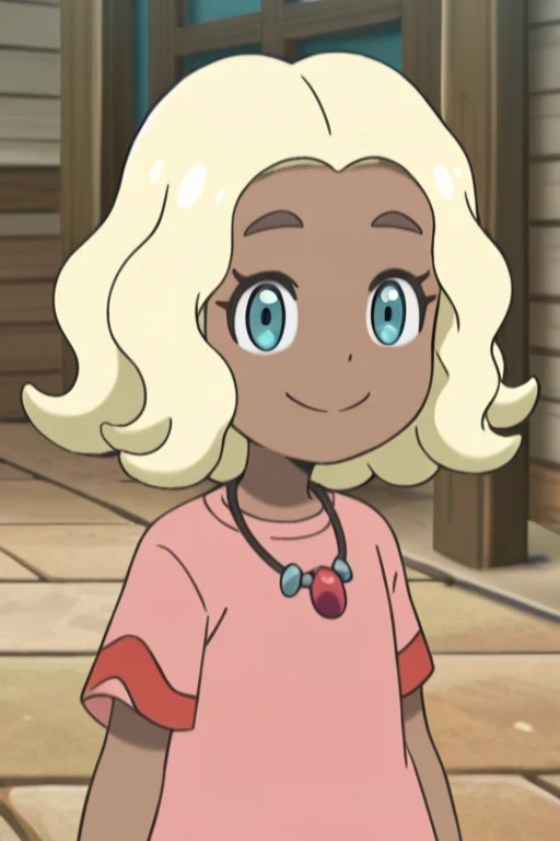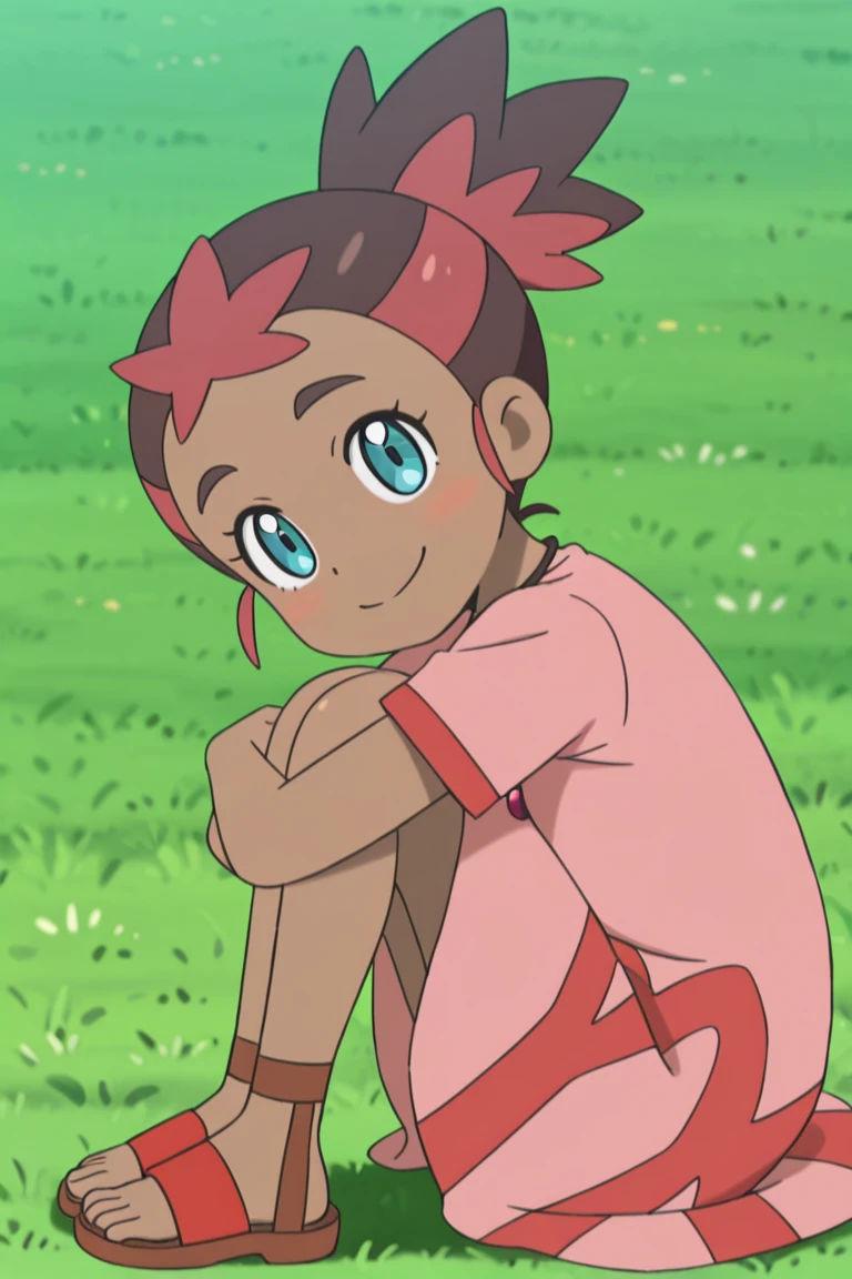 dark skin, dark-skinned female, short hair, two-tone hair, red and brown hair, spiky ponytail, aquamarine eyes, red pendant, pink dress, short sleeve, red wave designs dress, red sandals,