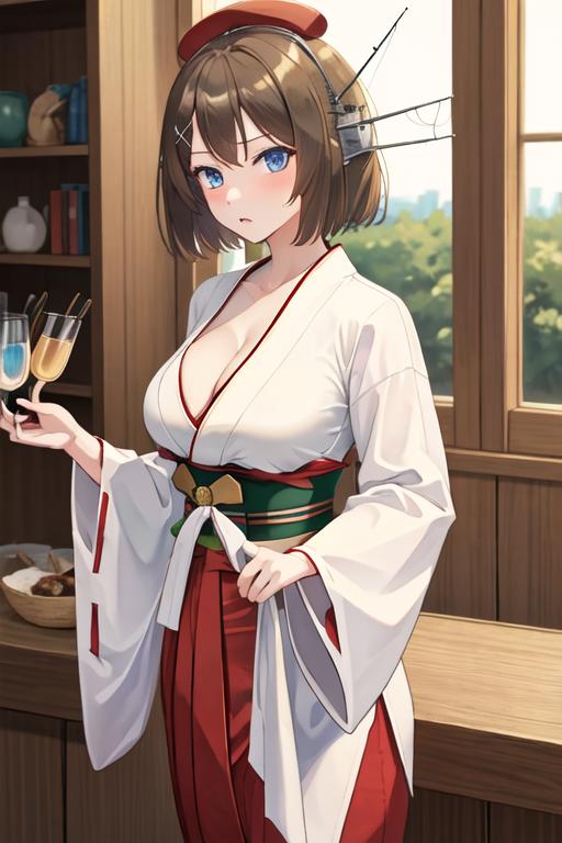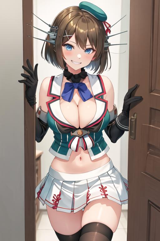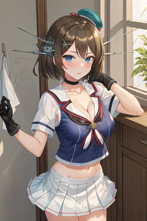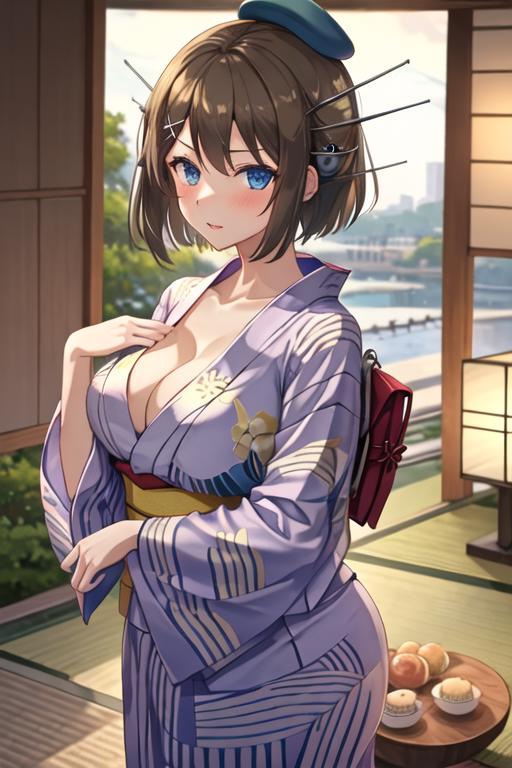 The trigger word is maya_kantaicollection, and the recommended tags are best quality, masterpiece, highres, solo, {maya_kantaicollection:1.15}, short_hair, brown_hair, hair_ornament, blue_eyes, breasts, hairclip, x_hair_ornament, large_breasts, blush, hat, headgear, cleavage.