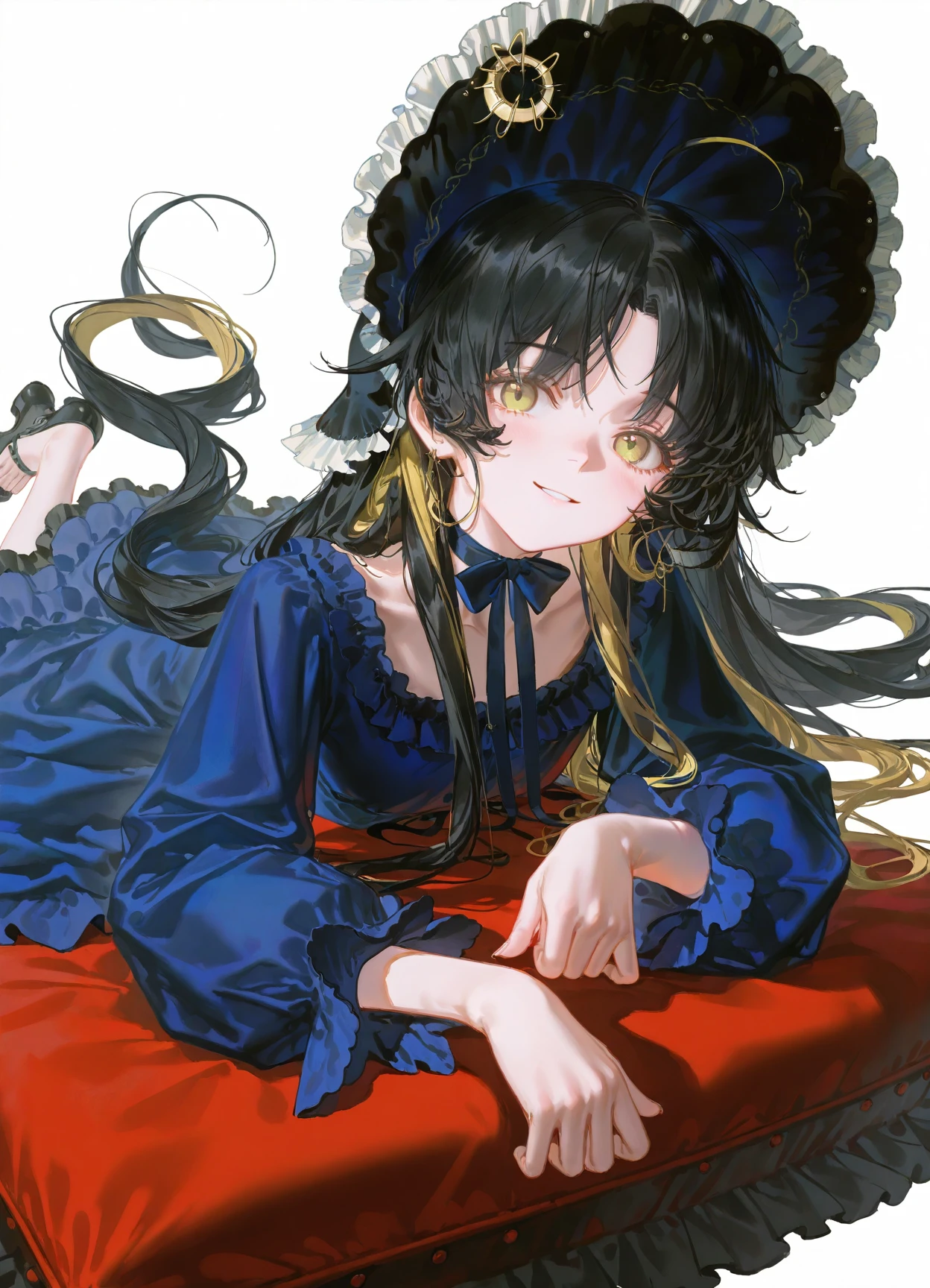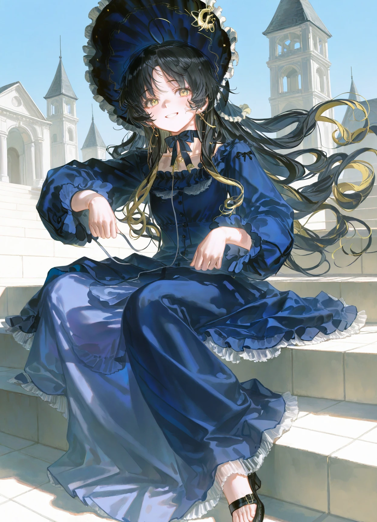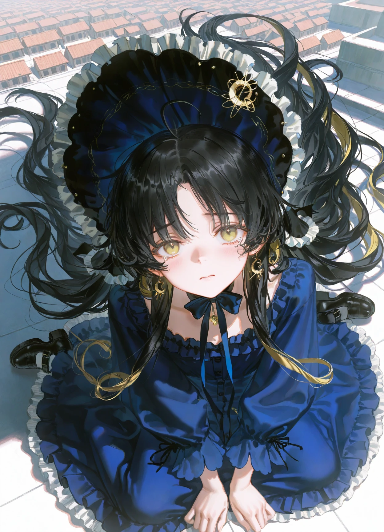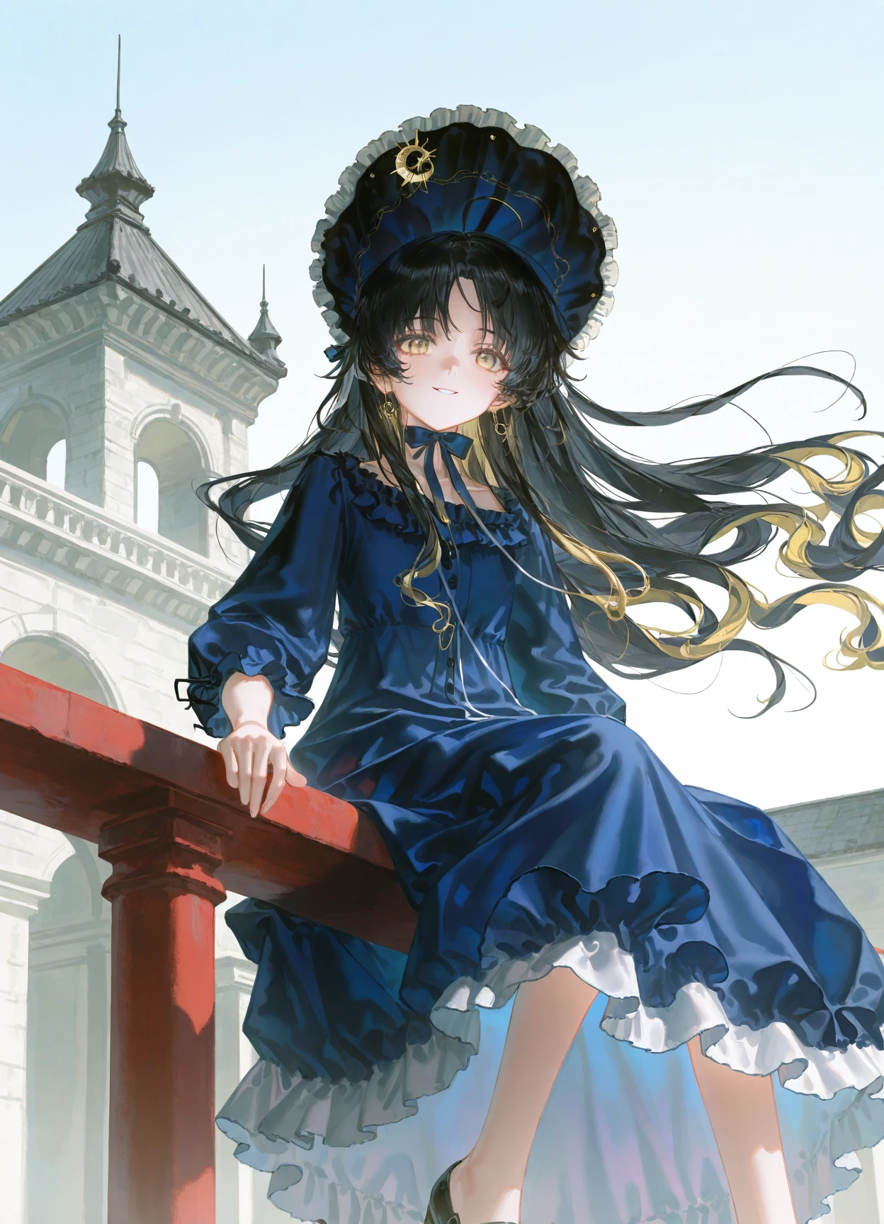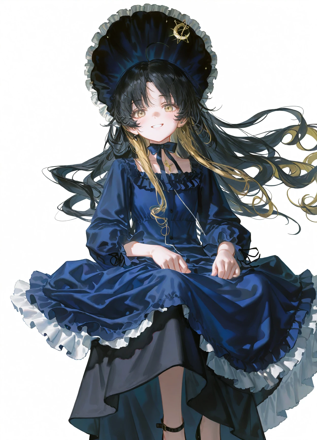 xinyueye,1girl,solo,blonde hair,black hair,long flowing hair,floating hair,parted bangs,ahoge,yellow eyes,blue dress,long dress,frilled dress,long sleeves,sleeves past elbows,frilled bonnet,chin strap,blue bowtie,crescent hair ornament,jewelryDescription