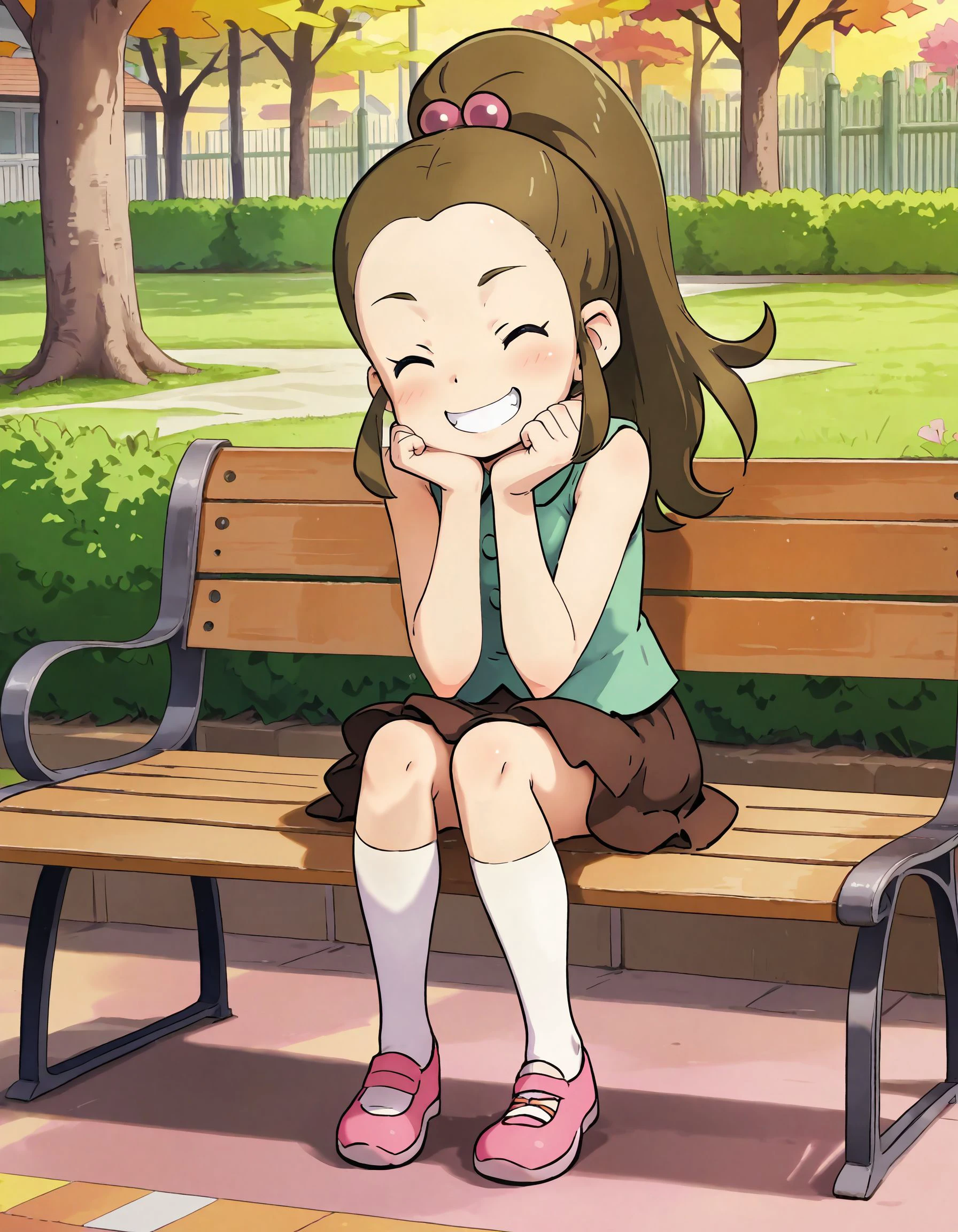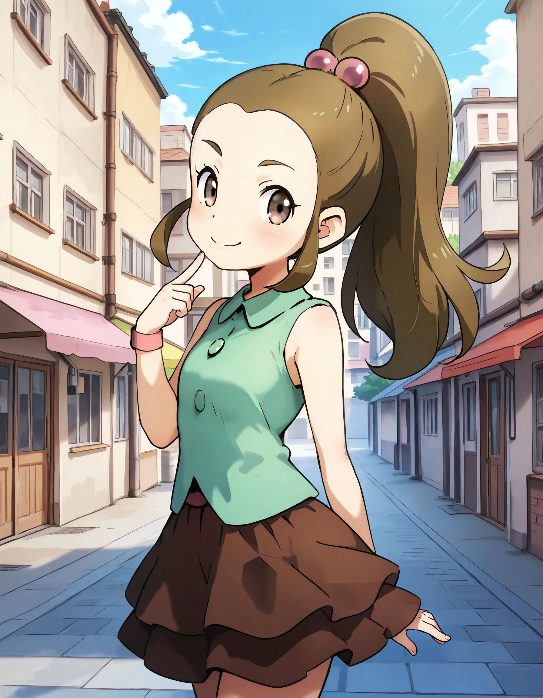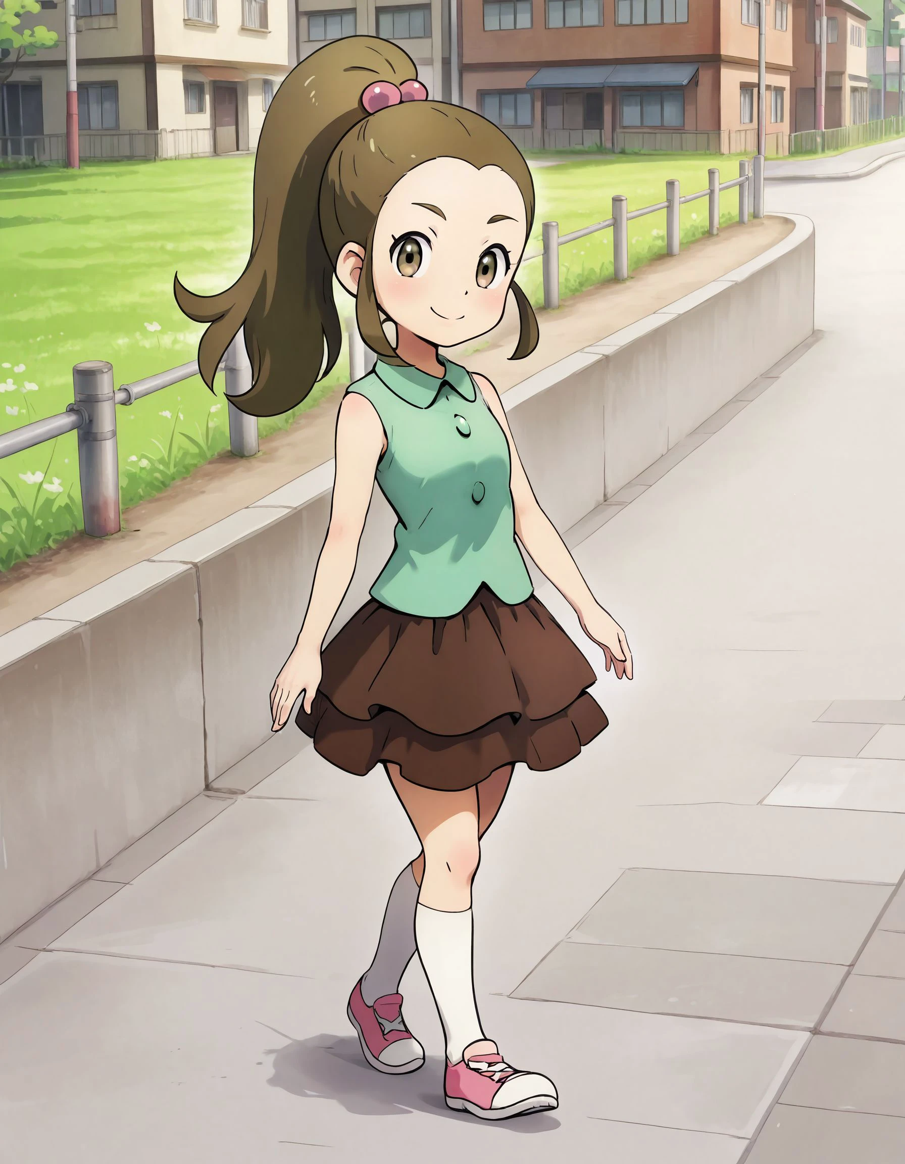Add "hair bobbles,sleeveless shirt,brown skirt,kneehighs,sneakers" for her typical look.