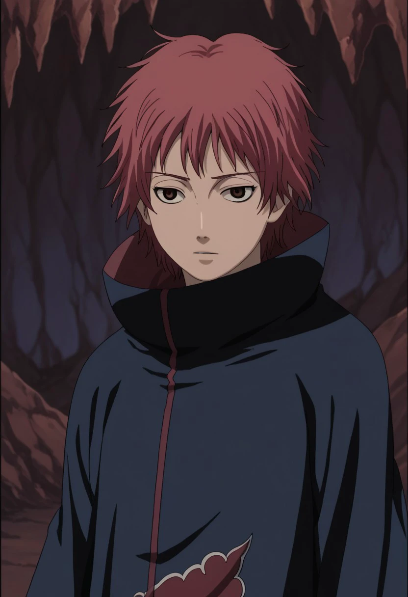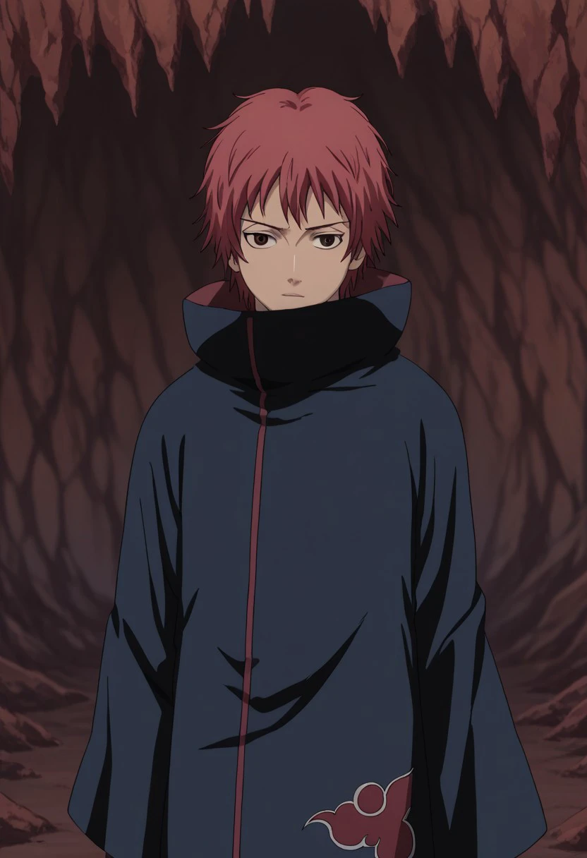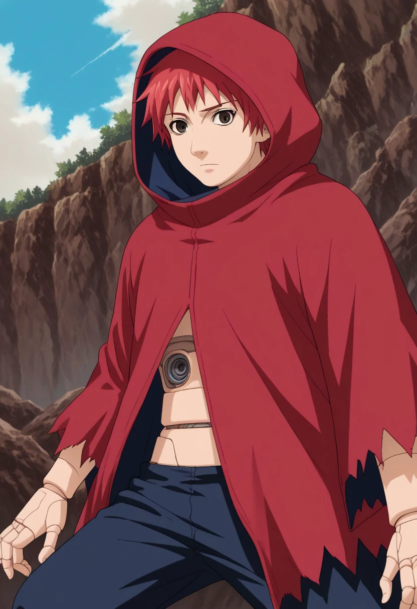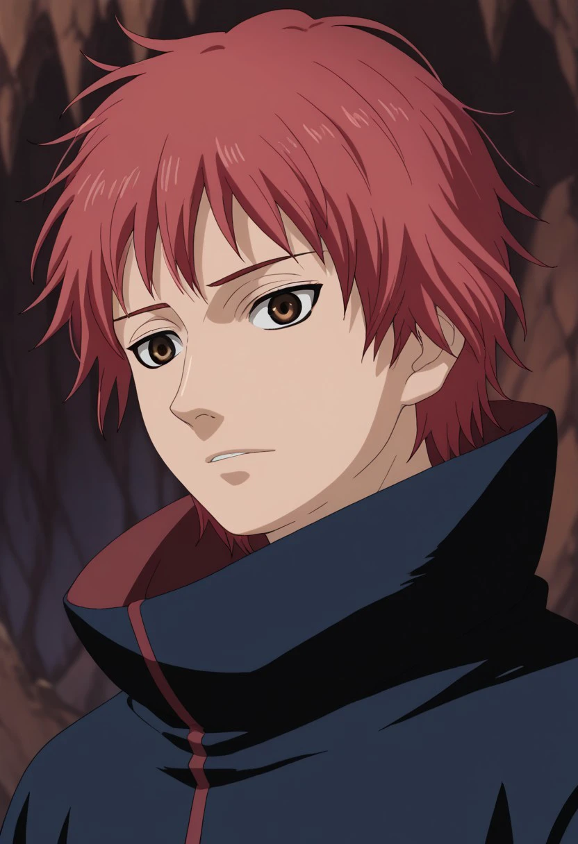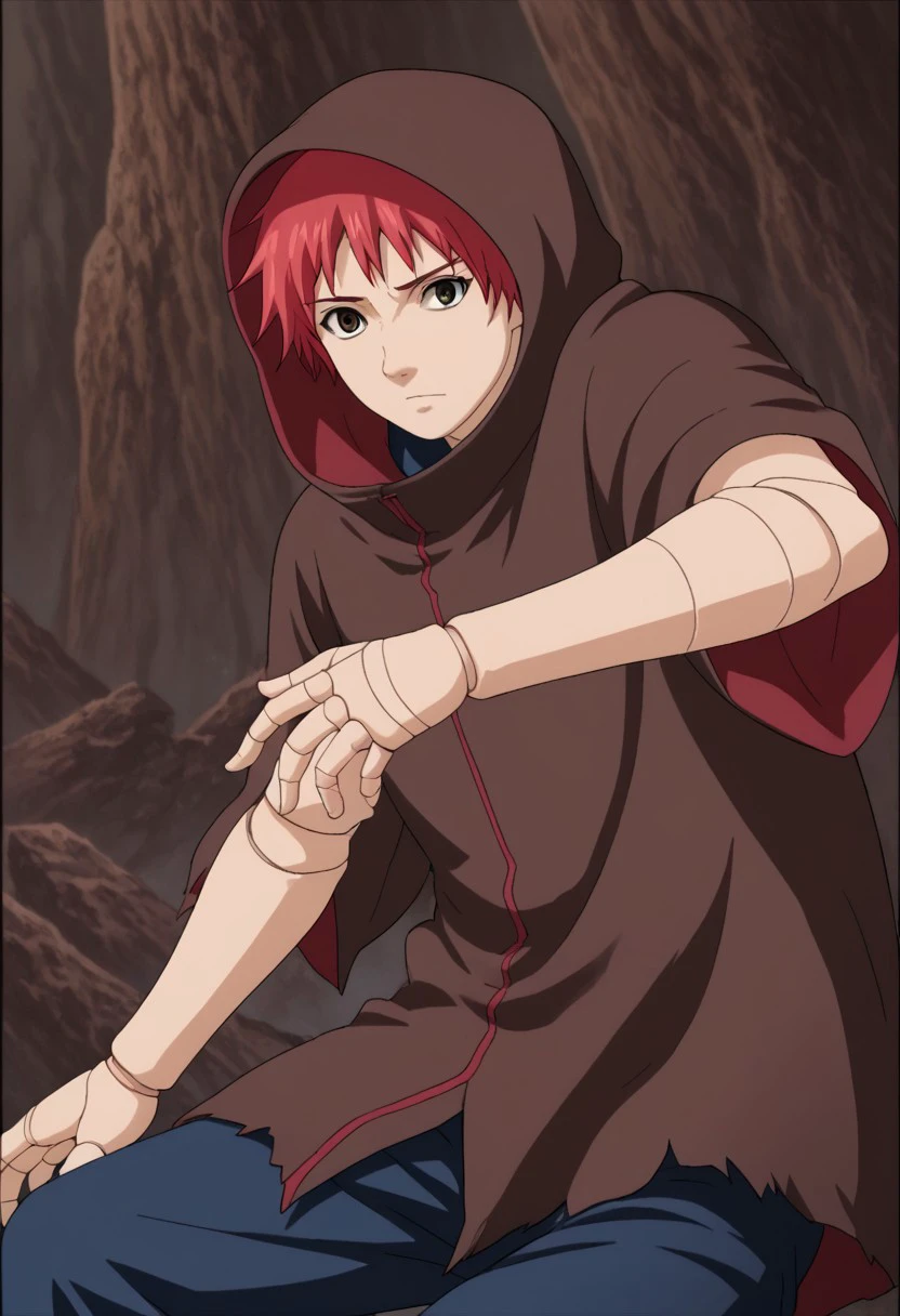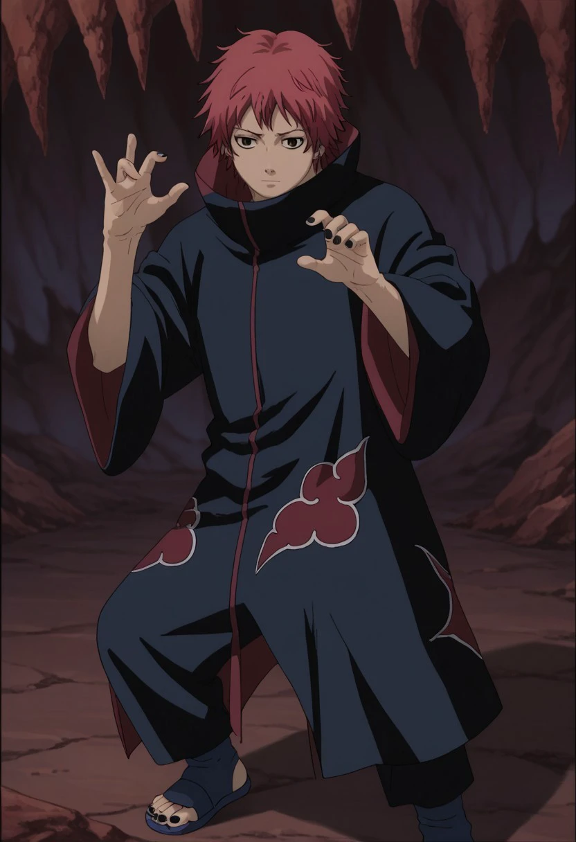 sasori, 1boy, male focus, solo, brown eyes, red hair, robe, black robe, high collar, pants, black pants, sandals, black nails,