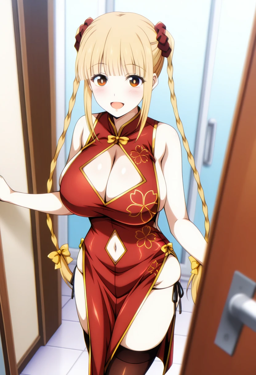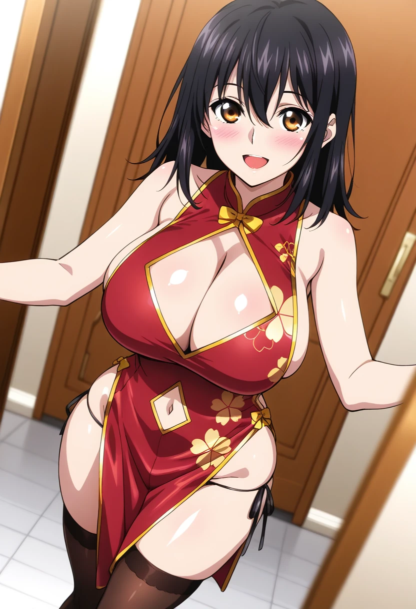 <lora:ttnedaake_nrais_sseh4itatm8_l9ie24:0.8>, chinese clothes, dress,red dress ,china dress,sleeveless dress , print dress,backless dress, pelvic curtain, underwear , black panties,side-tie panties, string panties ,lowleg panties, panty straps, thighhighs,brown thighhighs,black thighhighs, yellow bow, side slit,clothing cutout,sleeveless, floral print ,gold trim, cleavage cutout,navel cutout , sideboob, bare shoulders ,skindentation,bare arms , navel,cleavage,