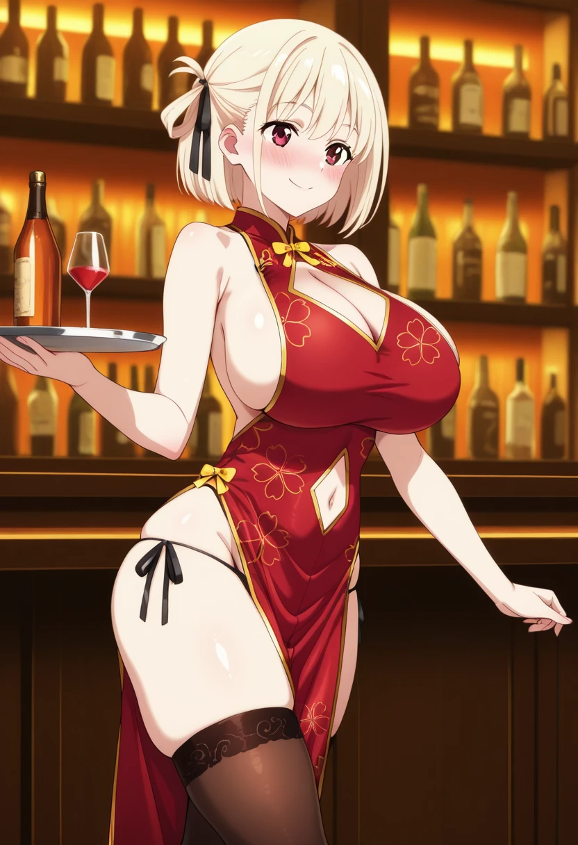 <lora:ttnedaake_nrais_sseh4itatm8_l9ie24:0.8>, chinese clothes, dress,red dress ,china dress,sleeveless dress , print dress,backless dress, pelvic curtain, underwear , black panties,side-tie panties, string panties ,lowleg panties, panty straps, thighhighs,brown thighhighs,black thighhighs, yellow bow, halterneck, bare back , backless outfit, black ribbon, side slit,sleeveless, floral print ,gold trim, sideboob, bare shoulders ,skindentation,bare arms ,