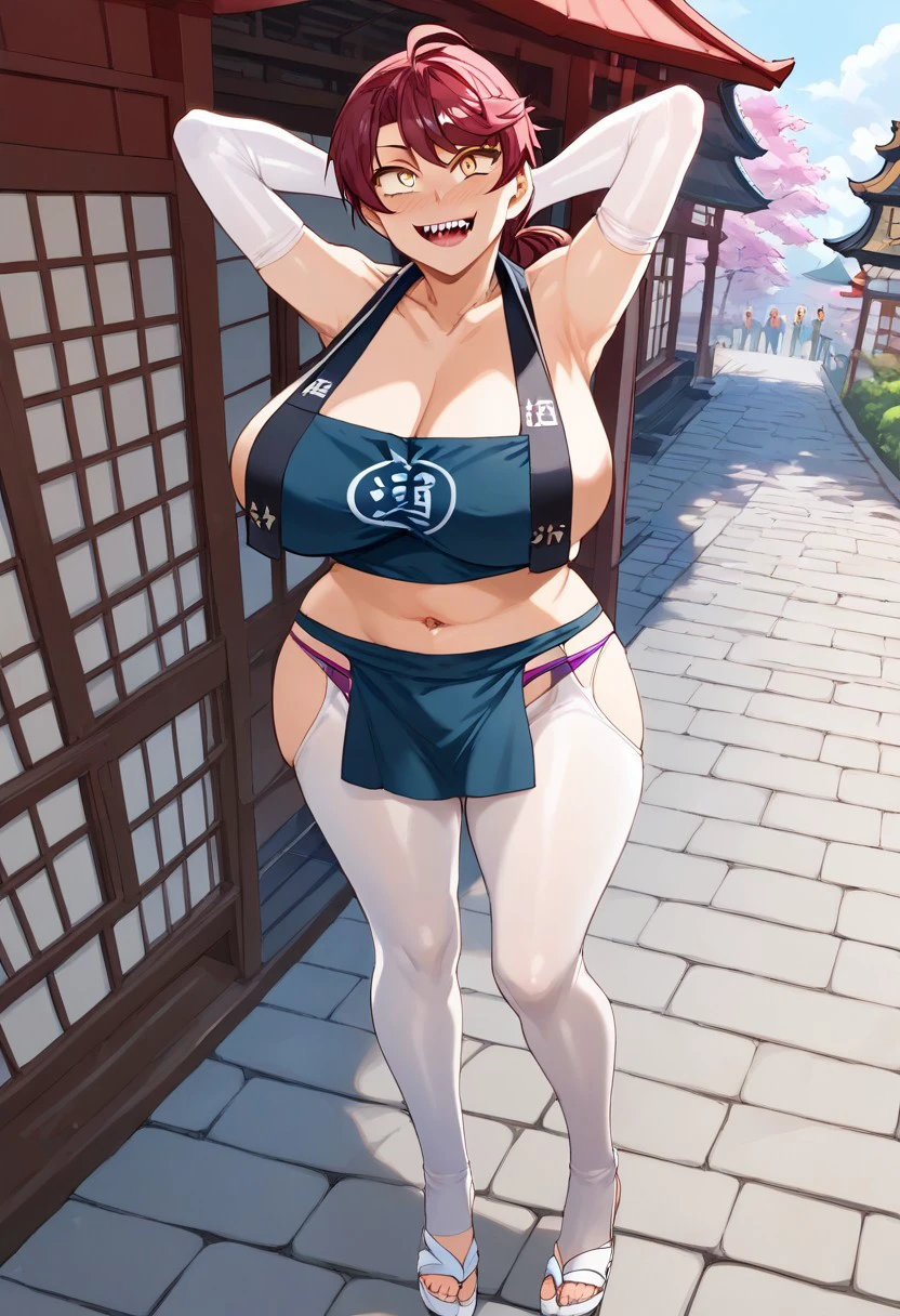 (( <lora:nakanita_subaru:1> , nakanita_subaru, piercing amber eyes, clear eyes, bright pupils, beautiful eyes, beautiful red hair, short low ponytail, huge and shaggy breast, thin waist, really wide hips, beautiful skin, beauty, extraordinary beautiful milf, attractive milf, super sexy milf, lustful body, sexy milf with seductive obscene body, sensual body, voluptuous body, 1mole under lips on left cheek, )) , ( sharp teeth:0,8 , shark teeth:0,8 )