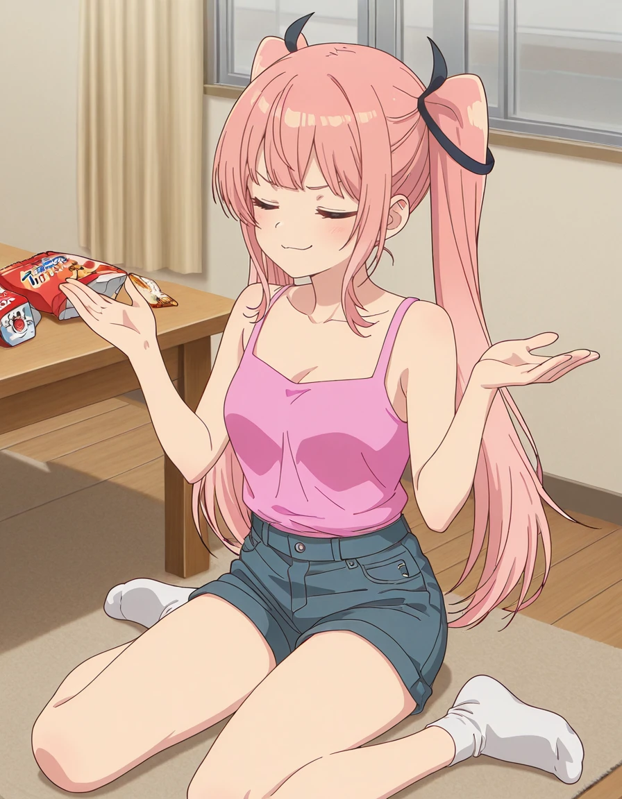 casual outfit, pink tank top, denim shorts, socks, no shoesDescription