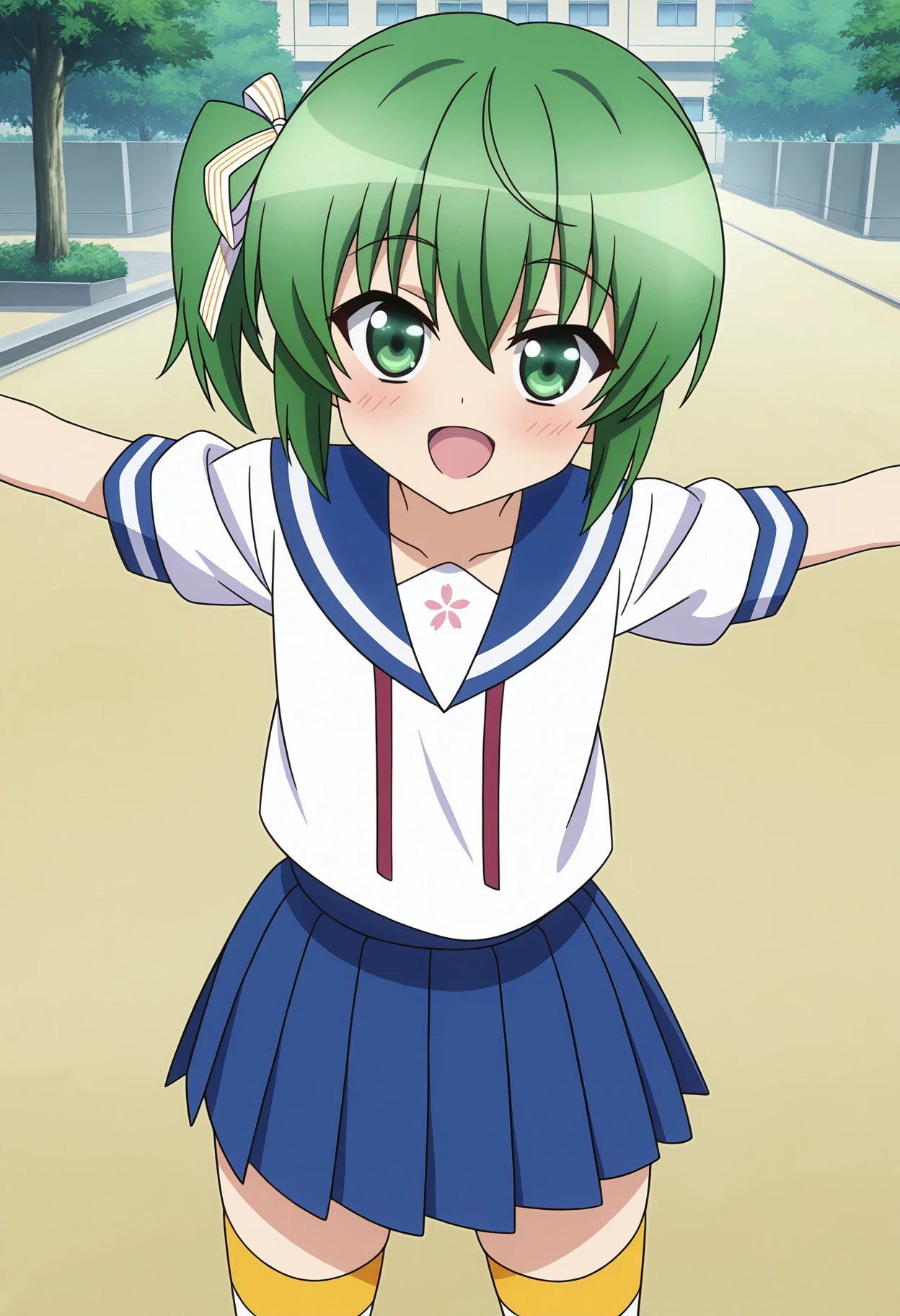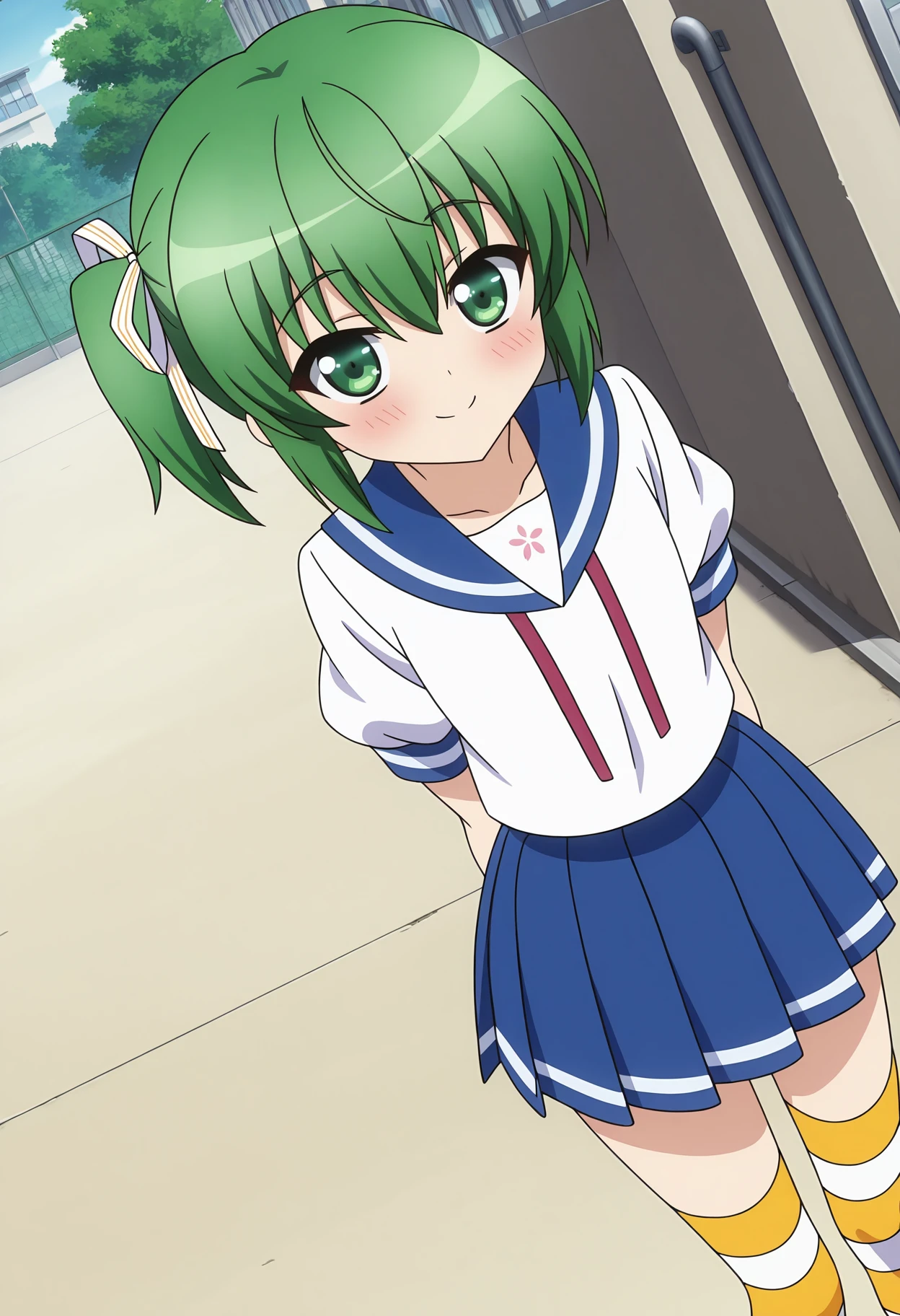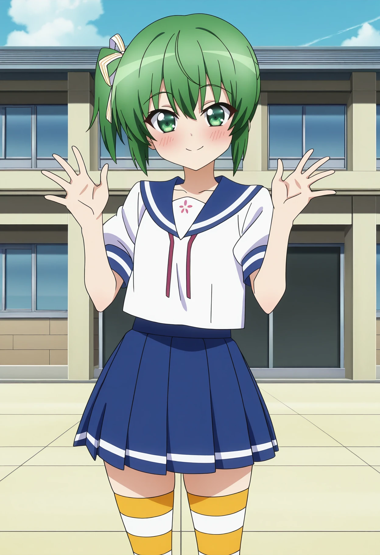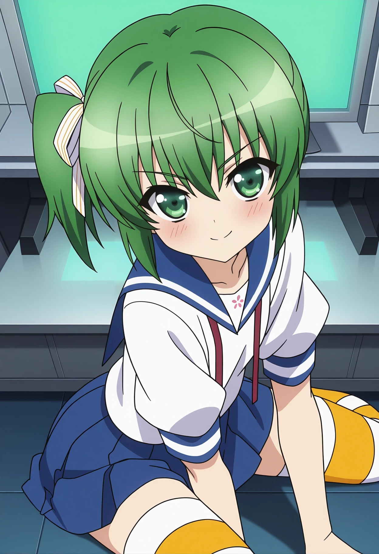 mmnoa, green hair, short hair, side ponytail, hair ribbon, green eyes, school uniform, serafuku, short sleeves, blue skirt, yellow thighhighs, striped thighhighs,