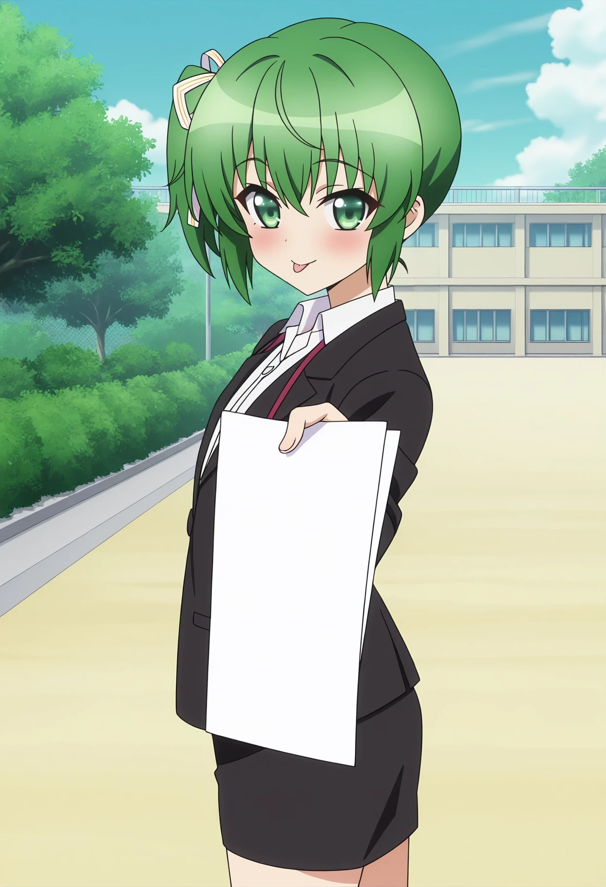 mmnoa, green hair, short hair, side ponytail, hair ribbon, green eyes,