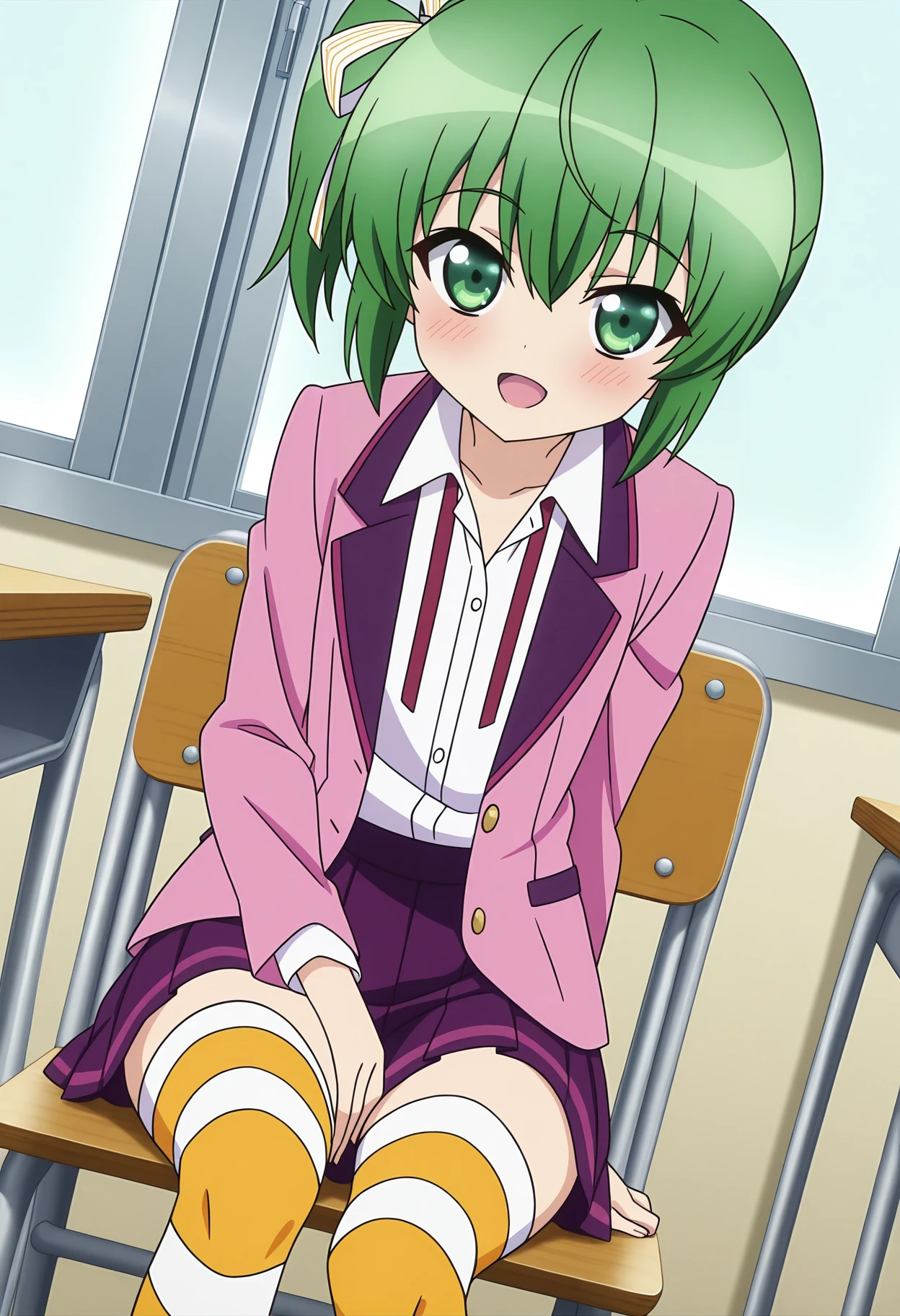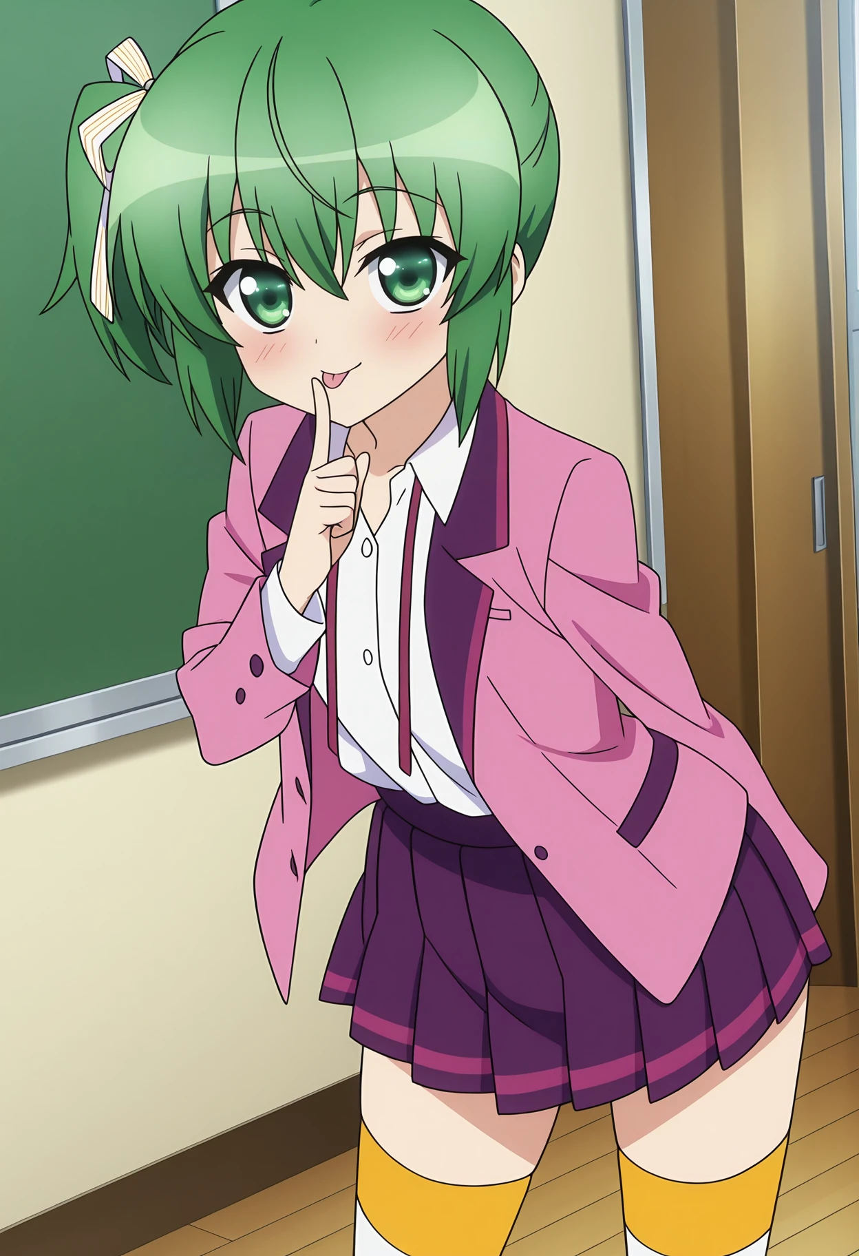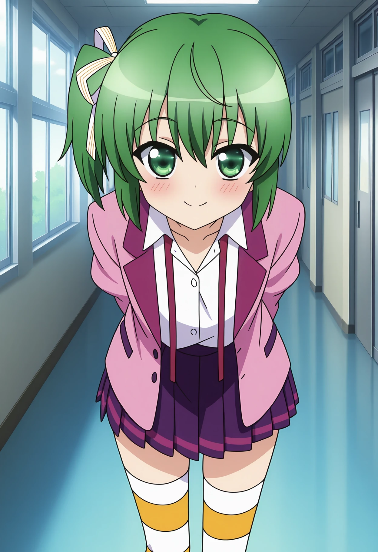 mmnoa, green hair, short hair, side ponytail, hair ribbon, green eyes, school uniform, pink jacket, open jacket, white shirt, purple skirt, pleated skirt, yellow thighhighs, striped thighhighs,
