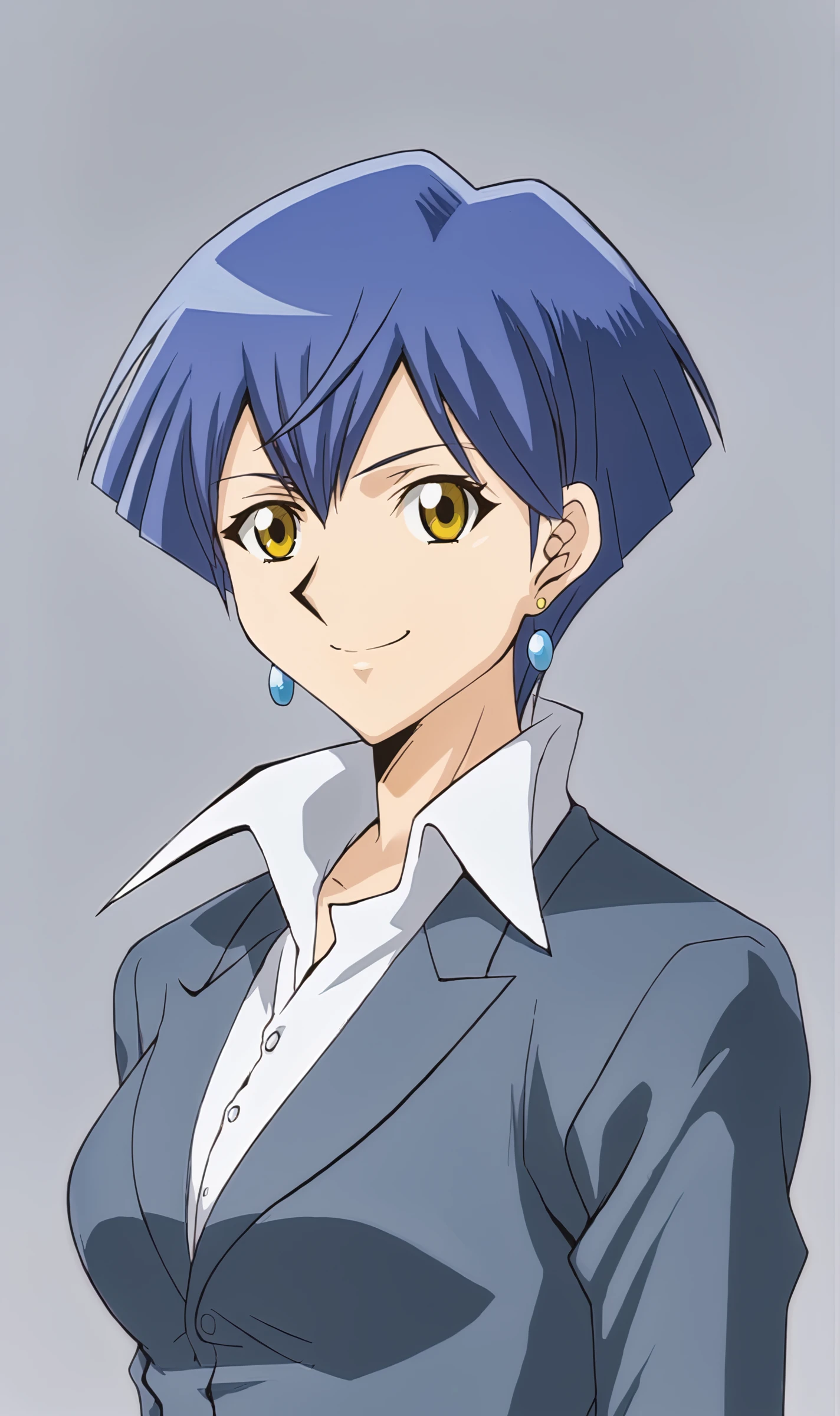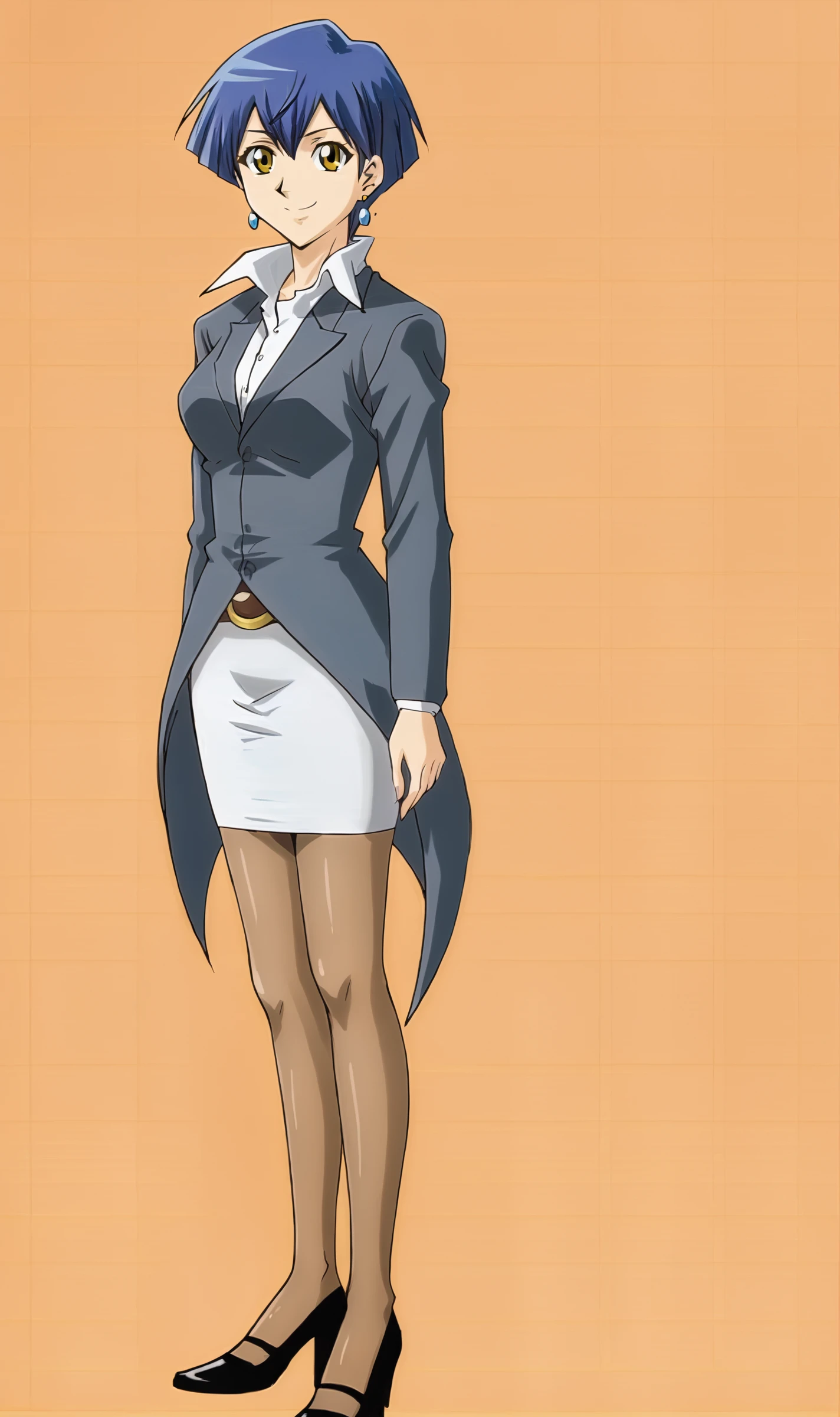 Outfit 1-'white collared shirt, long grey jacket, white pencil skirt, belt buckle, brown pantyhose, black heels,'