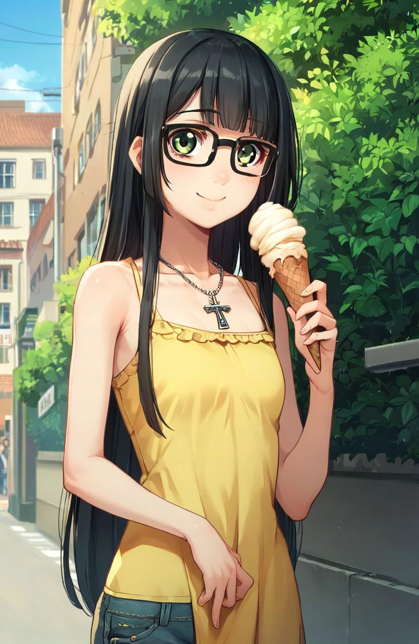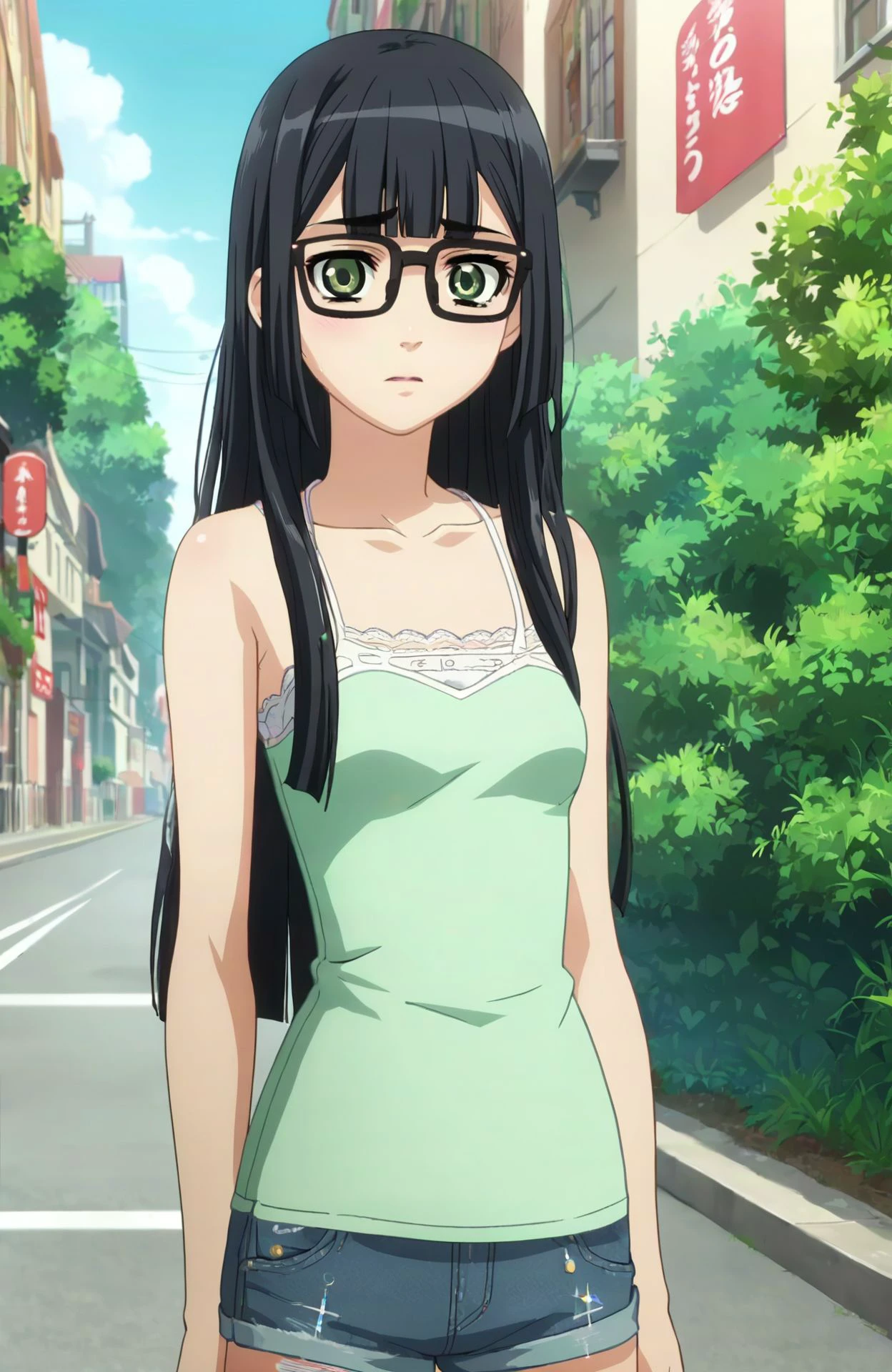 <lora:AoiFutaba:0.8> aoifutaba, 1girl, long hair, black hair, green eyes, glasses, shorts