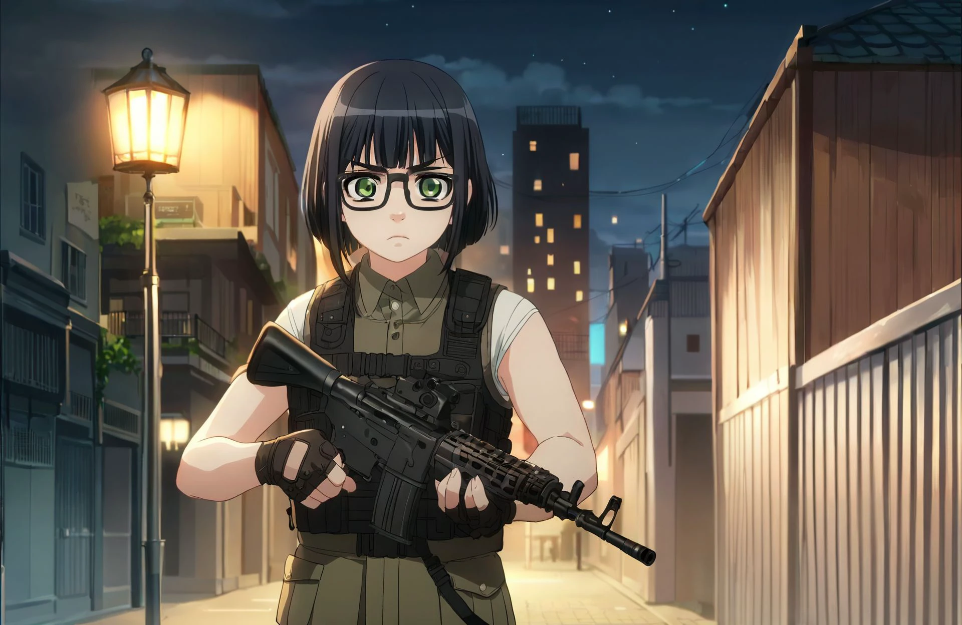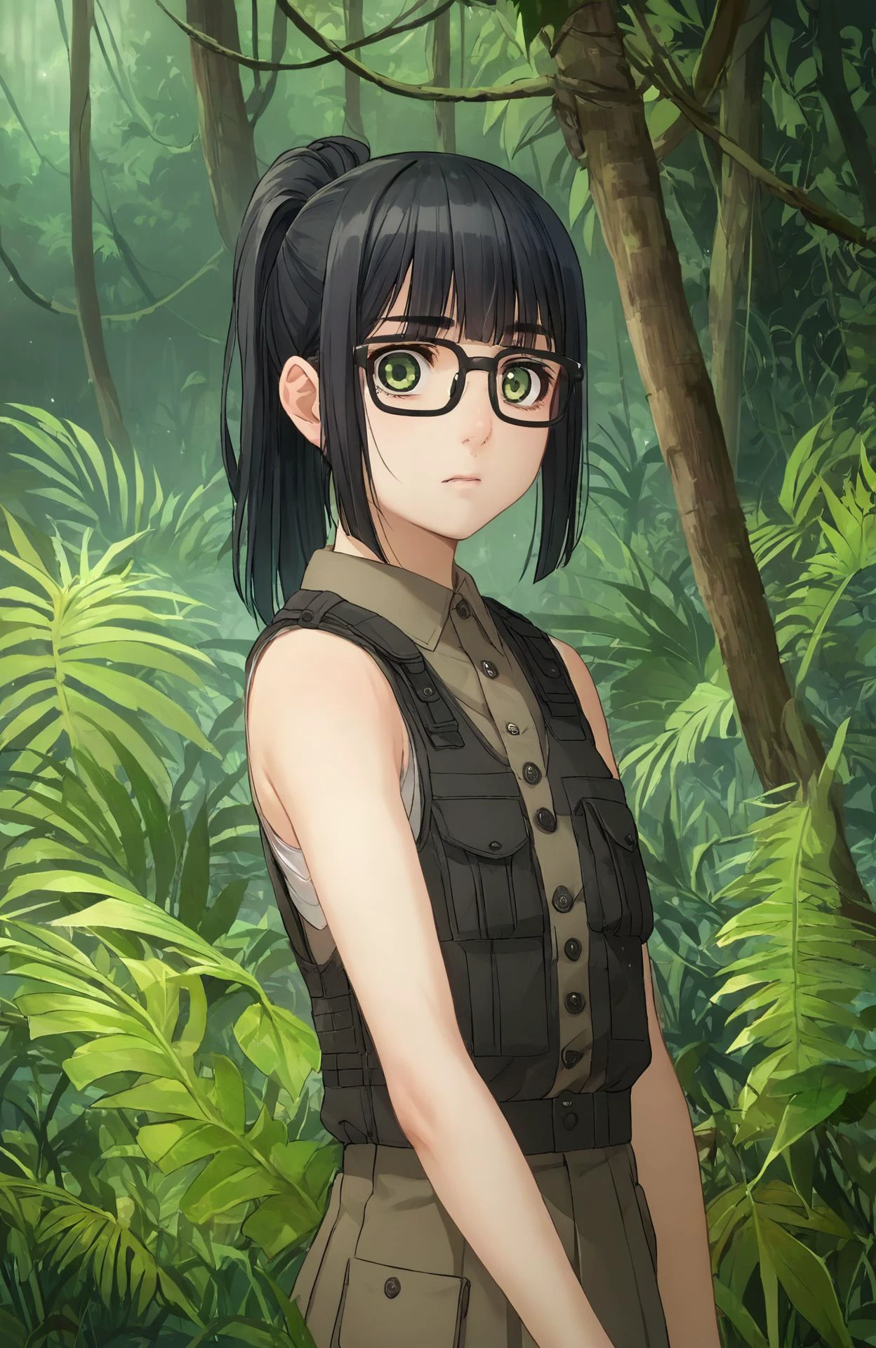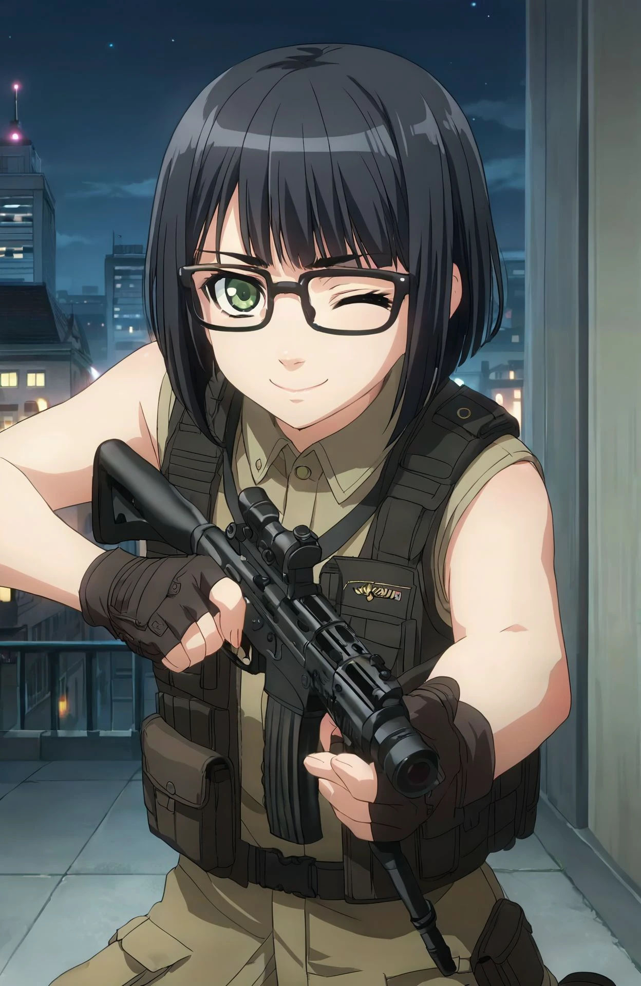 Prompt: aoifutaba, military uniform, 1girl, smile, short hair, black hair, gloves, green eyes, glasses, fingerless gloves, load bearing vest