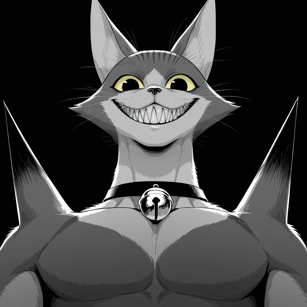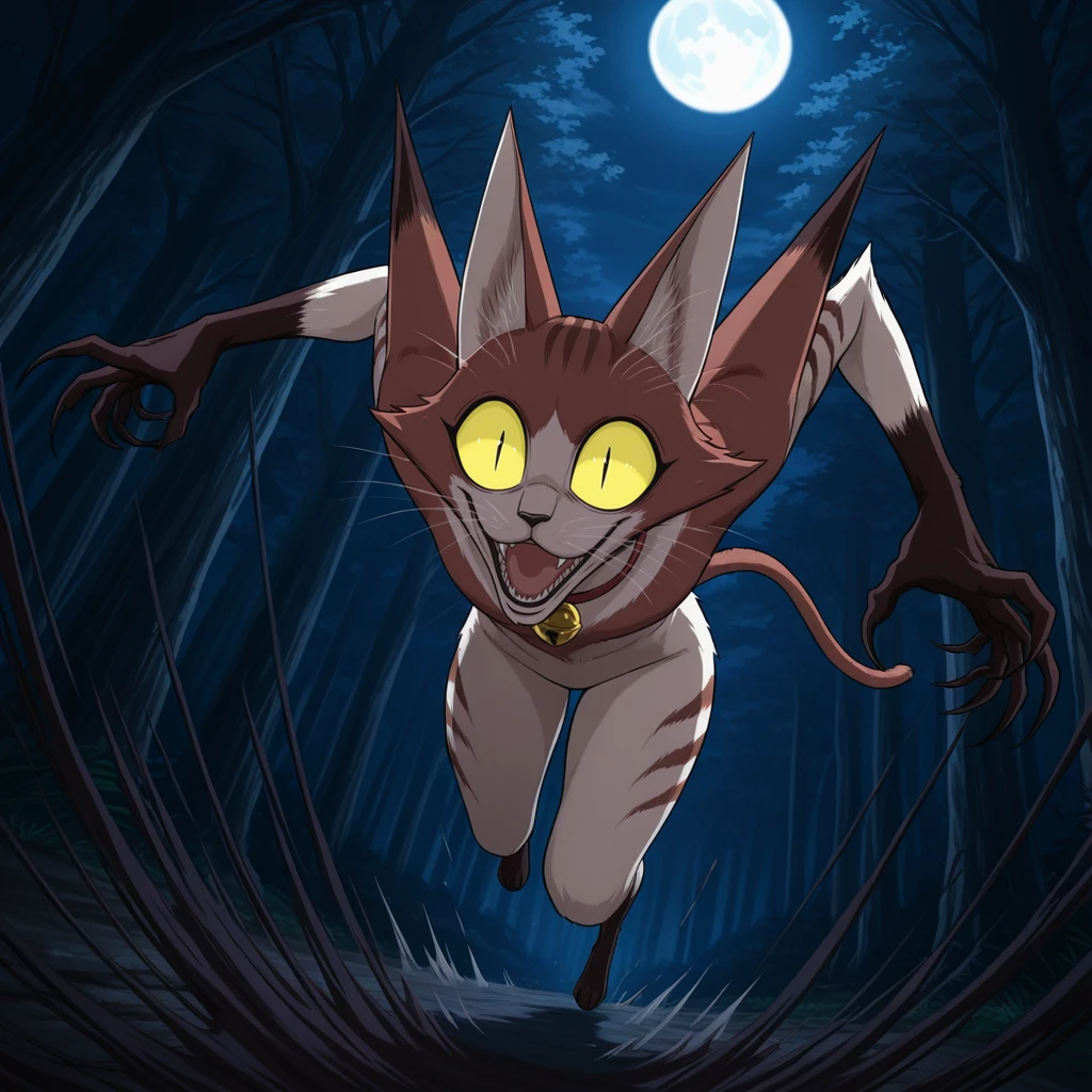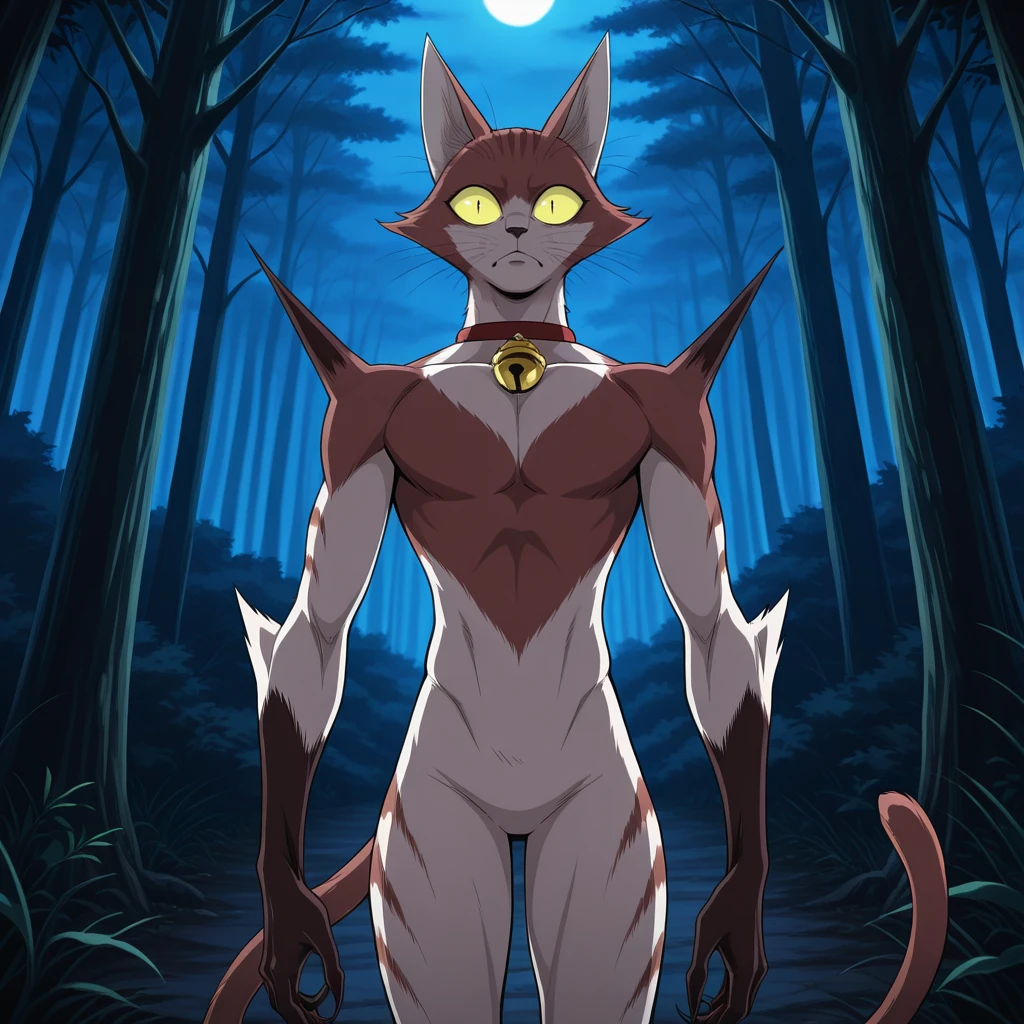 1boy, male, furry male, anthro, solo, cat, brown fur, white fur, two-tone fur, yellow sclera, slit pupils, black nose, whiskers, pointed ears, ear tufts, sharp teeth, spiked shoulders, spiked elbows, sharp claws, pawpads, tail