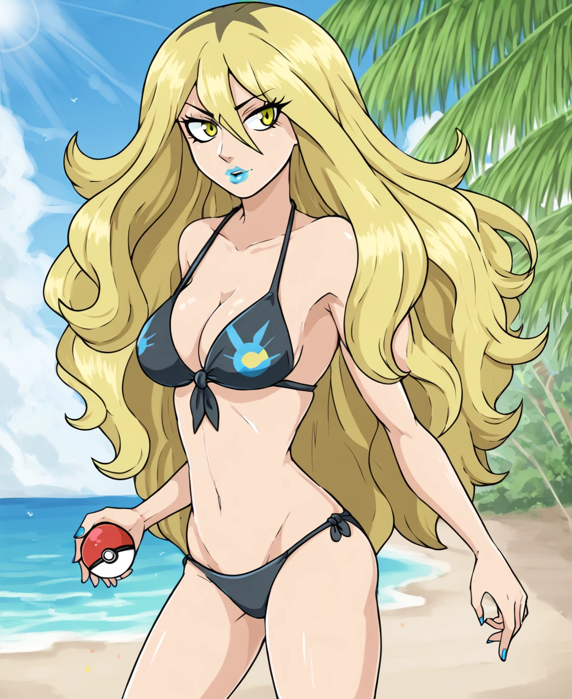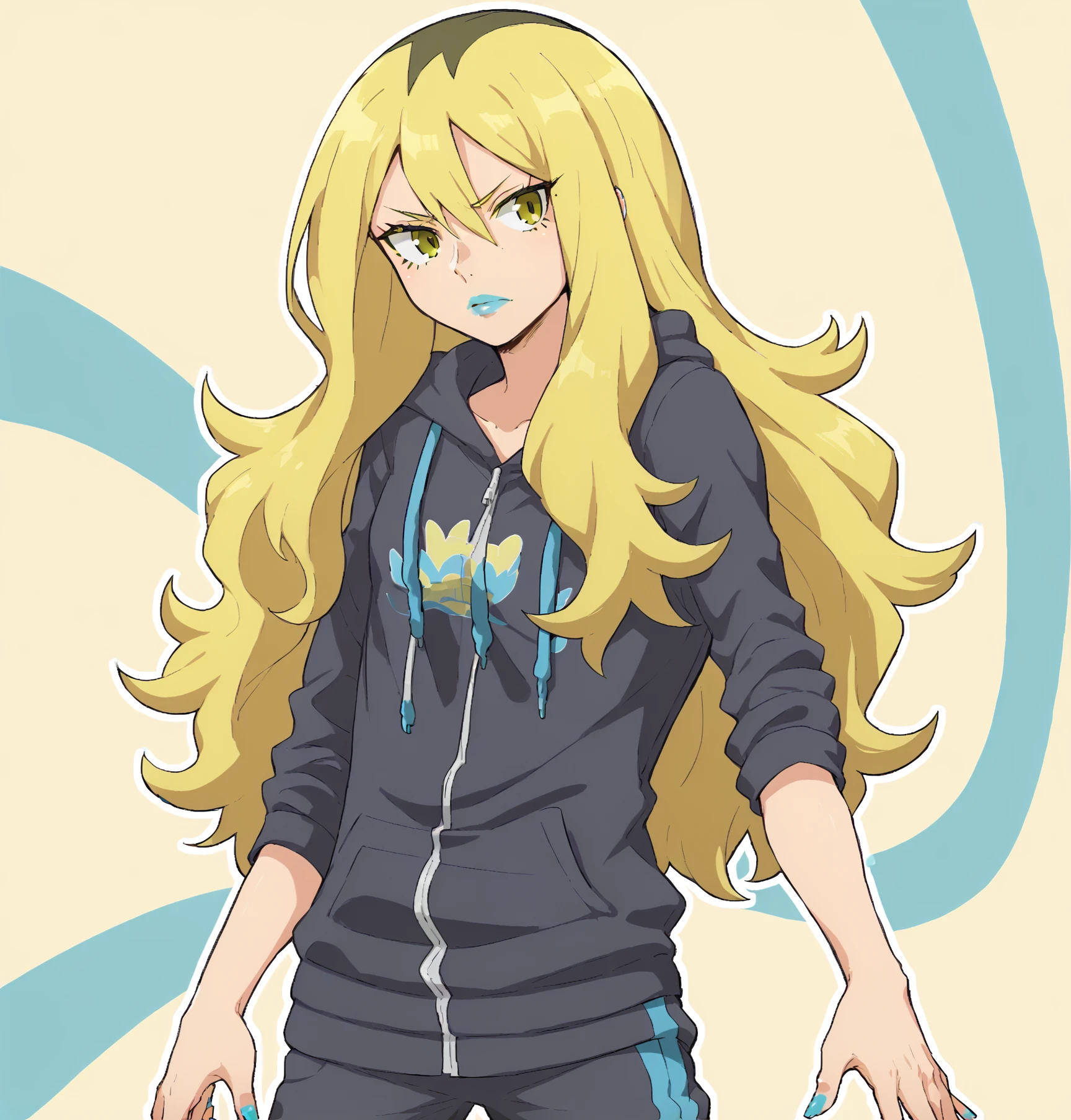 delinquent_oras, long hair, blonde hair, multicolored hair, hood, track pants, blue lips, blue nails, yellow eyes