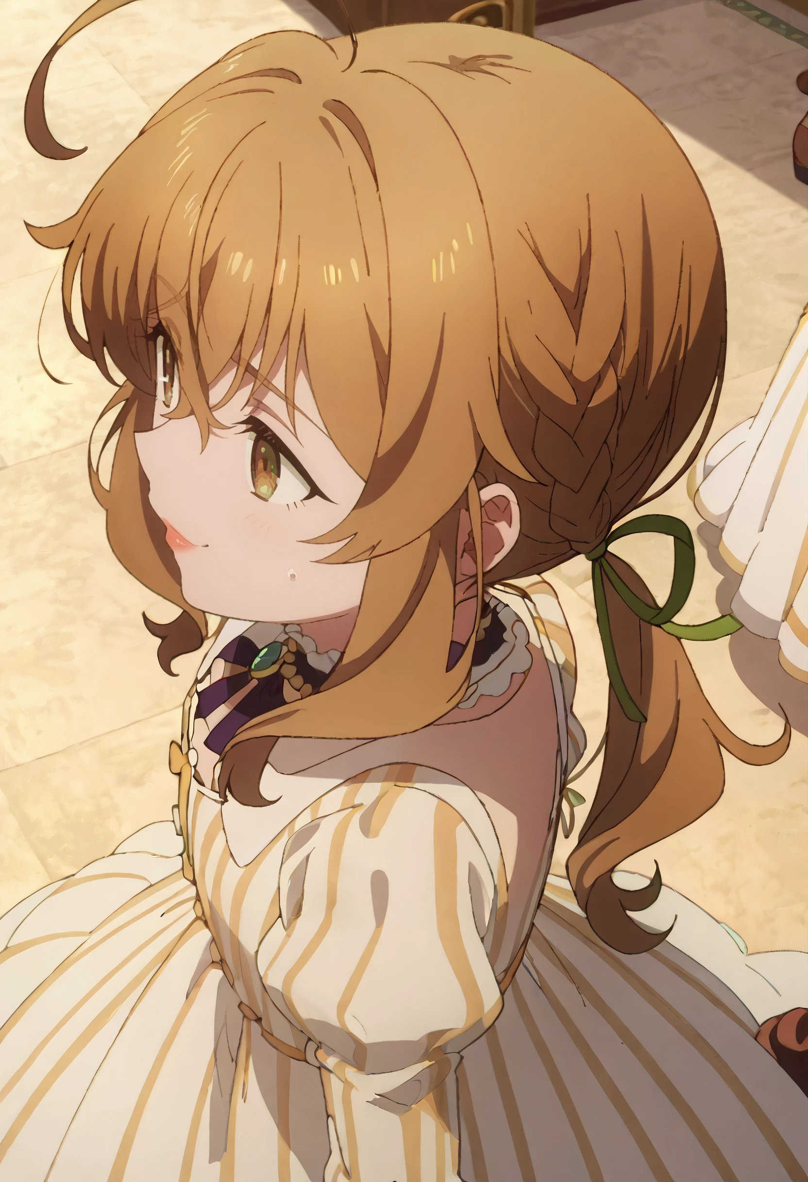 MonicaDress, striped clothes, long sleeves, vertical-striped clothes, striped dress, sidelocks, ribbon, vertical-striped dress, puffy sleeves, braid, vertical-striped sleeves, green ribbon, hair ribbon, white dress, juliet sleeves, striped, ponytail, pinstripe pattern, pinstripe dress, bow, frills, boots, brown footwear, green brooch, cross tie, frilled choker, low ponytail,