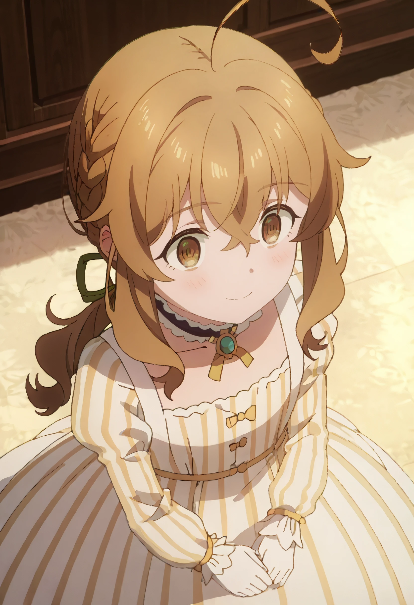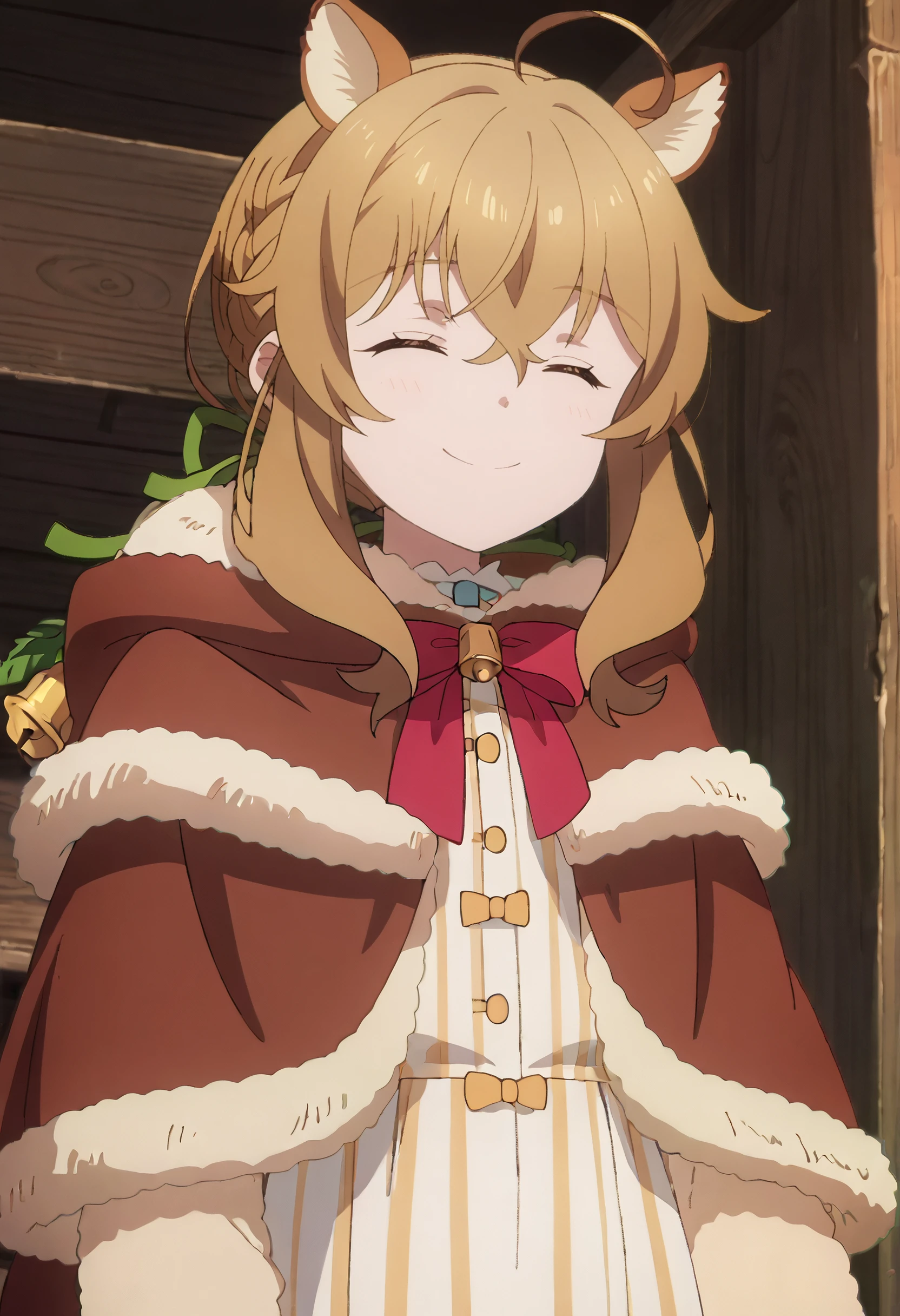 MonicaCape, fur trim, brown capelet, fur-trimmed capelet, hooded capelet, hood, long sleeves, fur-trimmed hood, animal hood, sidelocks, ribbon, bow, striped clothes, braid, brown cloak, animal ears, red bow, hair ribbon, bell, fake animal ears, green ribbon, striped dress, blue dress, brown cape, bowtie, ponytail, hood down, red bowtie, animal ear hood, vertical-striped dress, fur-trimmed sleeves, low ponytail,