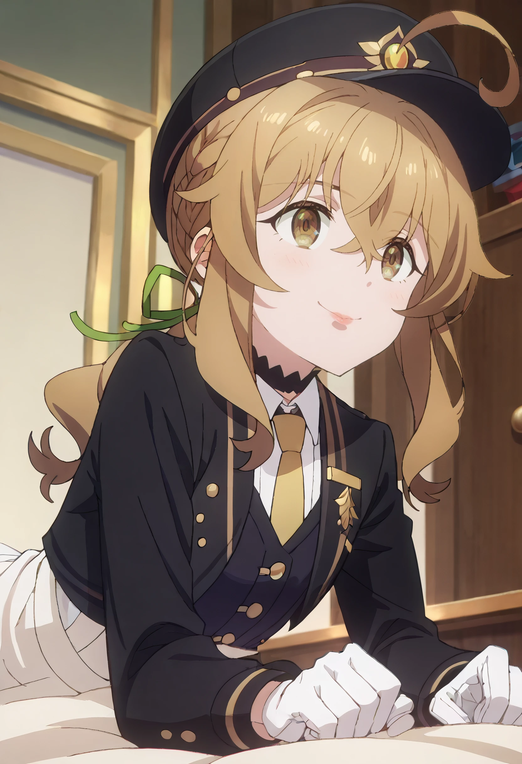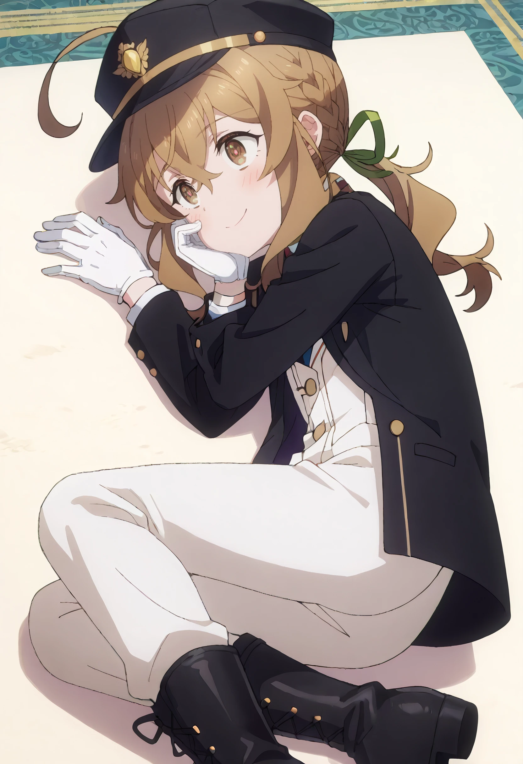 MonicaJockey, black jacket, long sleeves, pants, white pants, ribbon, white shirt, hair ribbon, green ribbon, black hat, sidelocks, ponytail, white necktie, buttons, white gloves, low ponytail, collared shirt, collar, black footwear, boots, helmet, knee boots, braid, peaked cap,