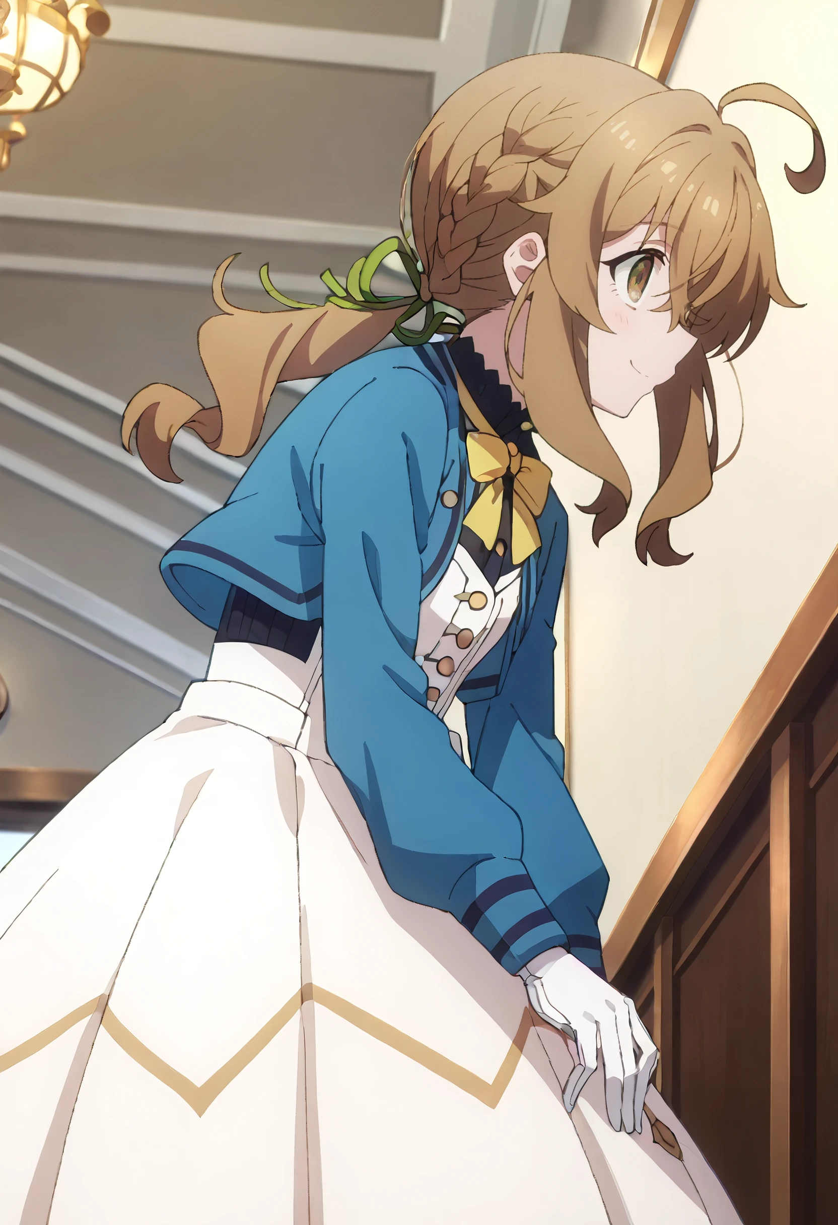 MonicaSchool, blue jacket, ribbon, sidelocks, long sleeves, black shirt, braid, bow, yellow bow, green ribbon, hair ribbon, bowtie, yellow ribbon, ponytail, yellow bowtie, white dress, cropped jacket, low ponytail, neck ribbon, buttons, white gloves, crown braid, brown footwear, boots,