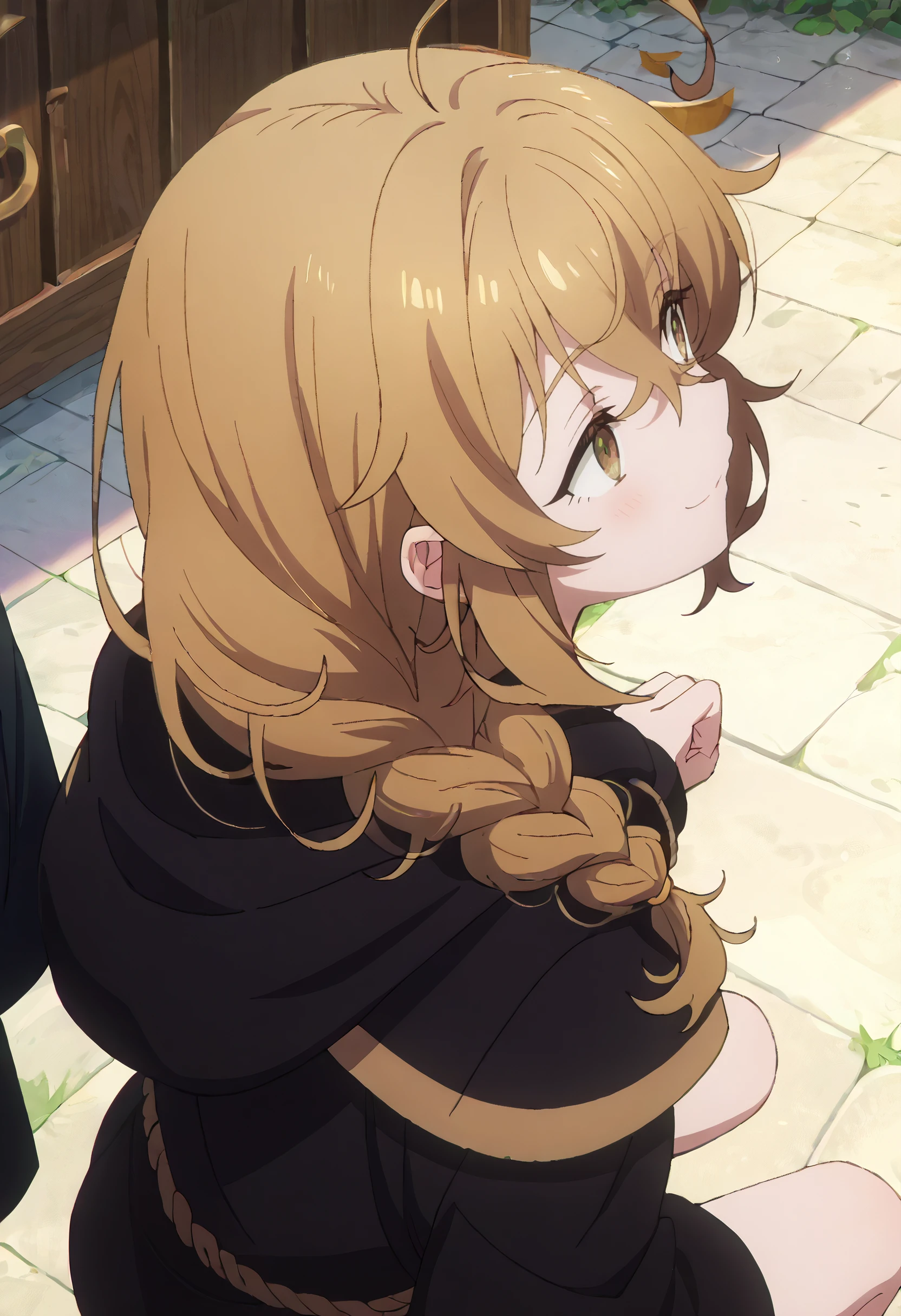 MonicaCloak, hood, braid, twin braids, long sleeves, hood down, low twin braids, black hoodie, robe, black robe, hooded robe, hooded capelet, drawstring, hair over shoulder, sidelocks, black shirt, black cloak, messy hair, wide sleeves, black hood, hooded coat, belt,