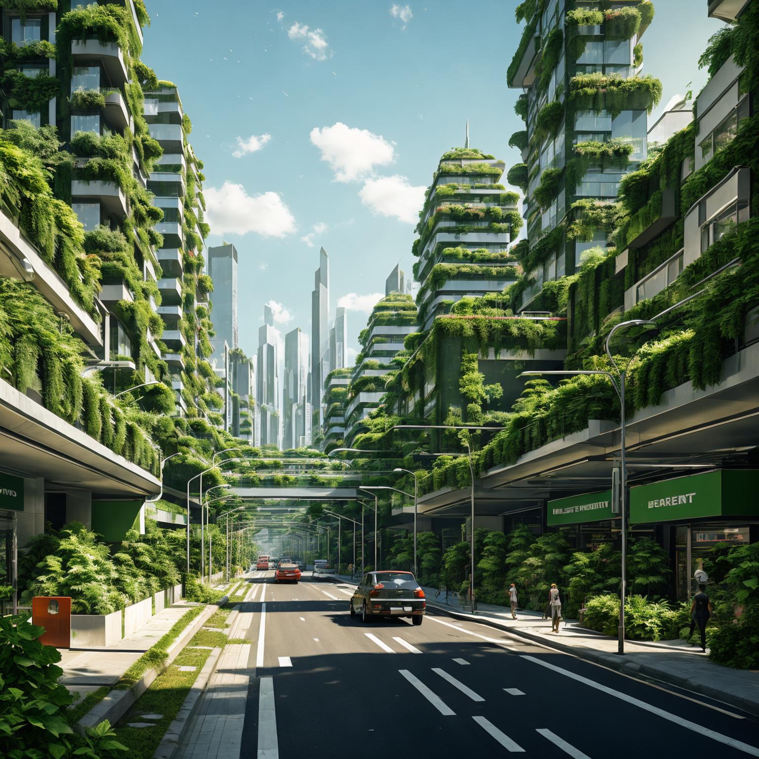 detail example: a city with tall buildings and a lot of greenery on the sides of the street and cars driving down the street
