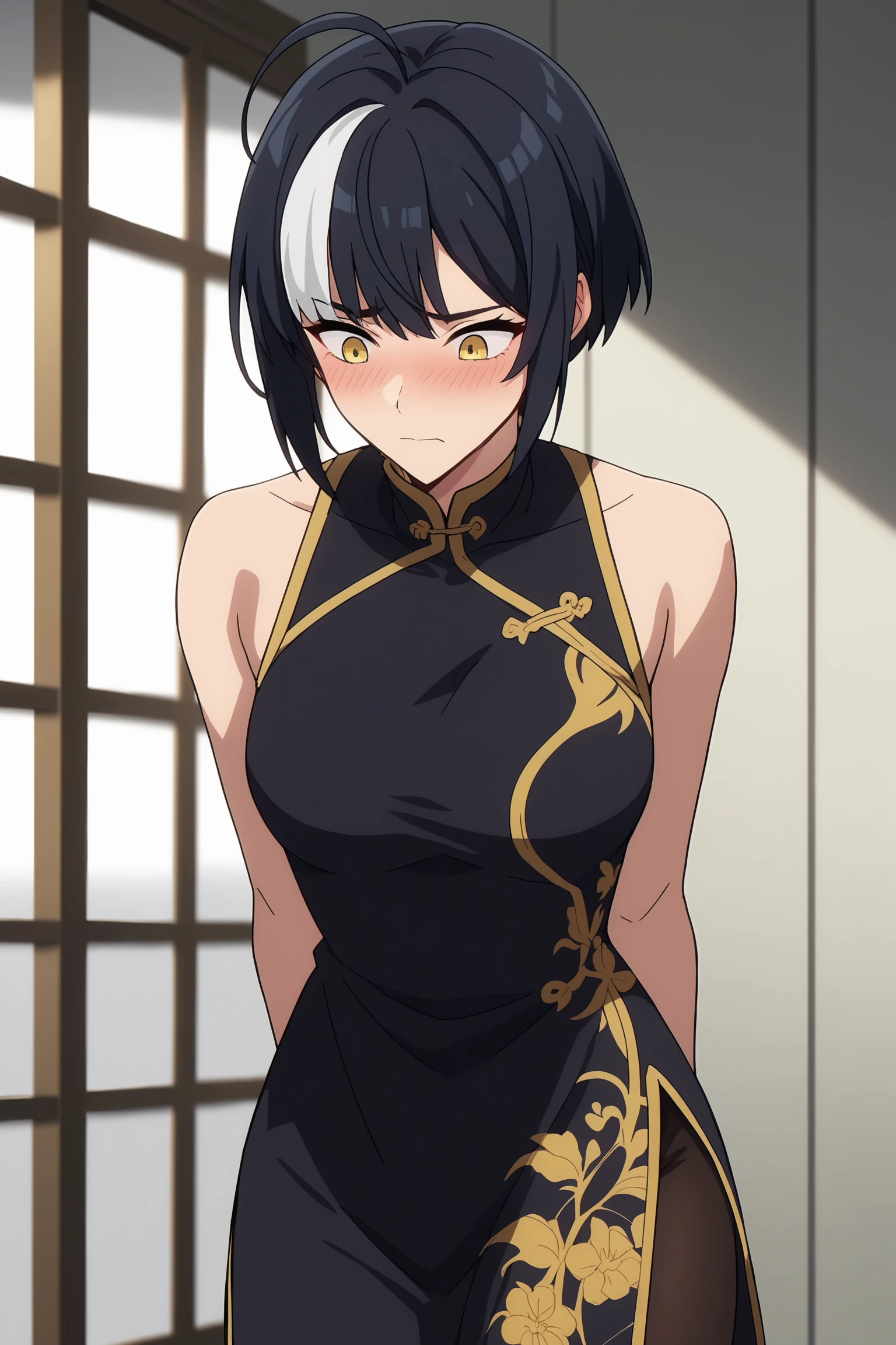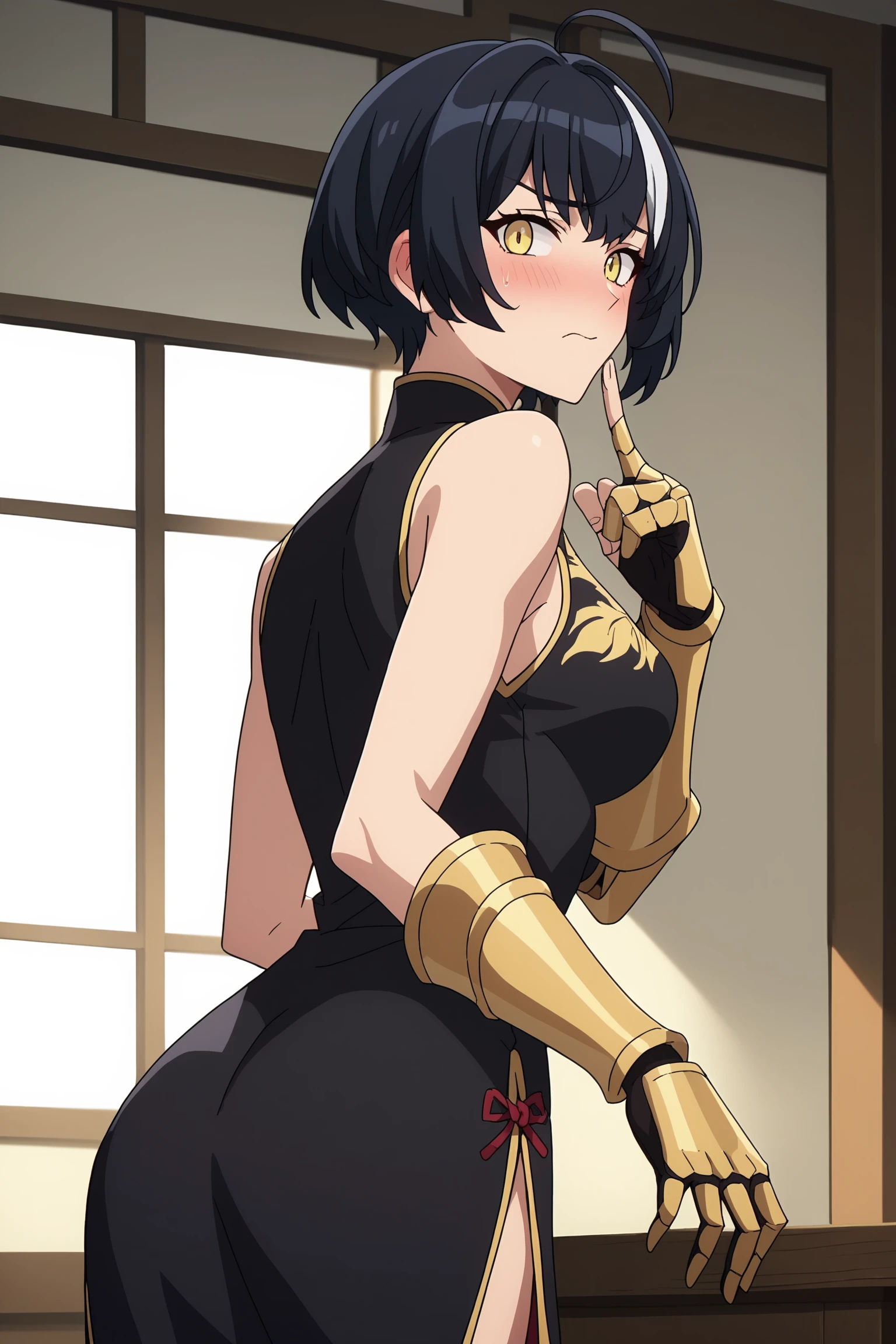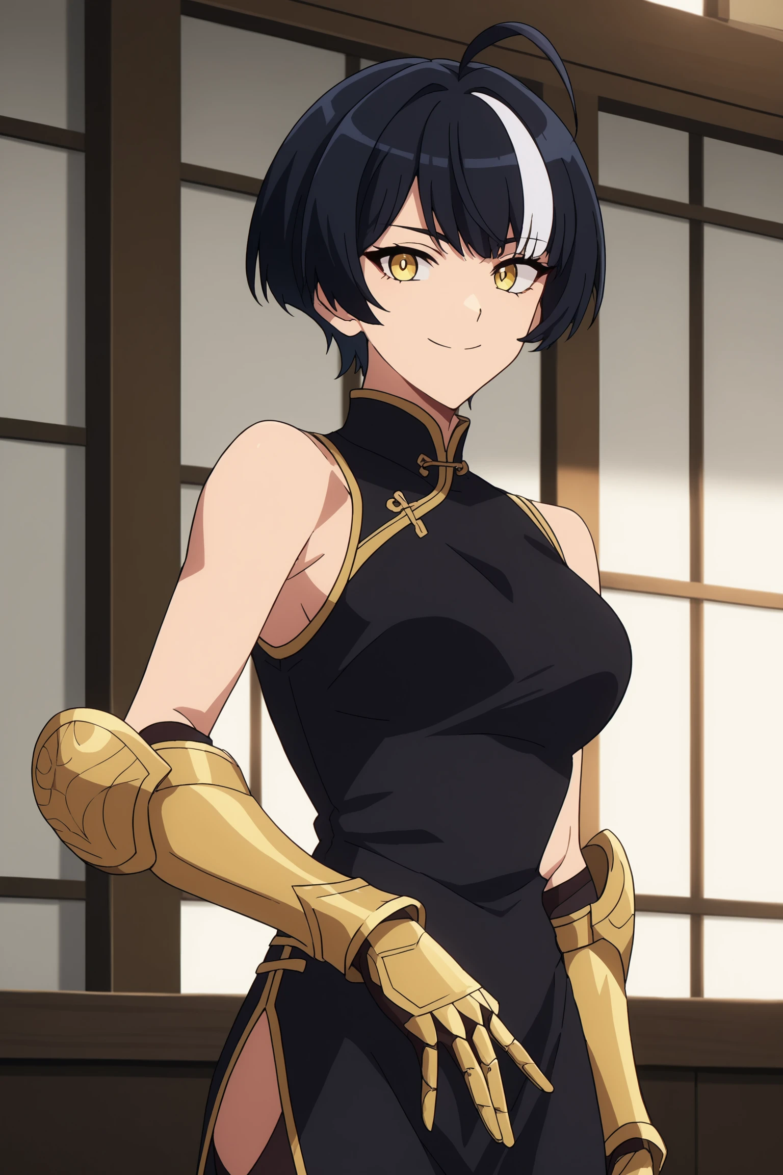 1girl, solo, short hair, bangs, black hair, yellow eyes, ahoge, seo_jiwoo