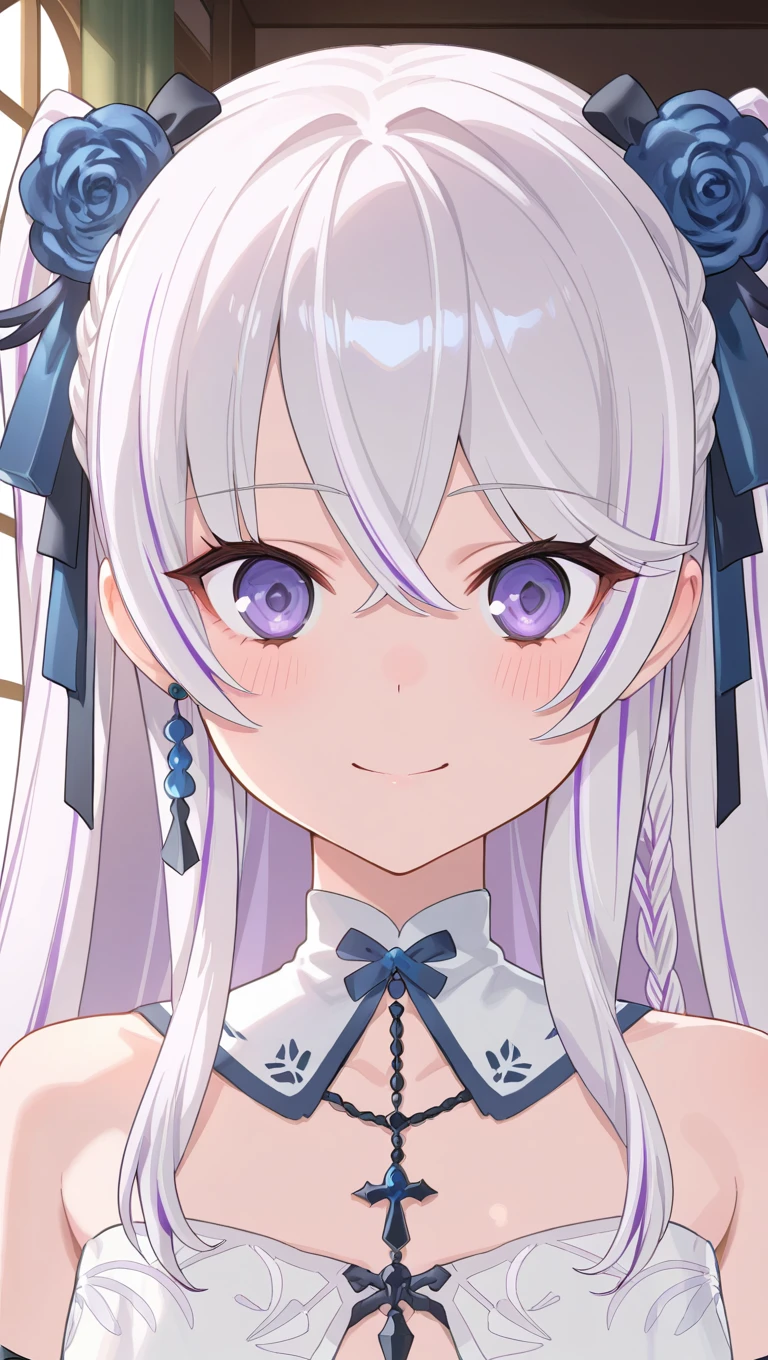 long hair,white hair,multicolored hair,streaked hair,purple hair,two side up,braid,hair ribbon,hair ornament,hair flower,blue rose,jewelry,earrings,sidelocks,hair between eyes,purple eyes