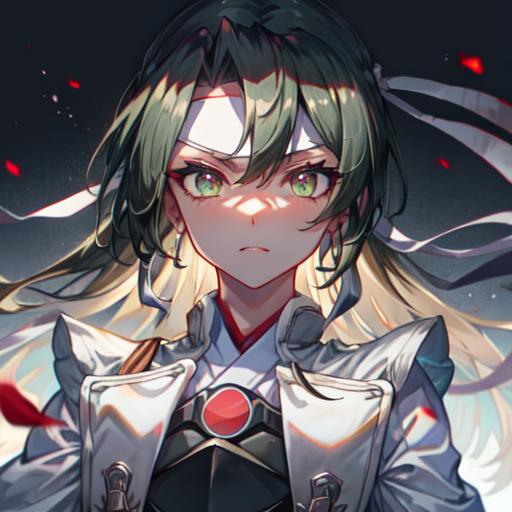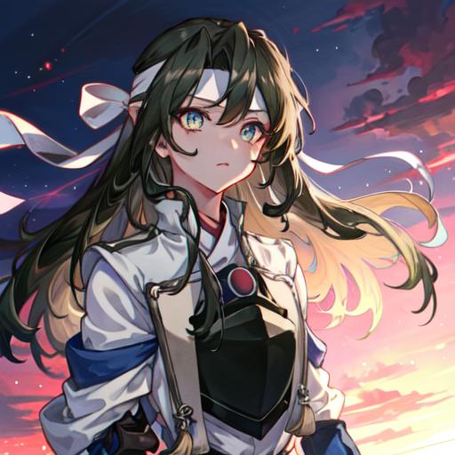 -hair down, white headband, hachimaki, breastplateDescription