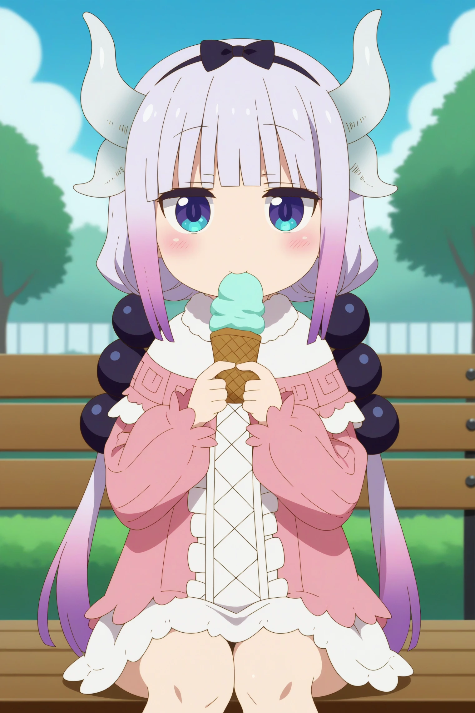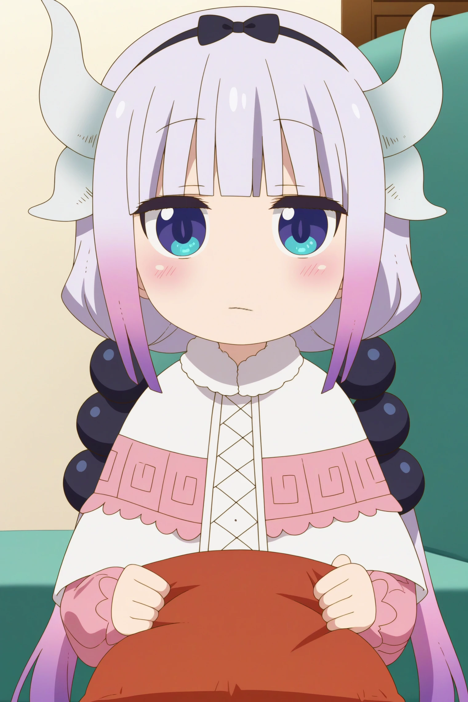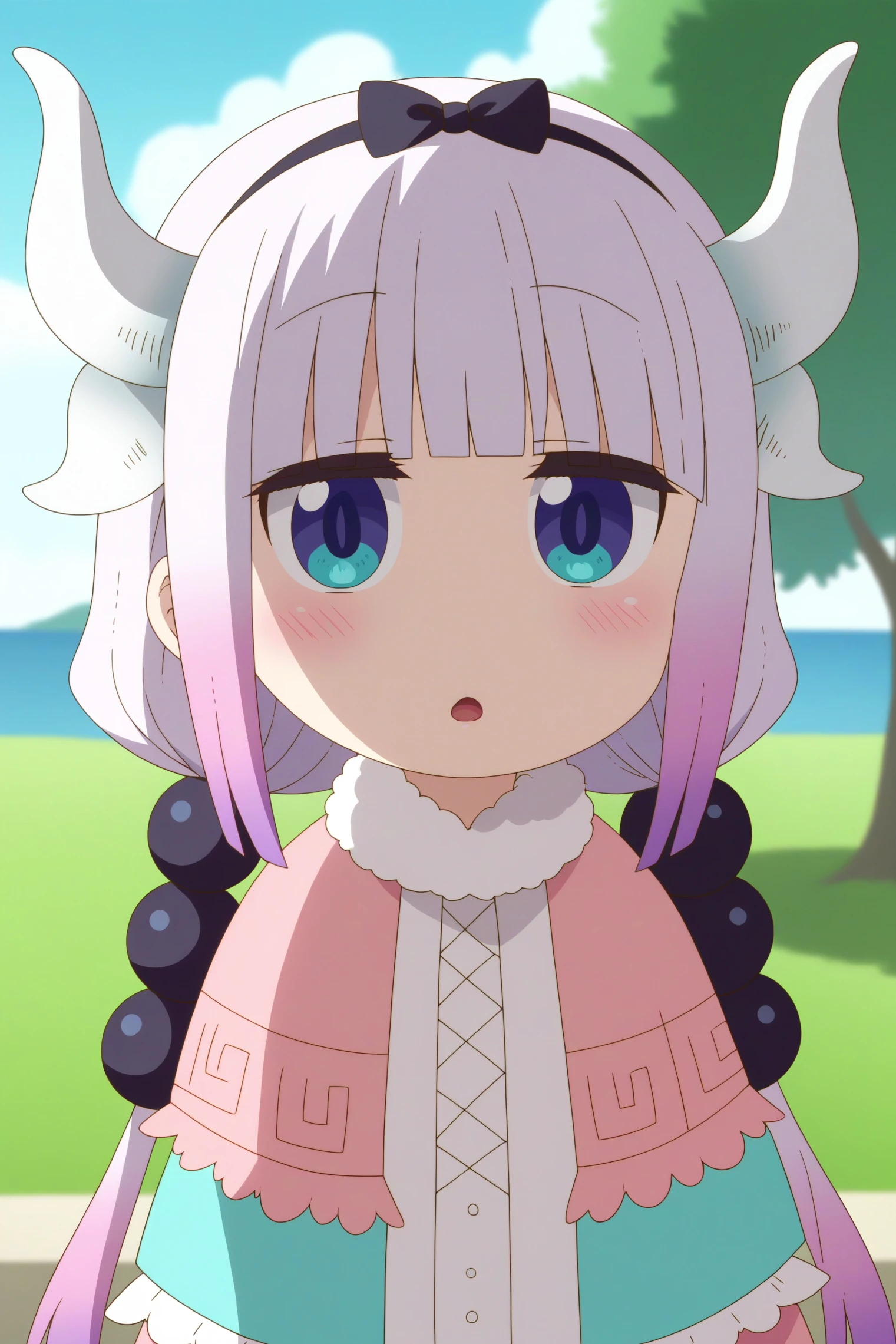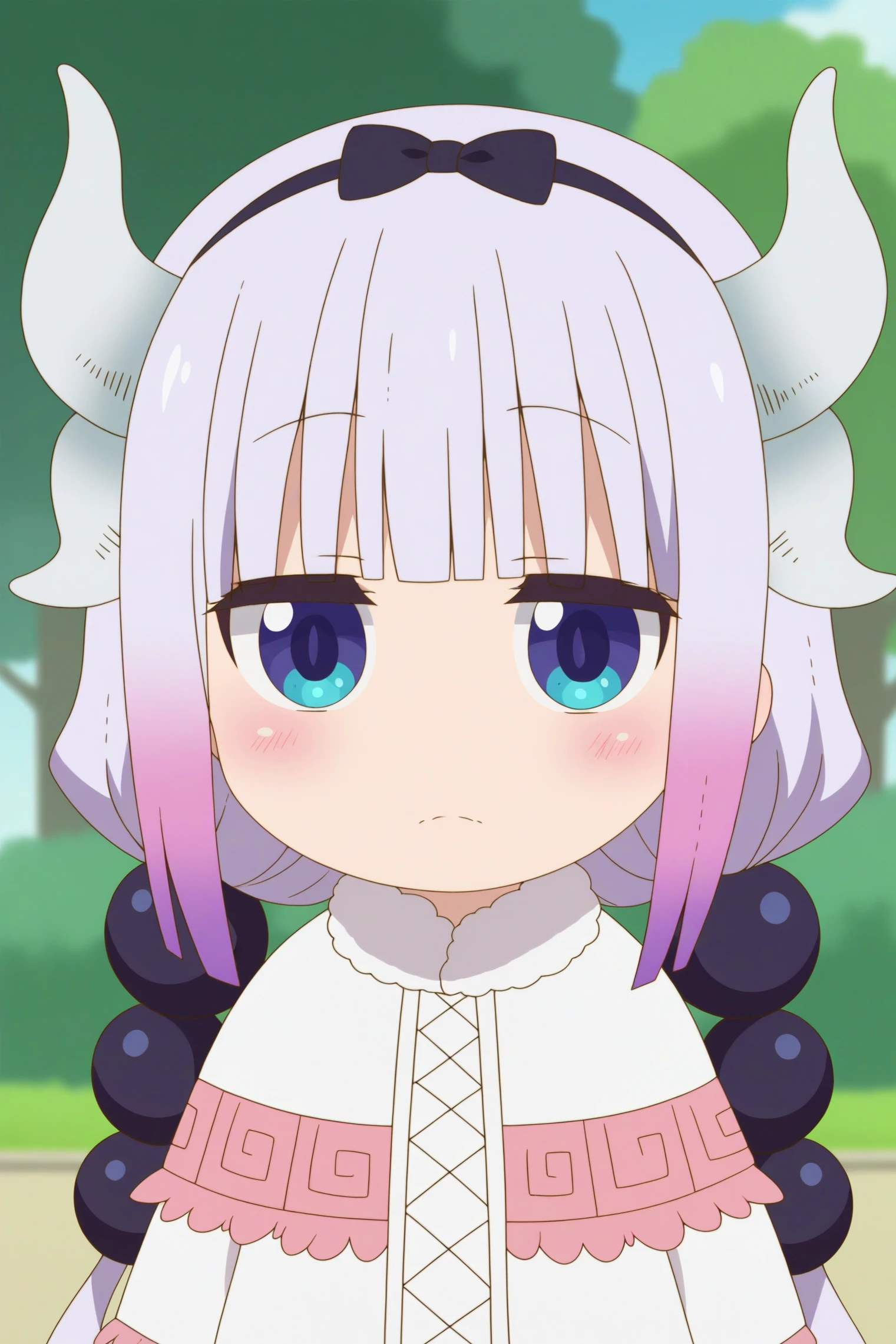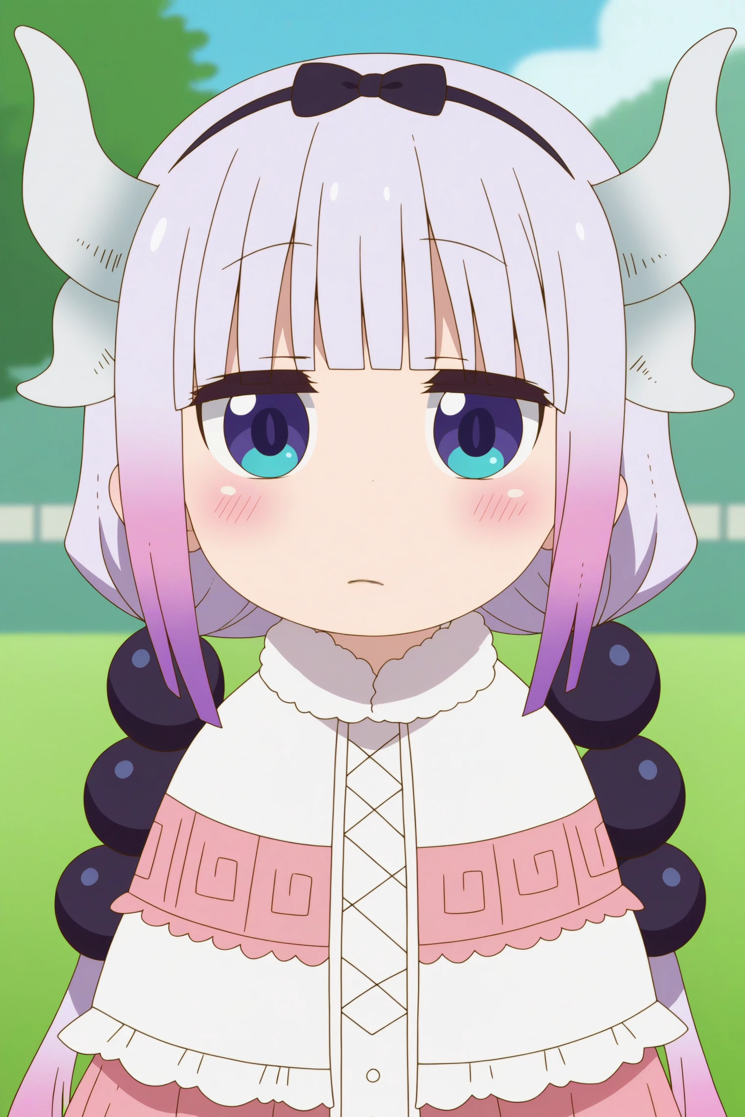 Triggers : 1girl,solo,kanna kamui,hair ornament,light purple hair,twintails,hair breads,long hair,hair band,blunt bangs,blush,dragon horns ,capelet