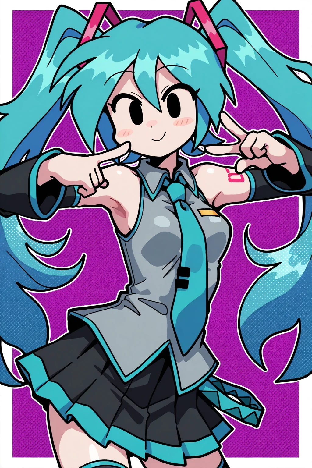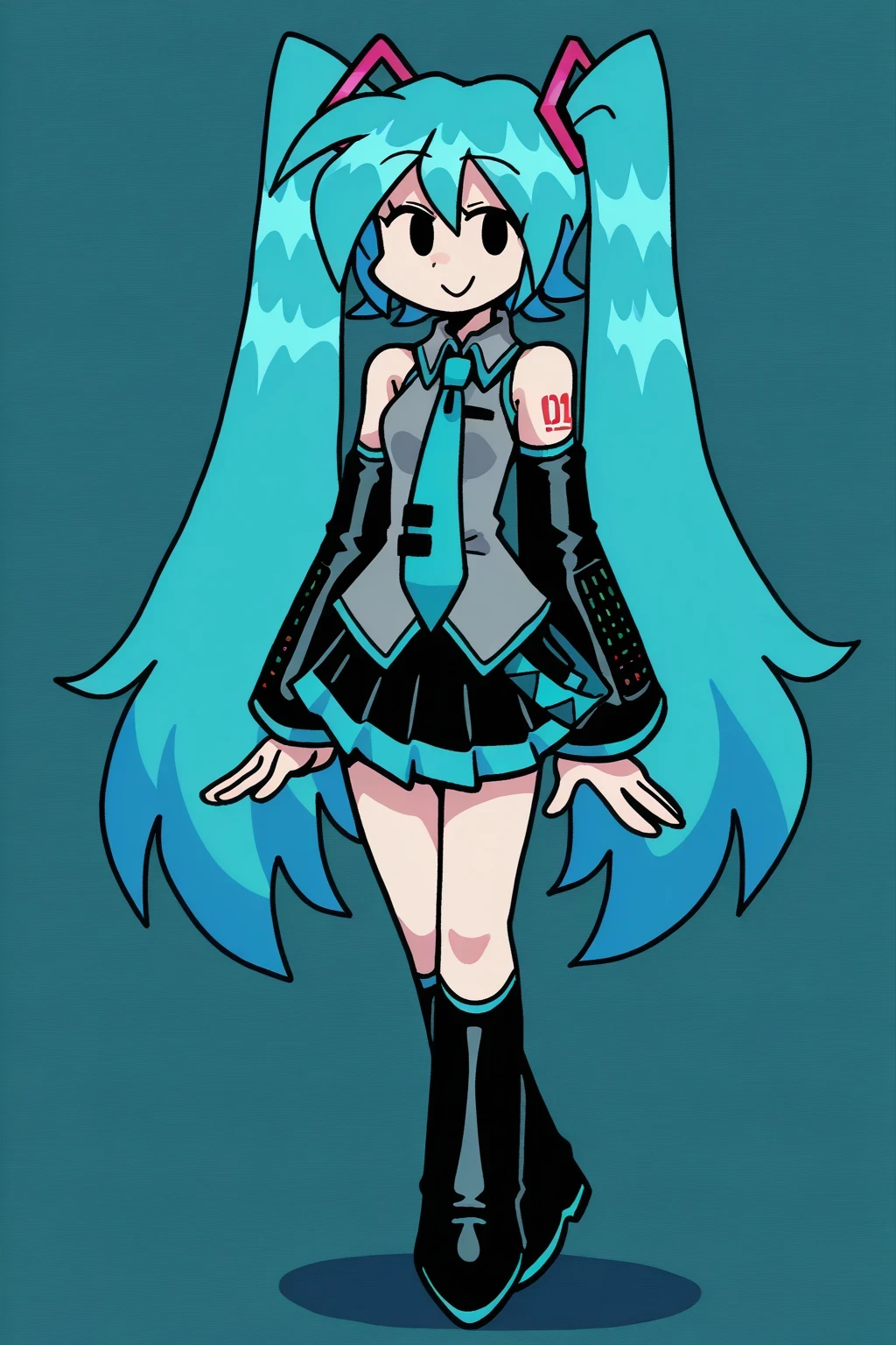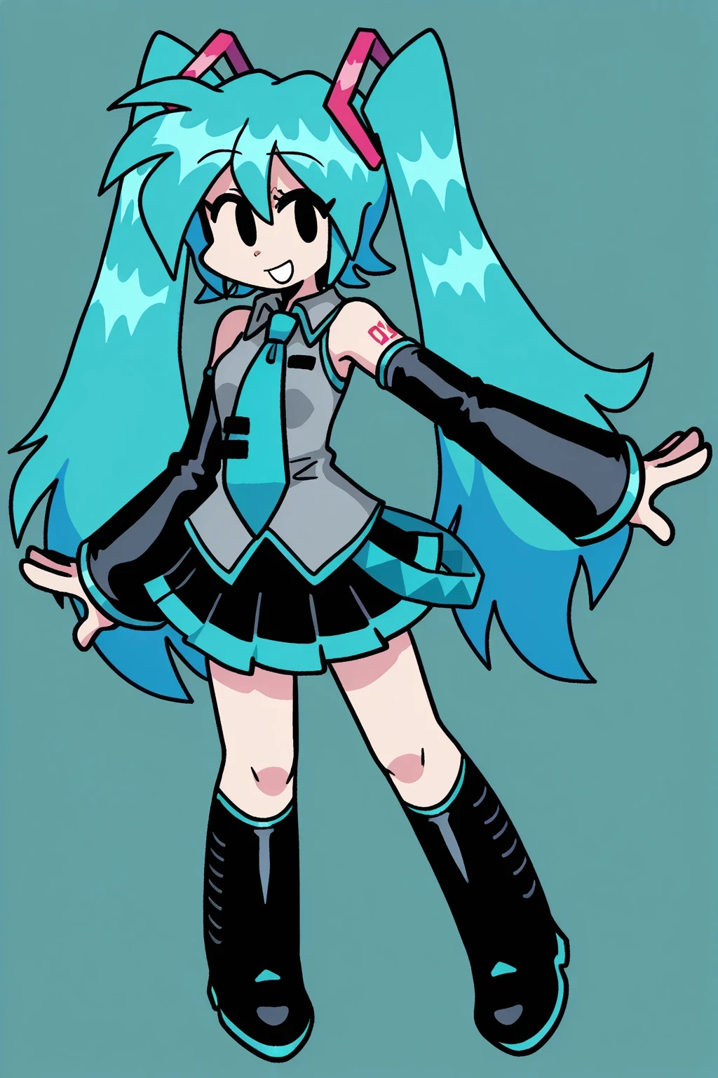 HatsuneMi1kuFNF, 1girl, cyan hair, pink hair bands, black eyes, no sclera, black sleeves with cyan trims, sleeveless gray suit, cyan neck tie, black pleated skirt with a cyan trim, black-cyan boots, hatsune miku,