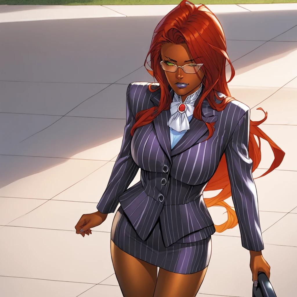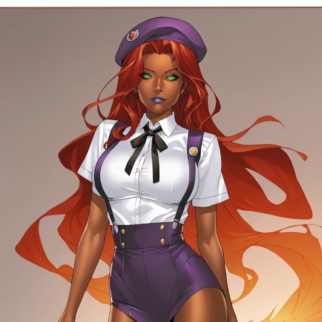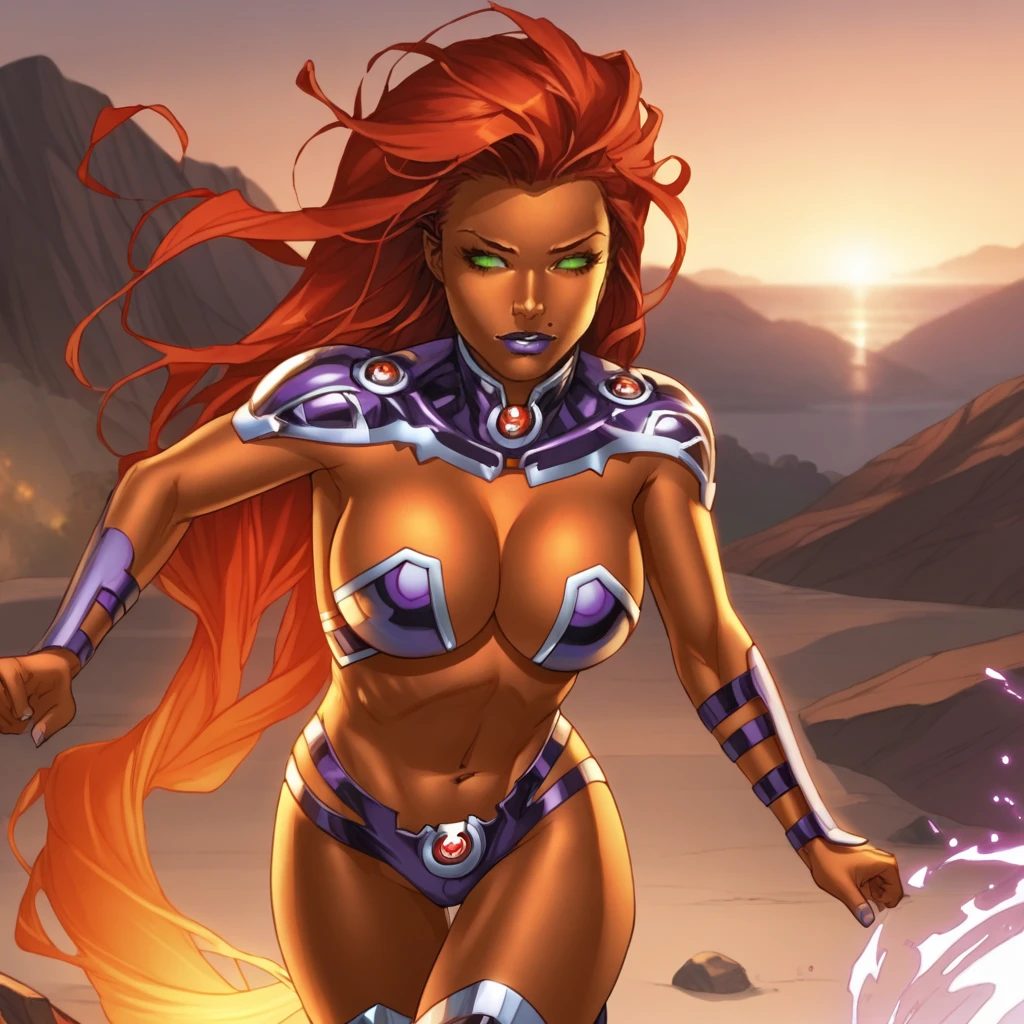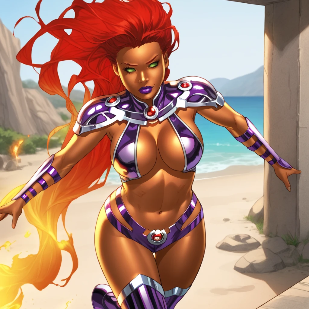 Trigger with costume: Starfire52Costume, large breasts, 1girl, dark-skinned female, green eyes, long hair, dark skin, thighhighs, navel, armor, red hair, vambraces, cleavage, purple footwear, lipstick, bracer, makeup