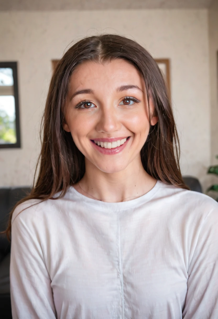 "prompt": "score_9, score_8_up, score_7_up, photo realistic, true to life, highly detailed. solo. 1girl, mayawoulfe, brown hair, long straight hair. brown eyes, very skinny, thin waist, face focus, smile, lips parted, looking away from viewer, headshot, wearing a long sleeve shirt, jeans, jewlery, in a living room",