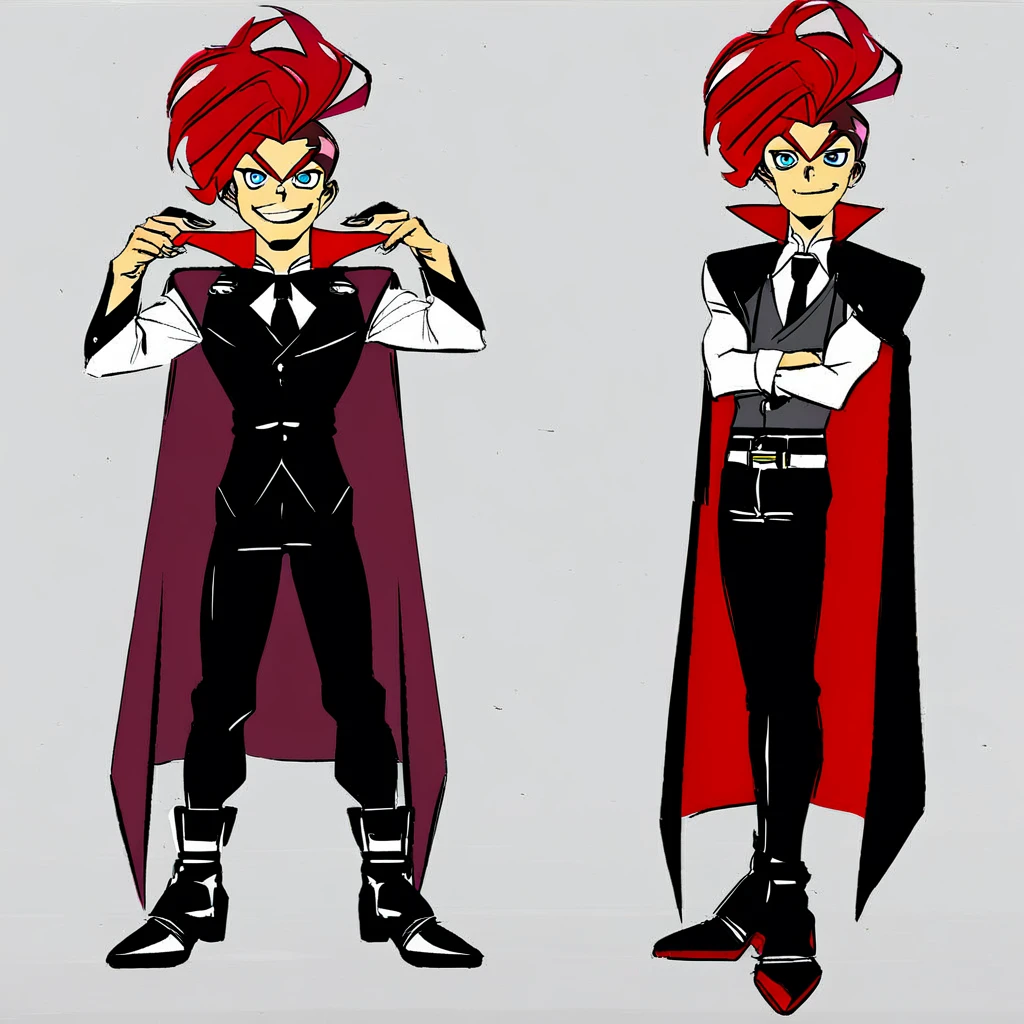Outfit 1 (goth): goth,cape,shirt,vest,necktie,jewelry,belt,pants,shoes [+alt trigger words: suit, jacket,gloves,boots)