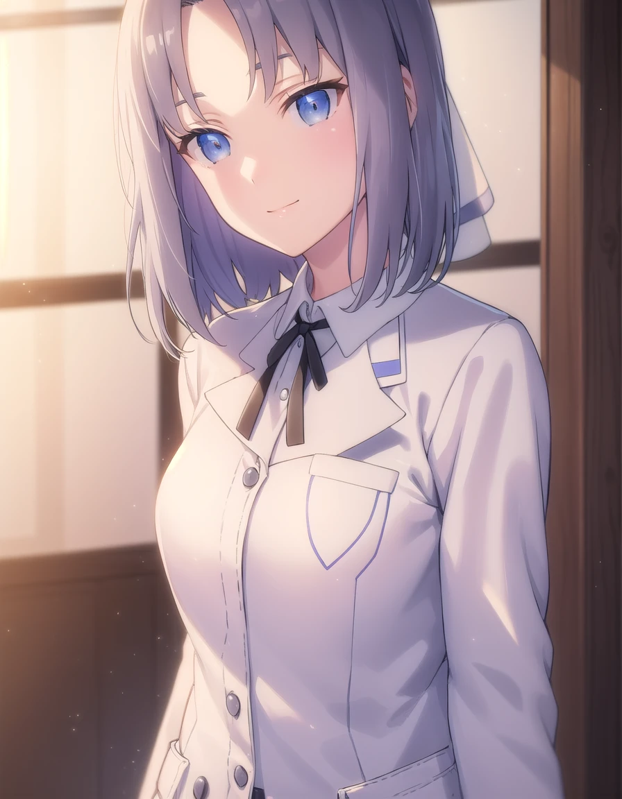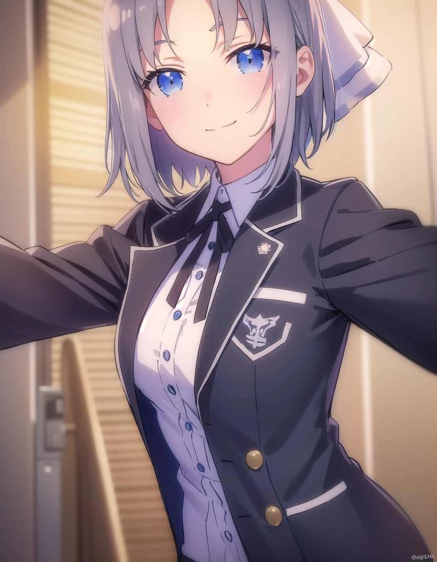 yumi, short hair, blue eyes, grey hair, hair bow, (parted bangs:1.5),