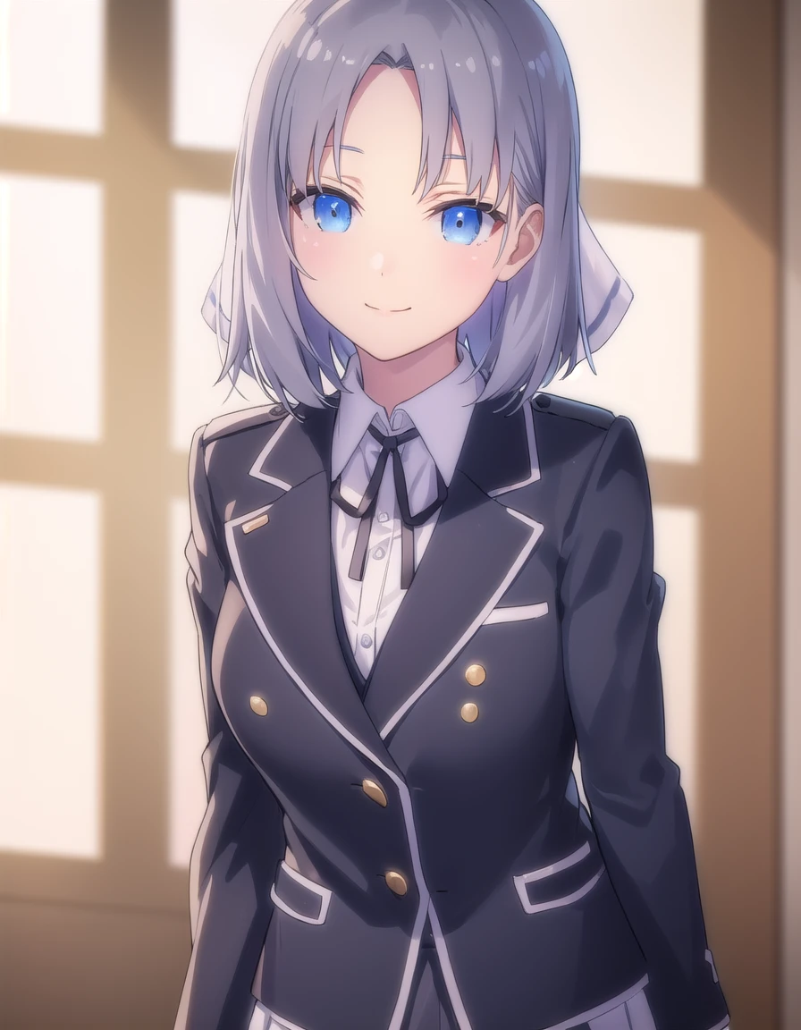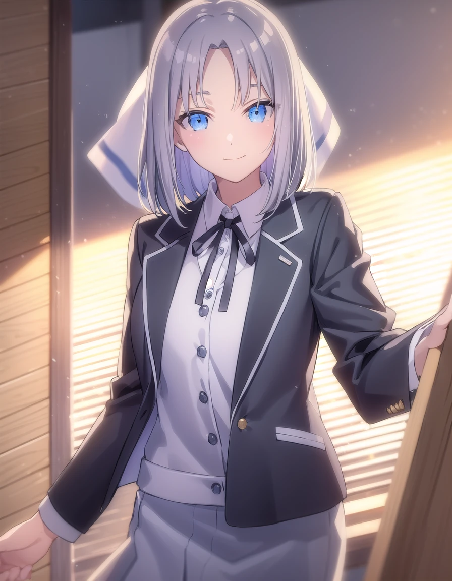 shirt, long sleeves, ribbon, school uniform, jacket, white shirt, black ribbon, neck ribbon, buttons, grey jacket,