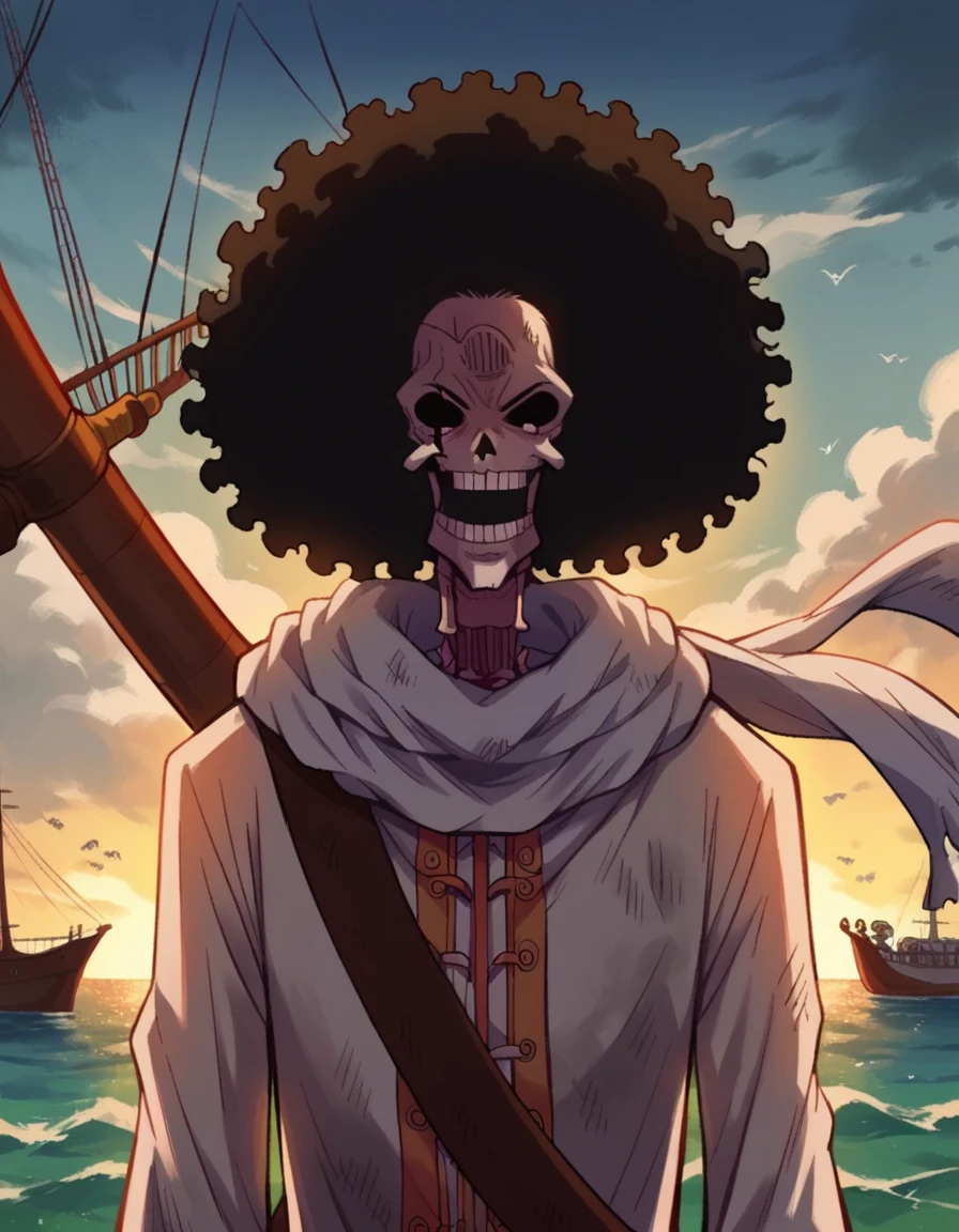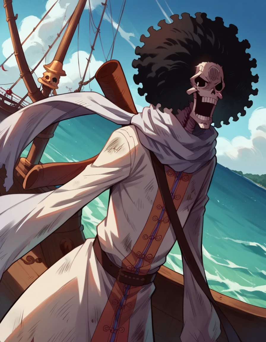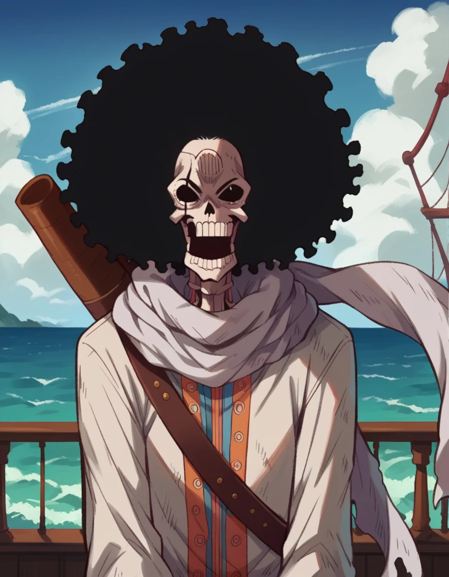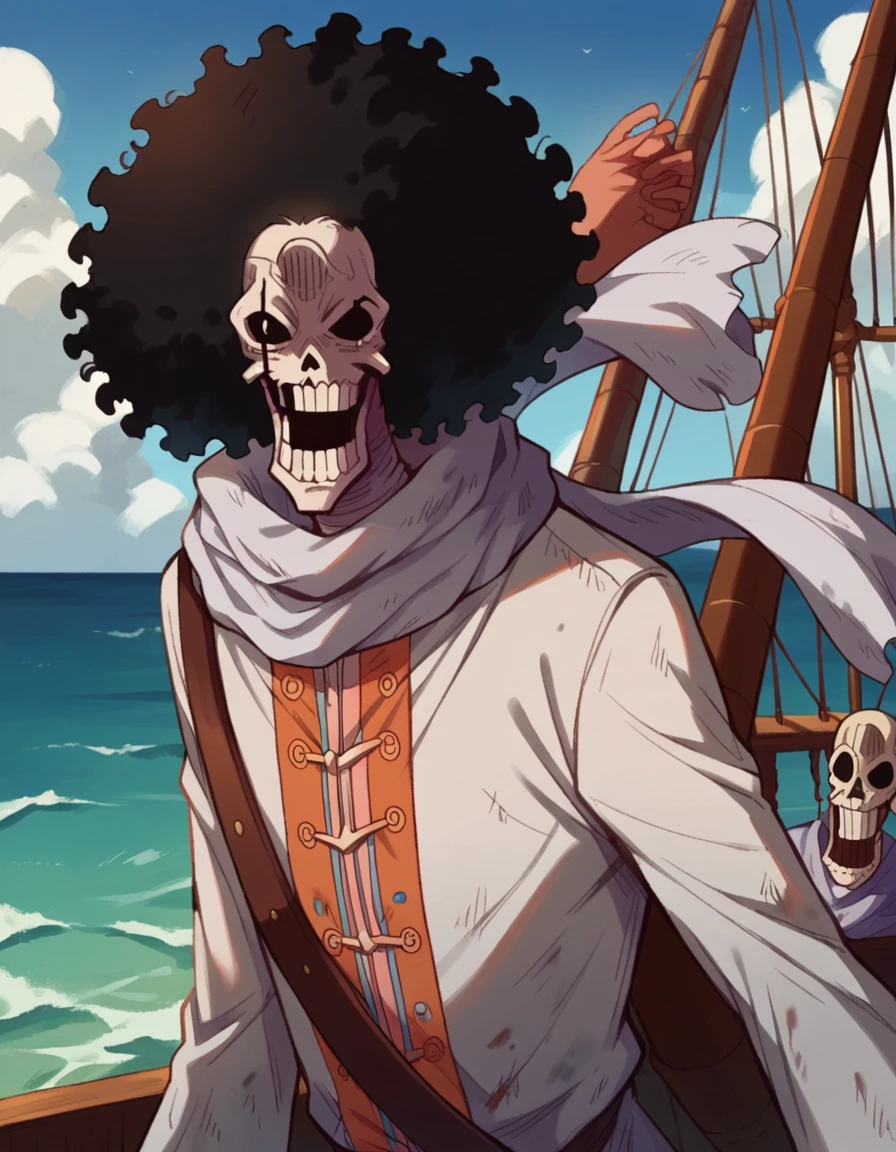 brook, black hair, male focus, skull, afro, undead, skeleton,