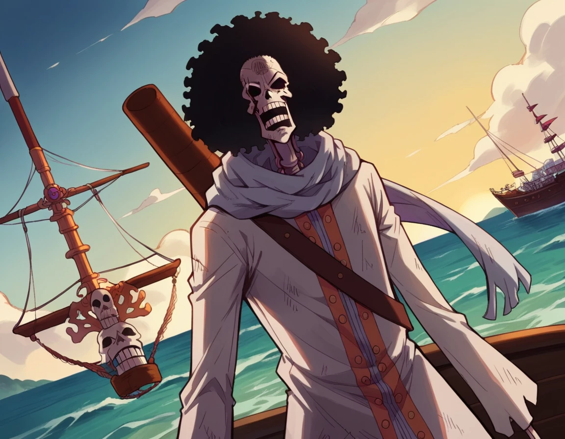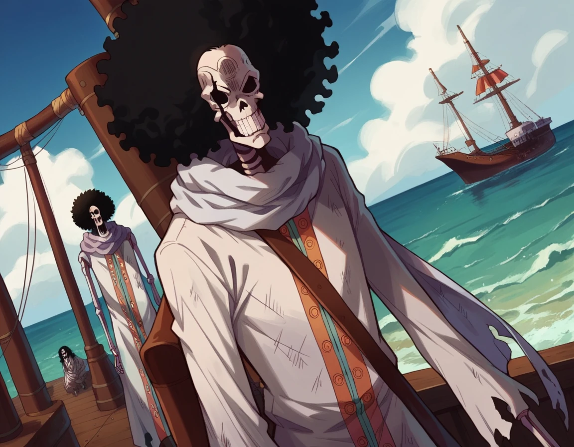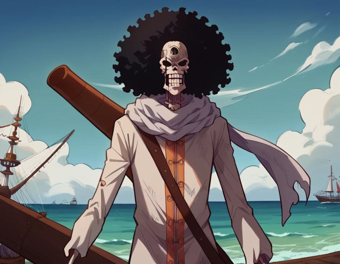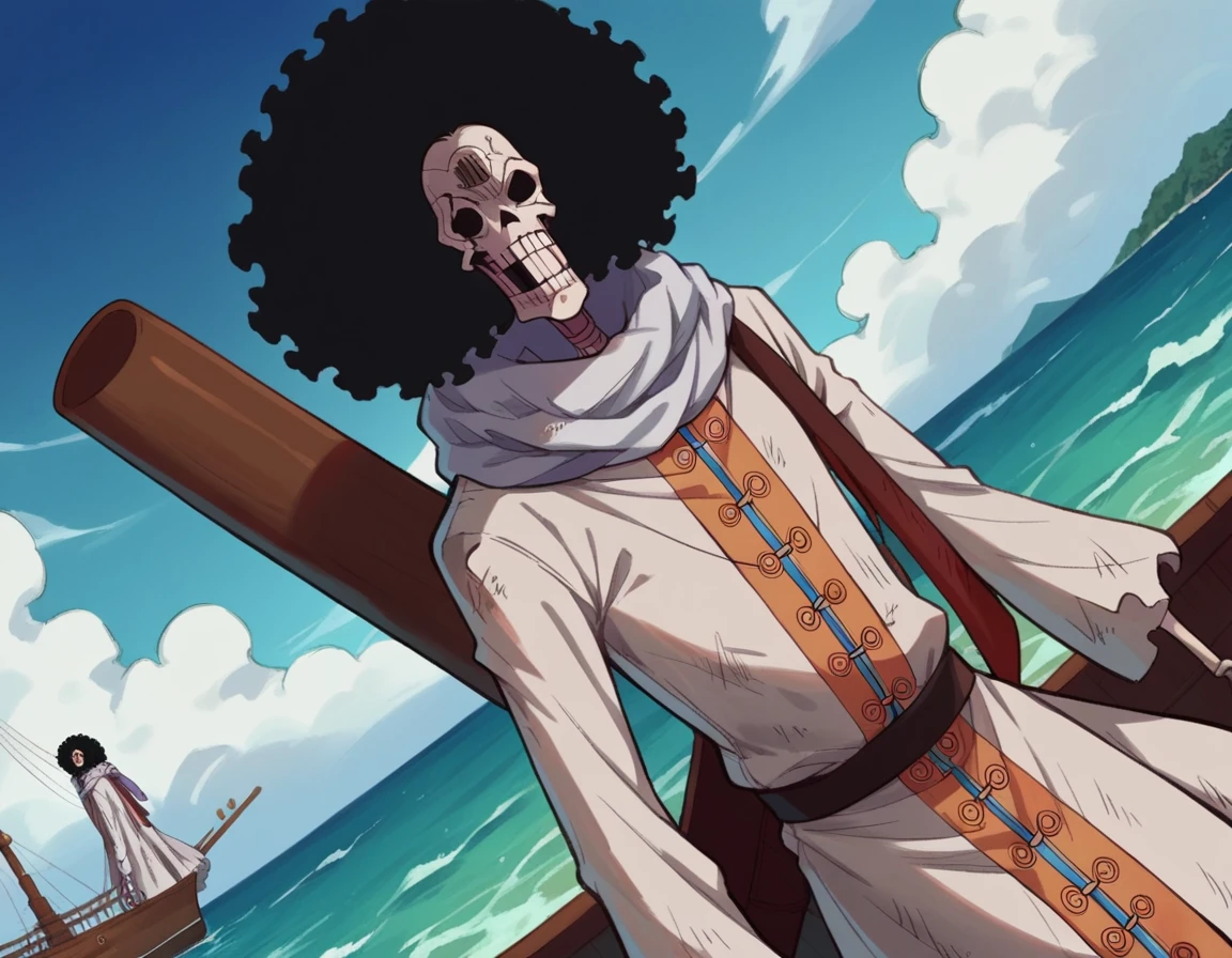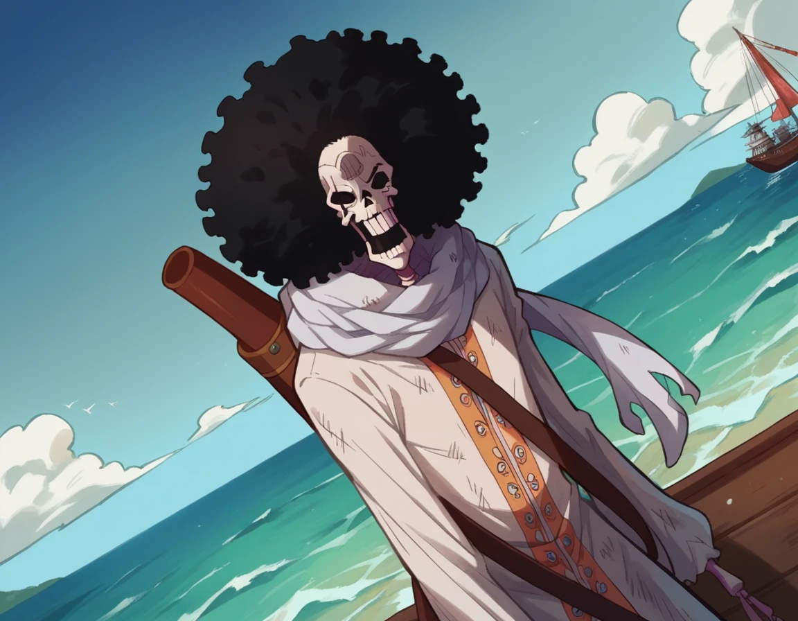 brook, black hair, male focus, skull, afro, undead, skeleton,