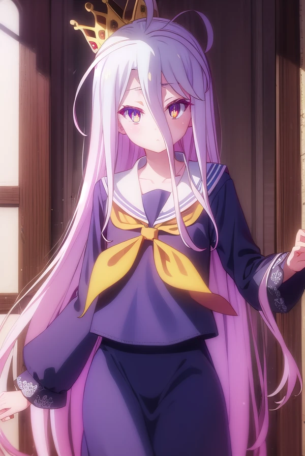 crown, shirt, long sleeves, school uniform, serafuku, sailor collar, neckerchief, white sailor collar, yellow neckerchief,
