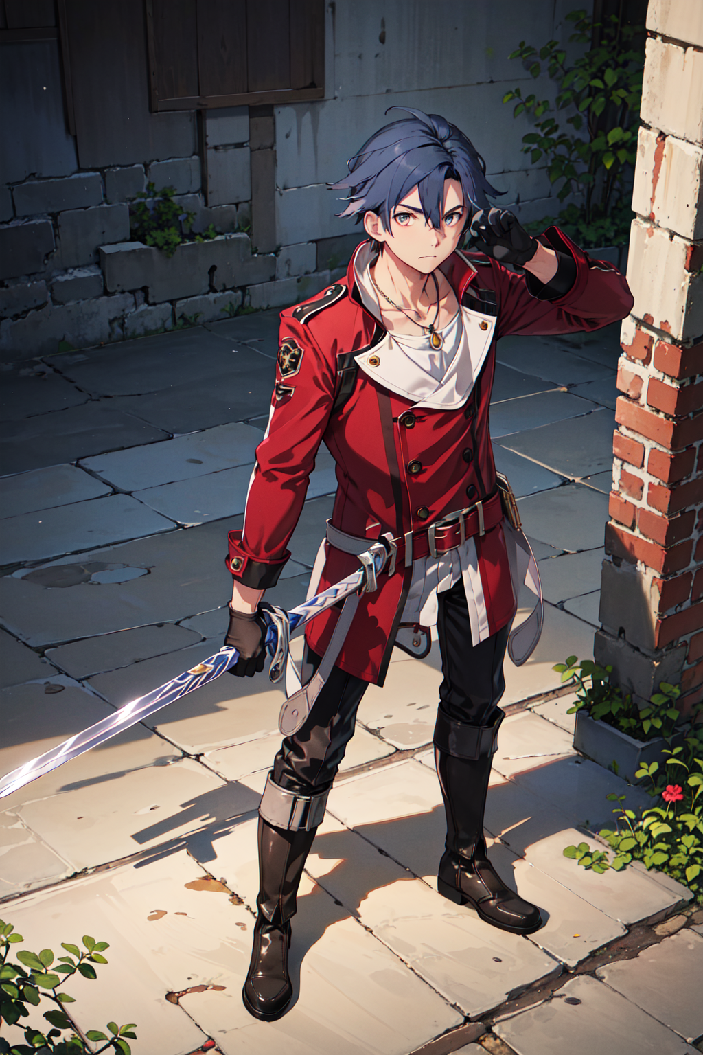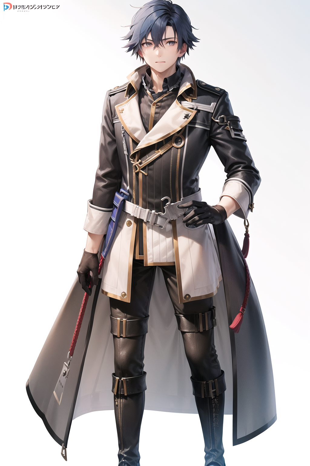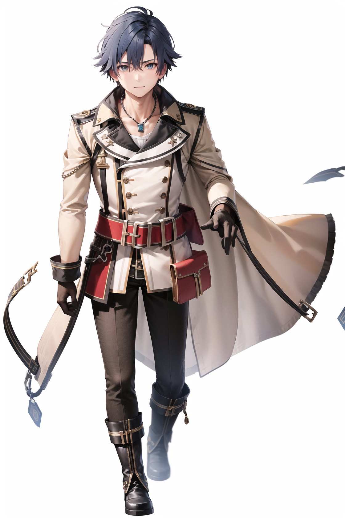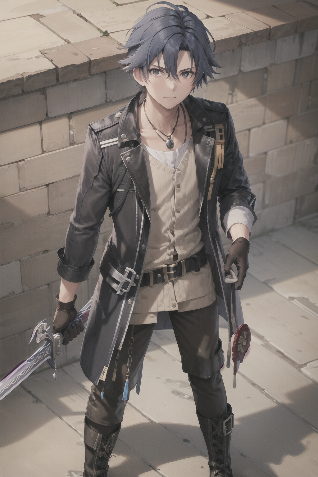 For trigger pictures like preview,use rean schwarzer, 1boy, weapon, solo, gloves, male focus, sword, boots, black gloves, full body, coat, sheath, belt, pants, knee boots, standing, necklace, jewelry, blue hair, black pants, sheathed, brown footwear, shirt, looking at viewer, clenched hand, black hair.