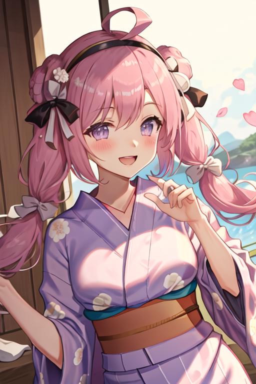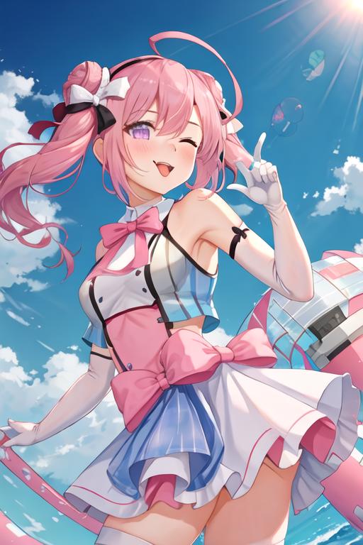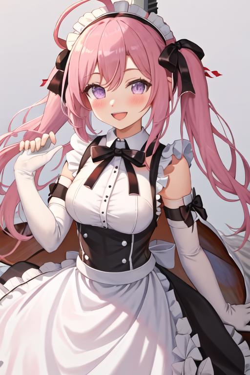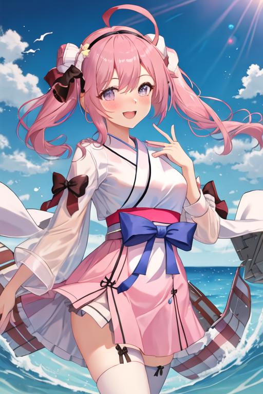 The trigger word is saratoga_azurlane, and the recommended tags are best quality, masterpiece, highres, solo, {saratoga_azurlane:1.15}, pink_hair, purple_eyes, ahoge, blush, smile, twintails, ribbon, bangs, bow, long_hair, hairband, open_mouth, hair_ribbon, breasts, hair_between_eyes, hair_bow.
